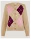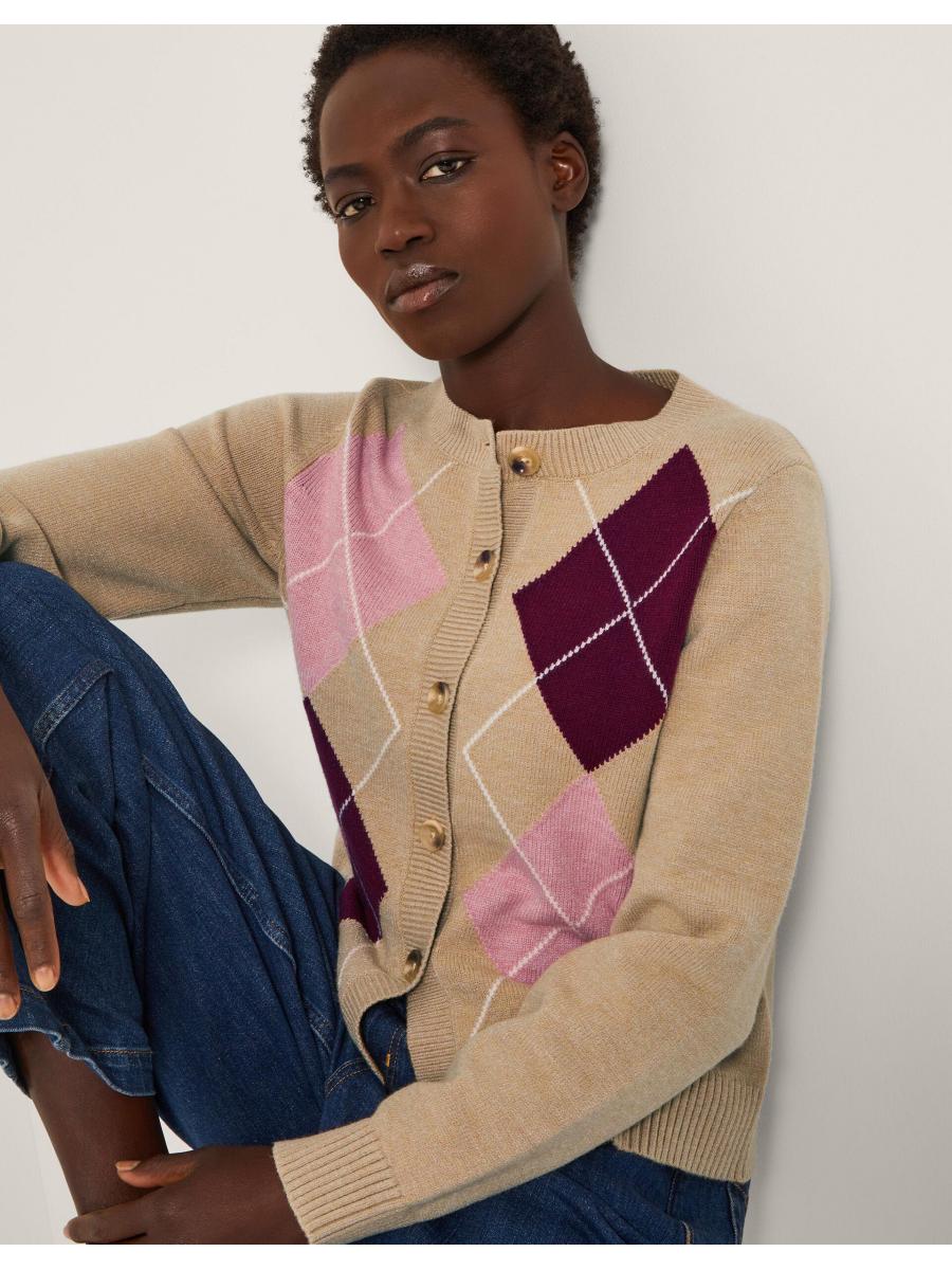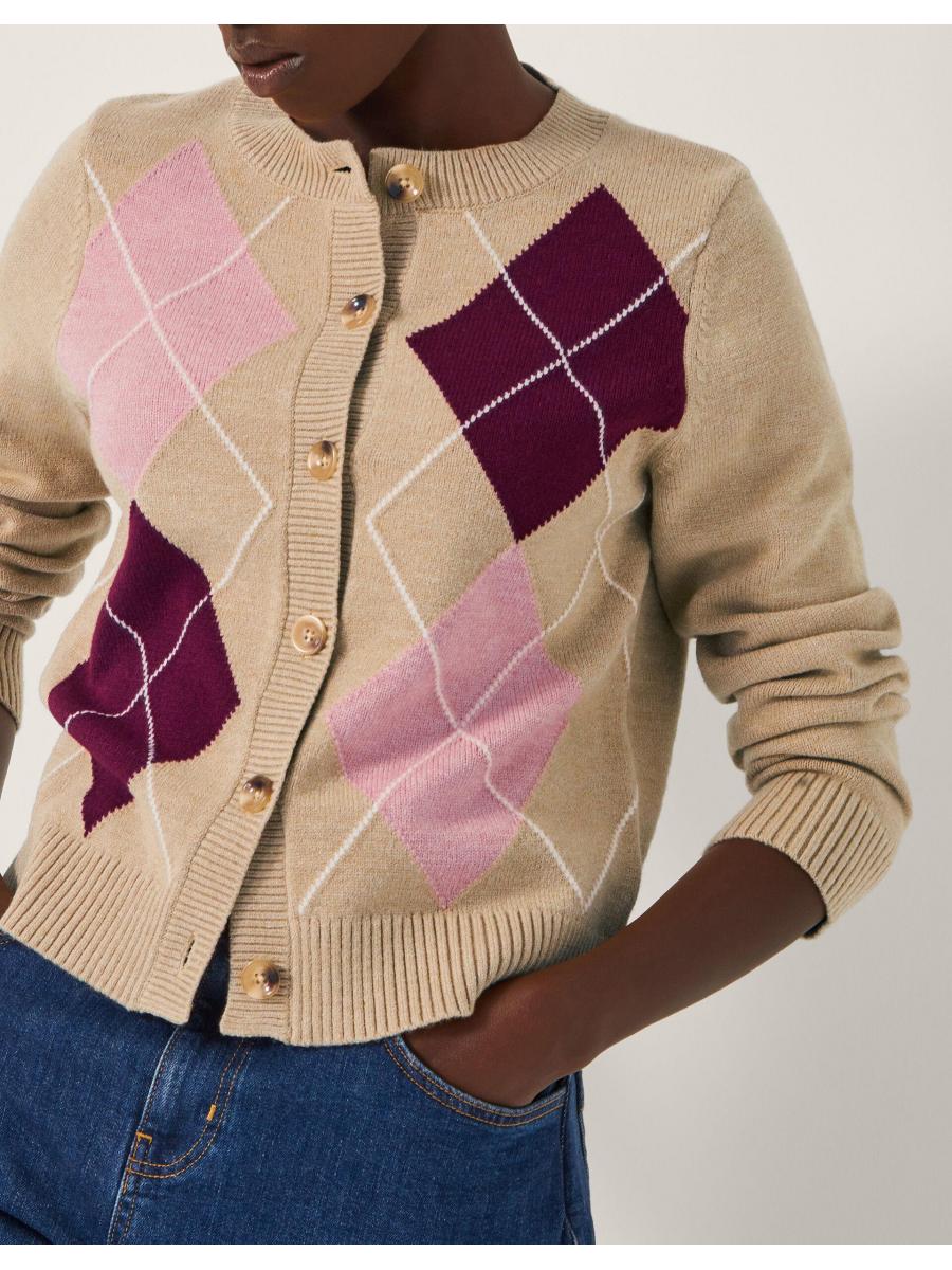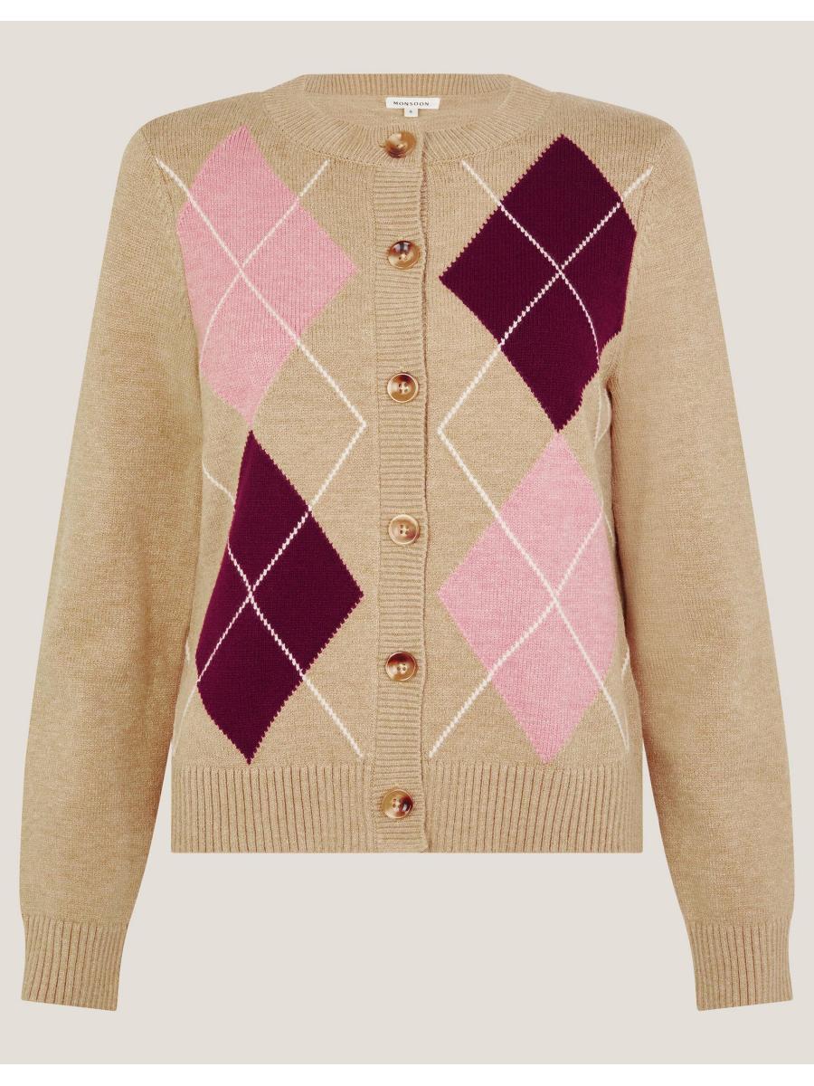 Vintage chic. Designed in a classic argyle print, this knitted cardigan features ribbed trims and front button fastenings. Looks great paired with jeans! Camel