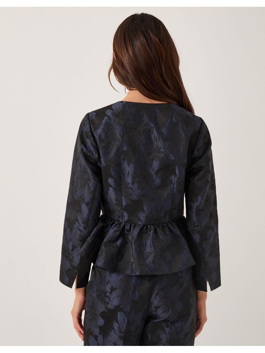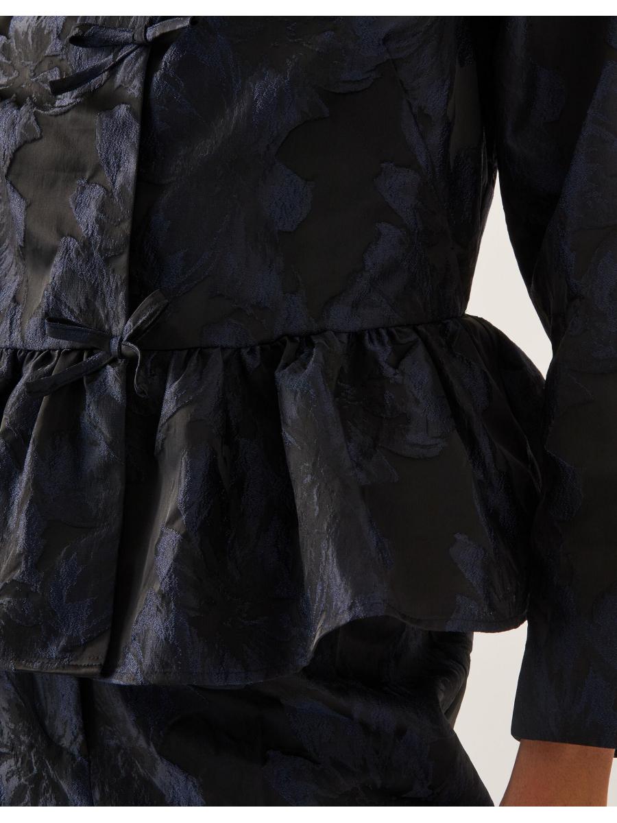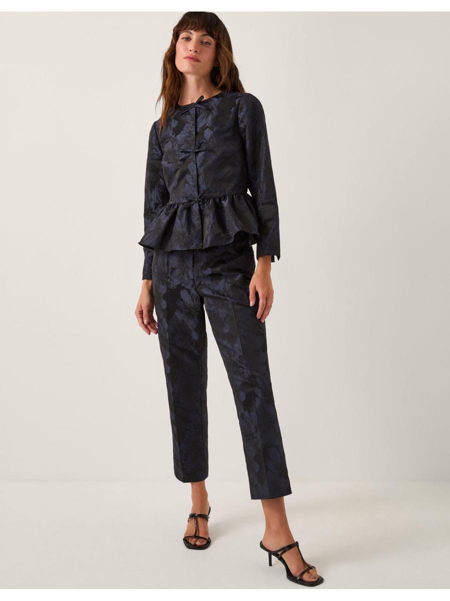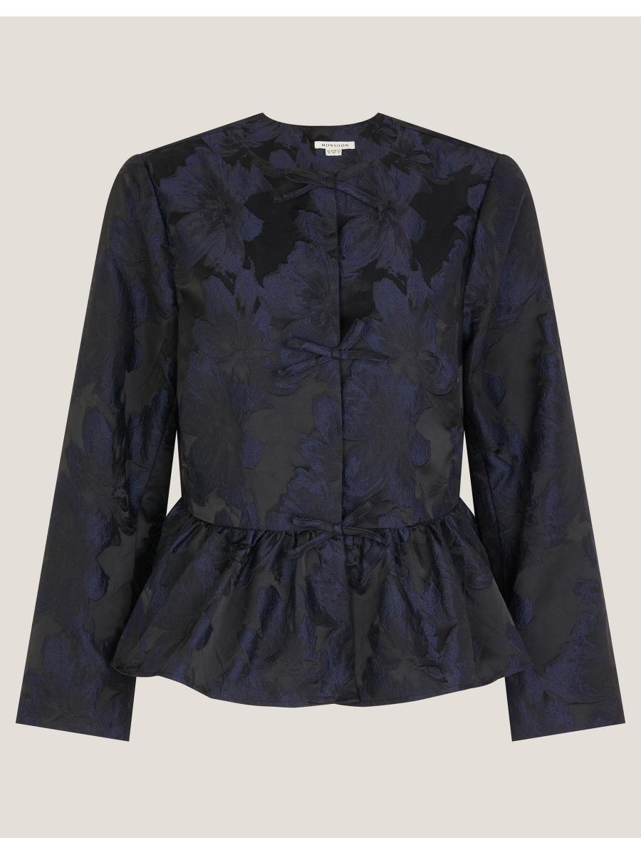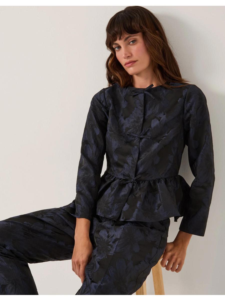 Jacq of all trades. If we're being honest, sometimes a jacket ruins the outfit, but with this one, it really makes it. Showcasing jacquard florals in shimmery midnight tones, it's finished with a frilly hemline and a trio of bows detailing the front? Wanna create a chic, co-ordinated look? Pair with the matching trousers. Blue