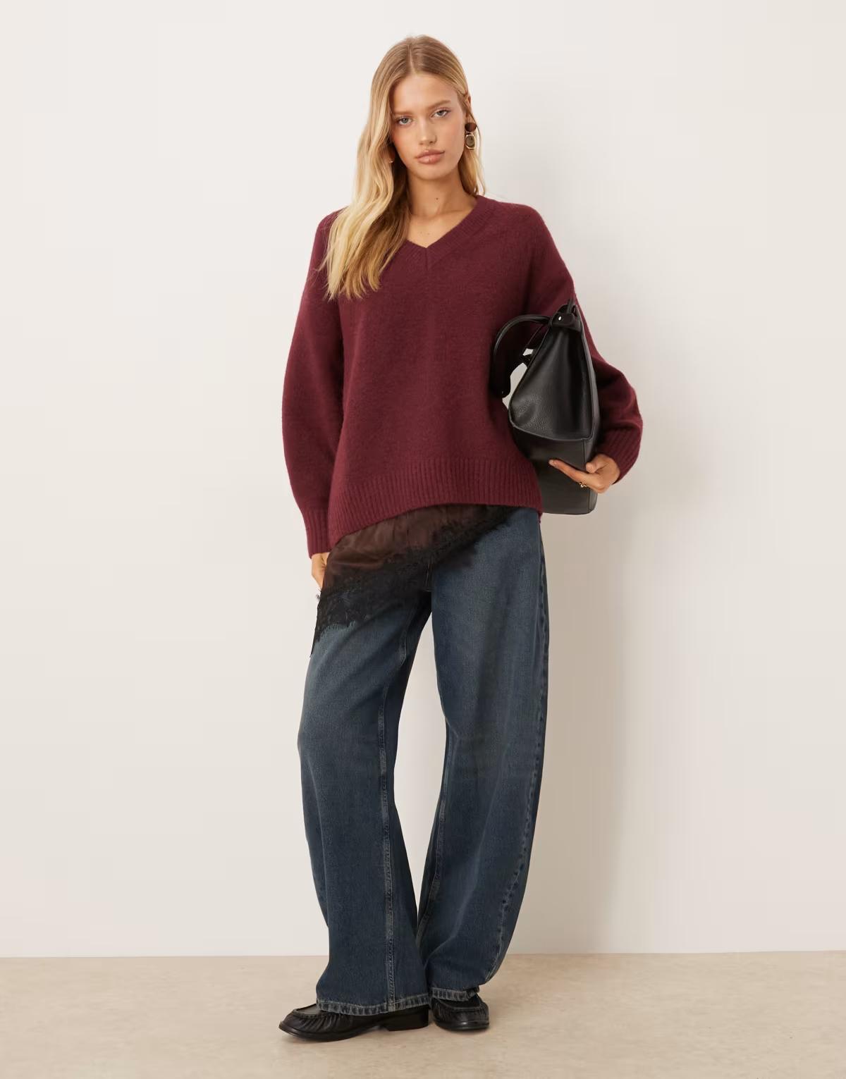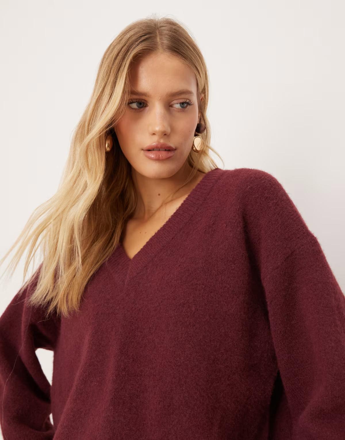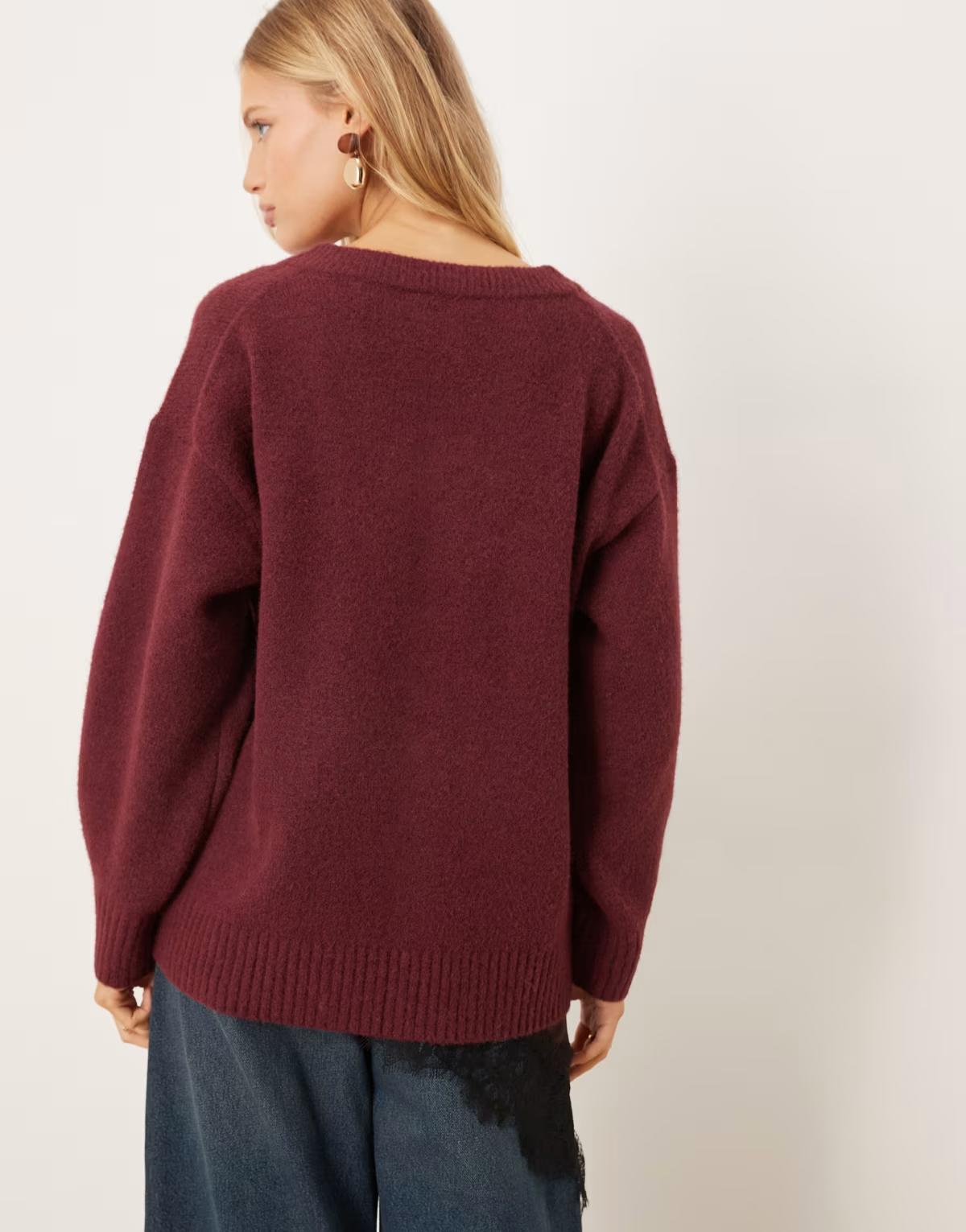 Abercrombie & Fitch knitted v neck oversized jumper in burgundy