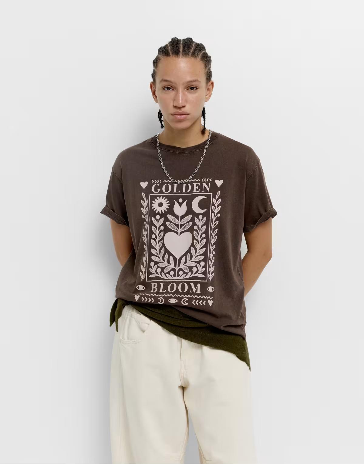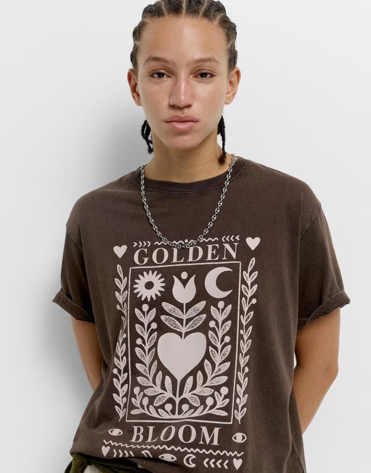 Pull&Bear Golden bloom graphic t-shirt in chocolate brown