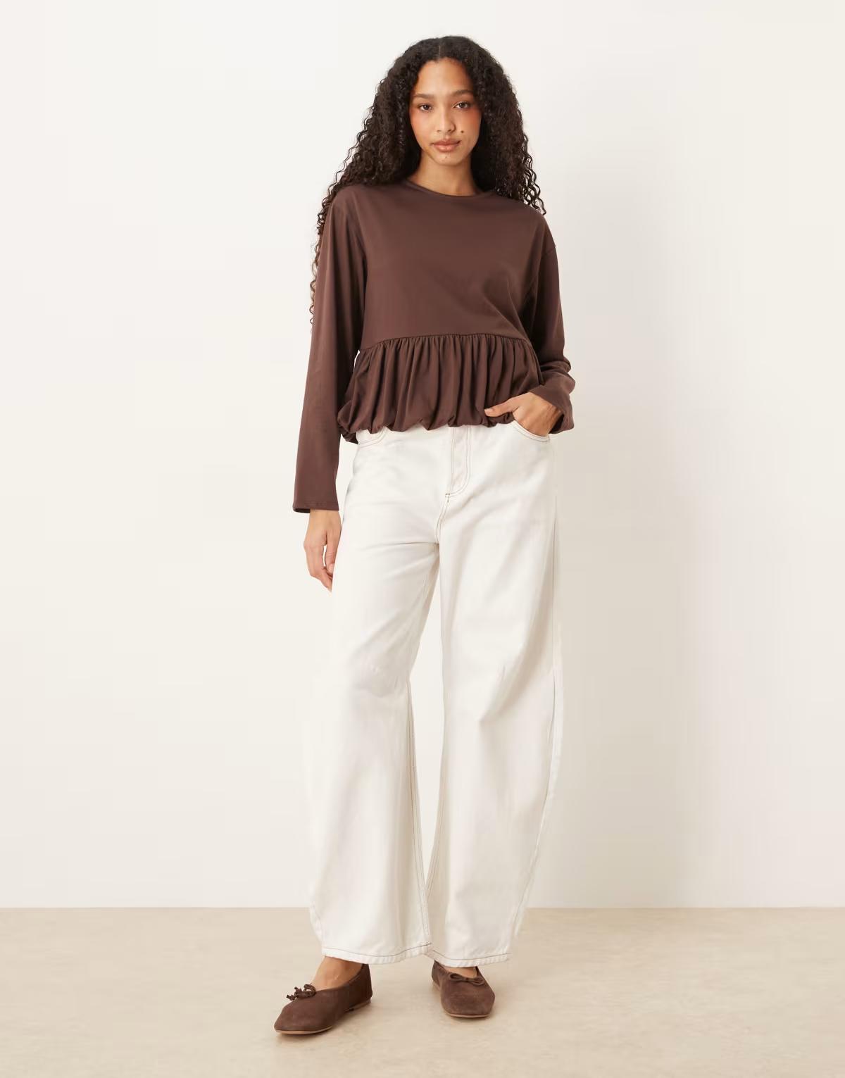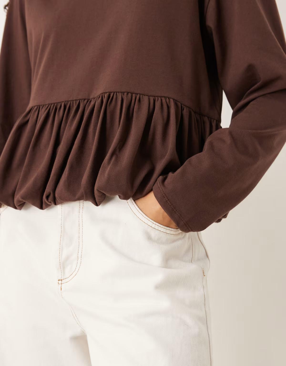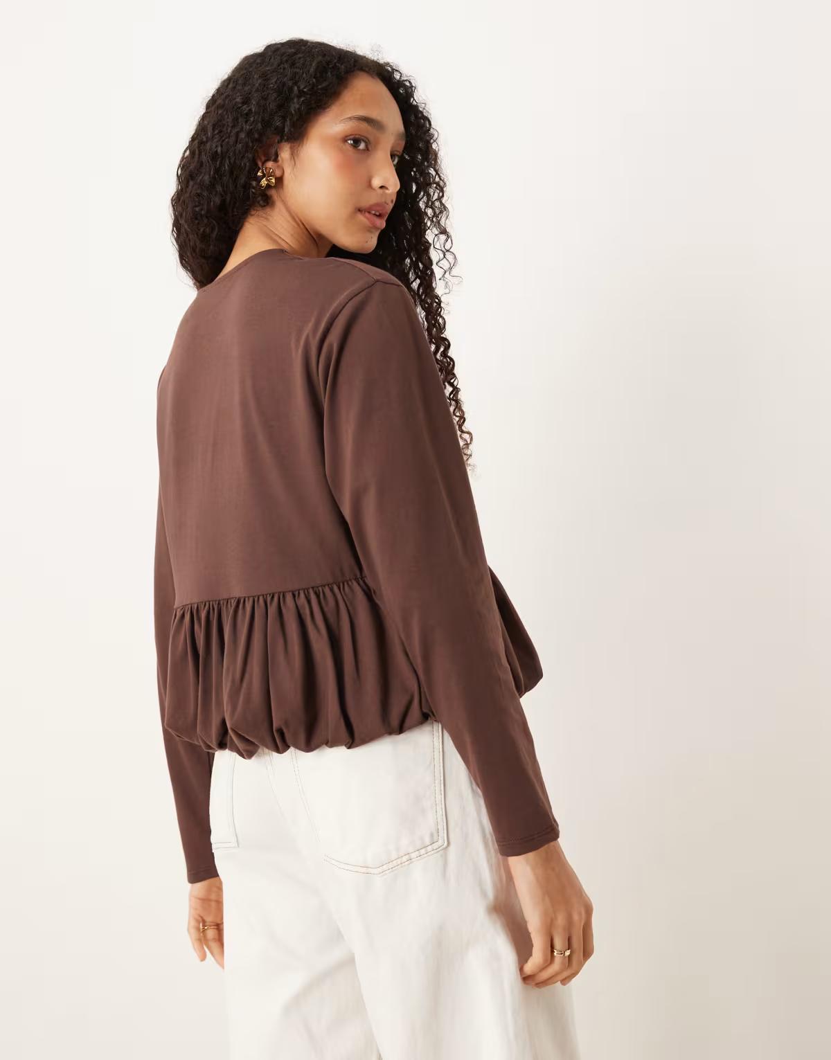 ASOS DESIGN bubble peplum hem long sleeve top in chocolate