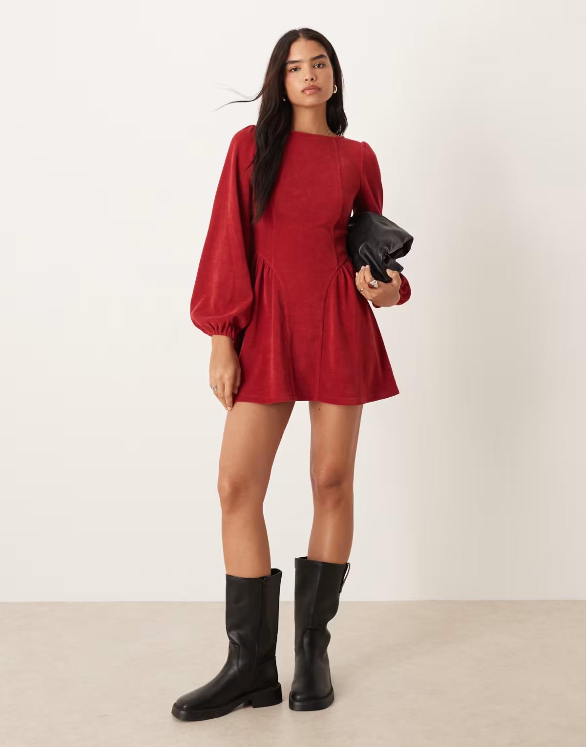 ASOS DESIGN cord blouson long sleeve waisted detail mini dress in cherry red