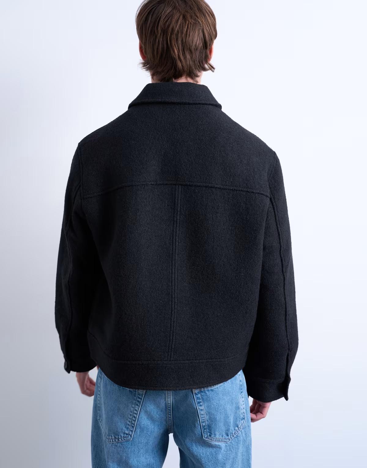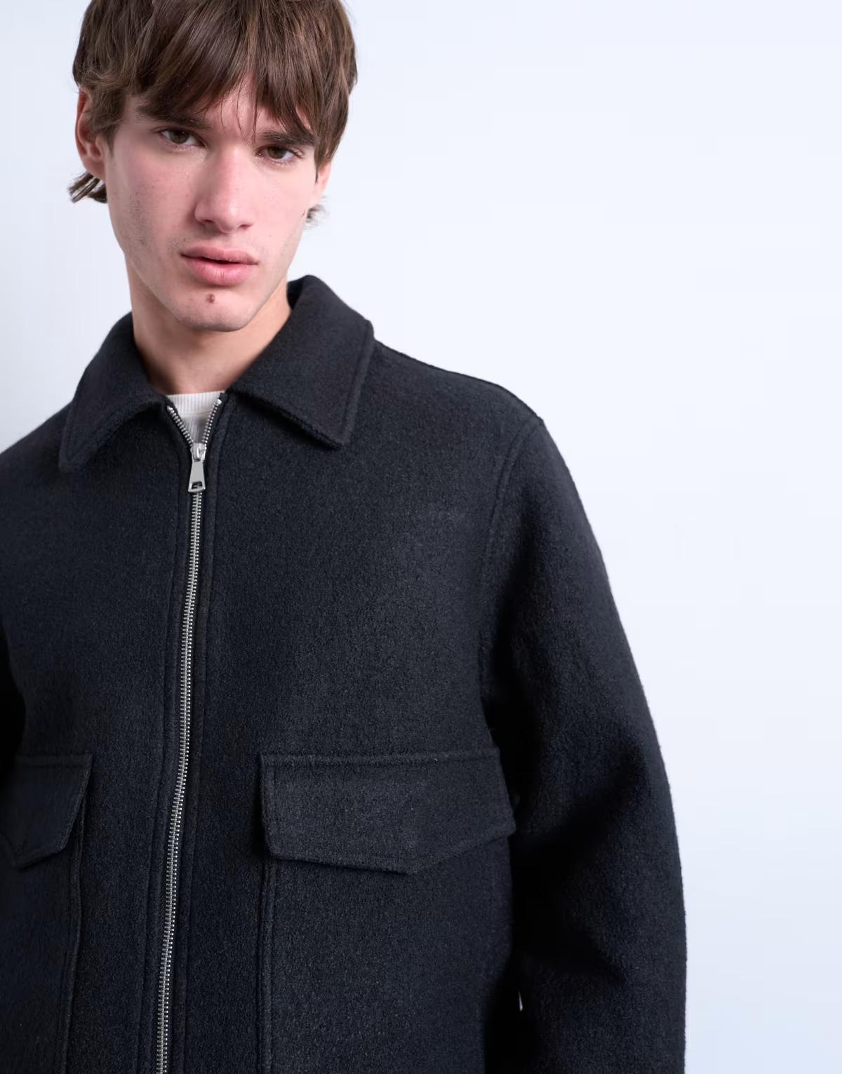 This shacket is crafted from a textured fabric. It features a spread collar, zip fastening and patch pockets.