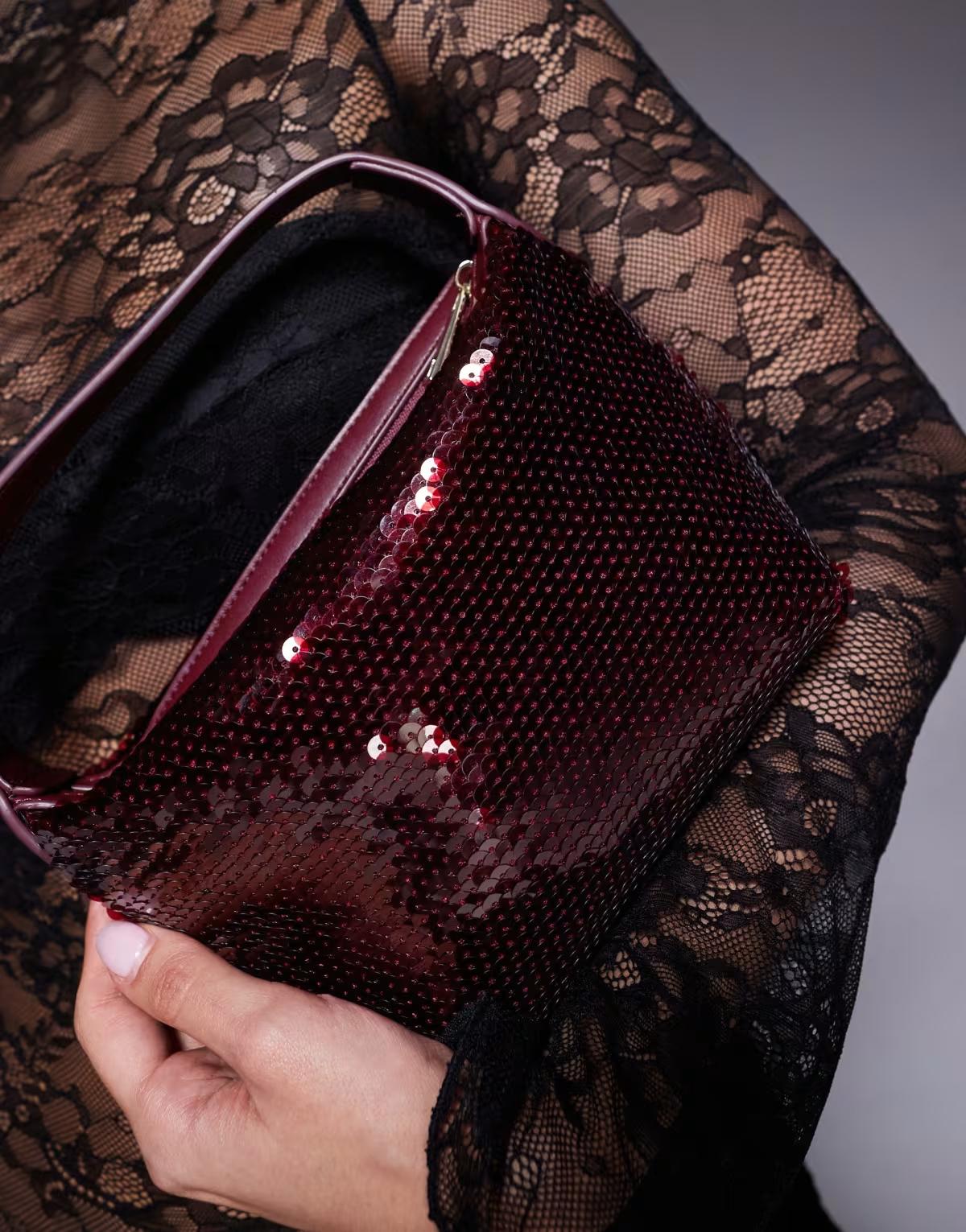 ASOS DESIGN sequin grab clutch bag in burgundy