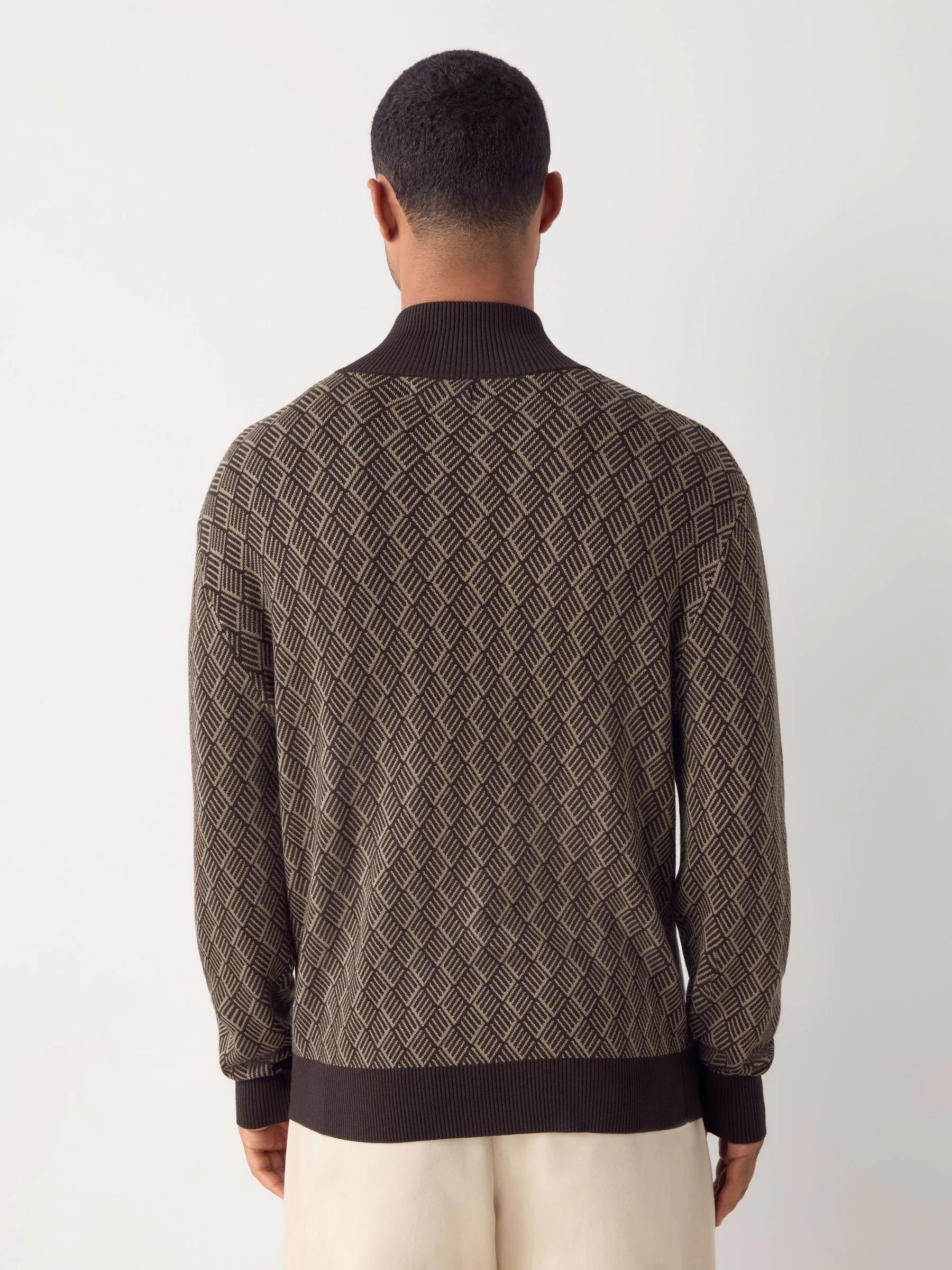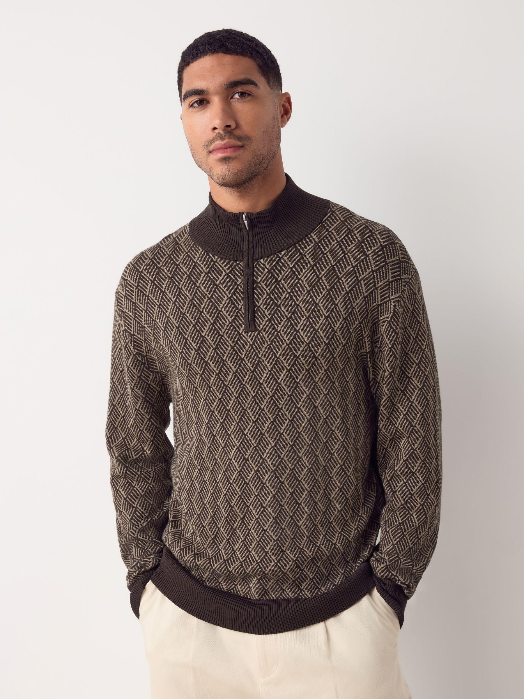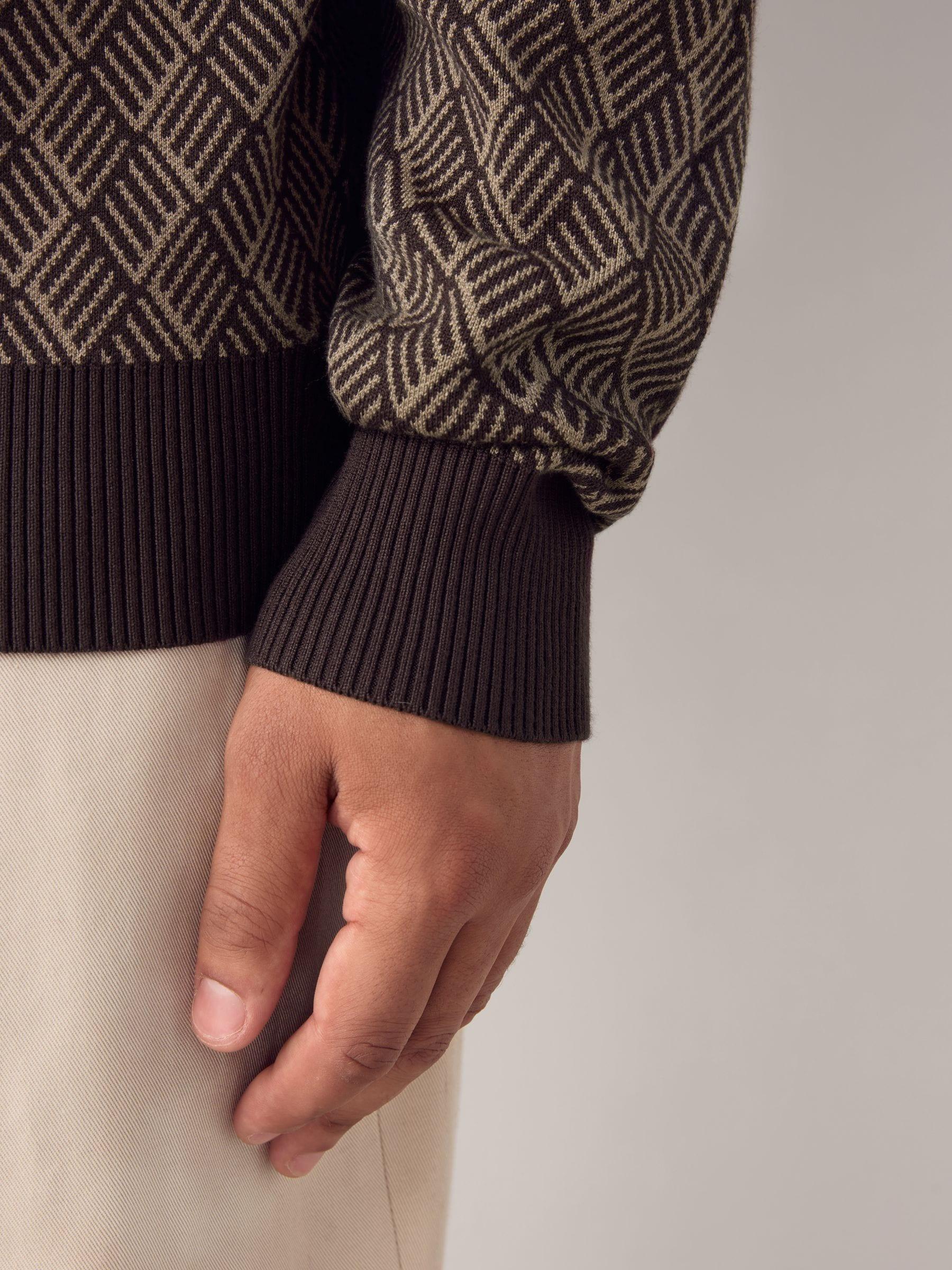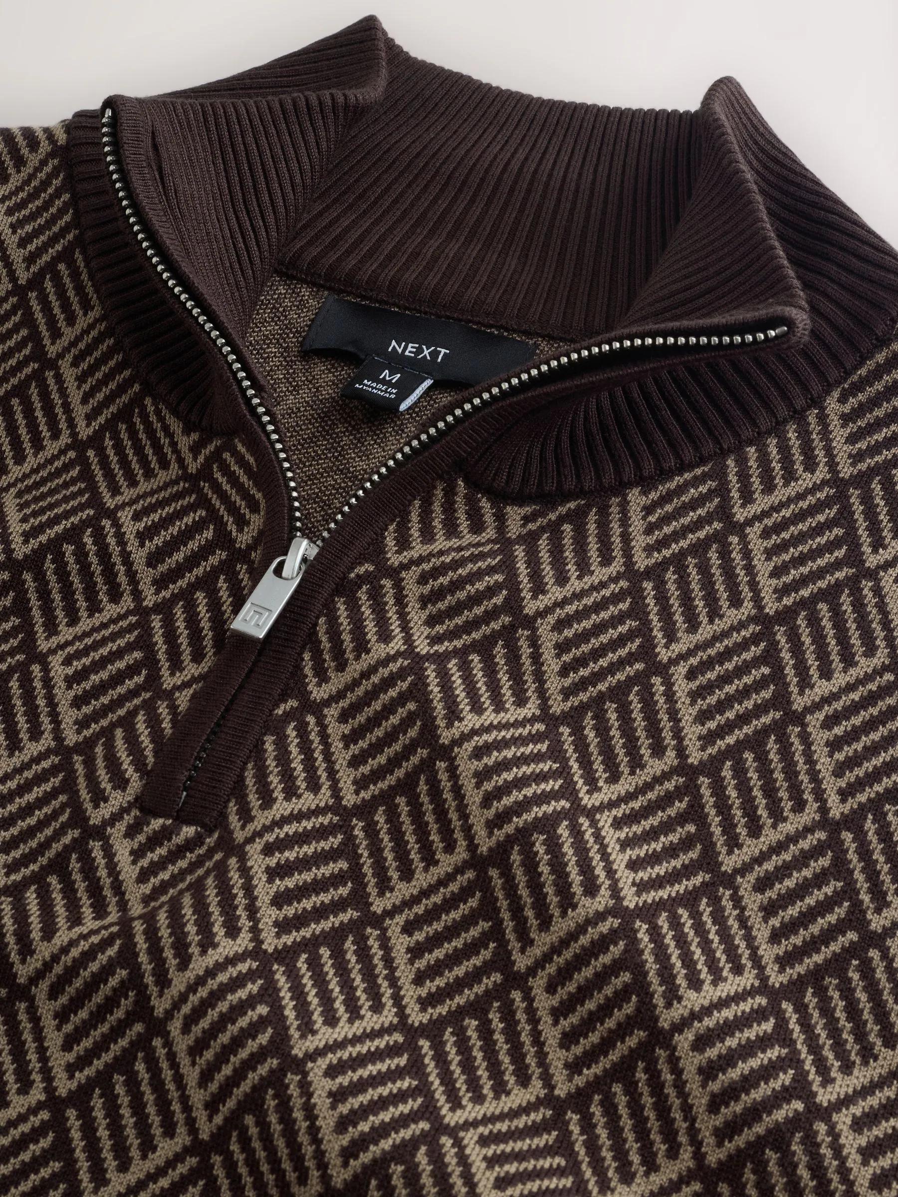 Brown Regular Fit Jacquard Geo Quarter Zip Neck Jumper