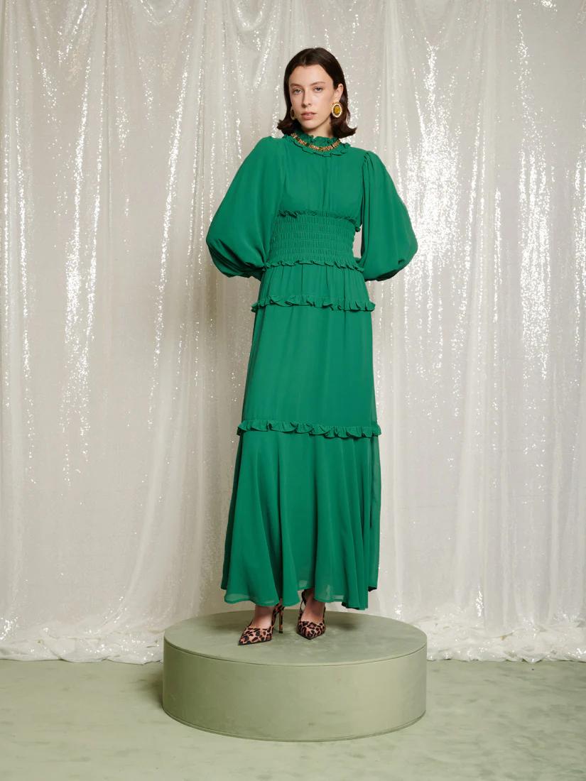 Crowned in chiffon, the Forest Queen Maxi Dress moves like morning mist through the trees. Soft shirring and ruffles create a regal yet romantic silhouette. Exclusively available on Sister Jane.