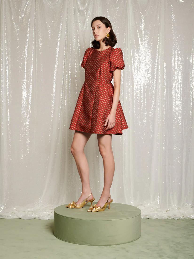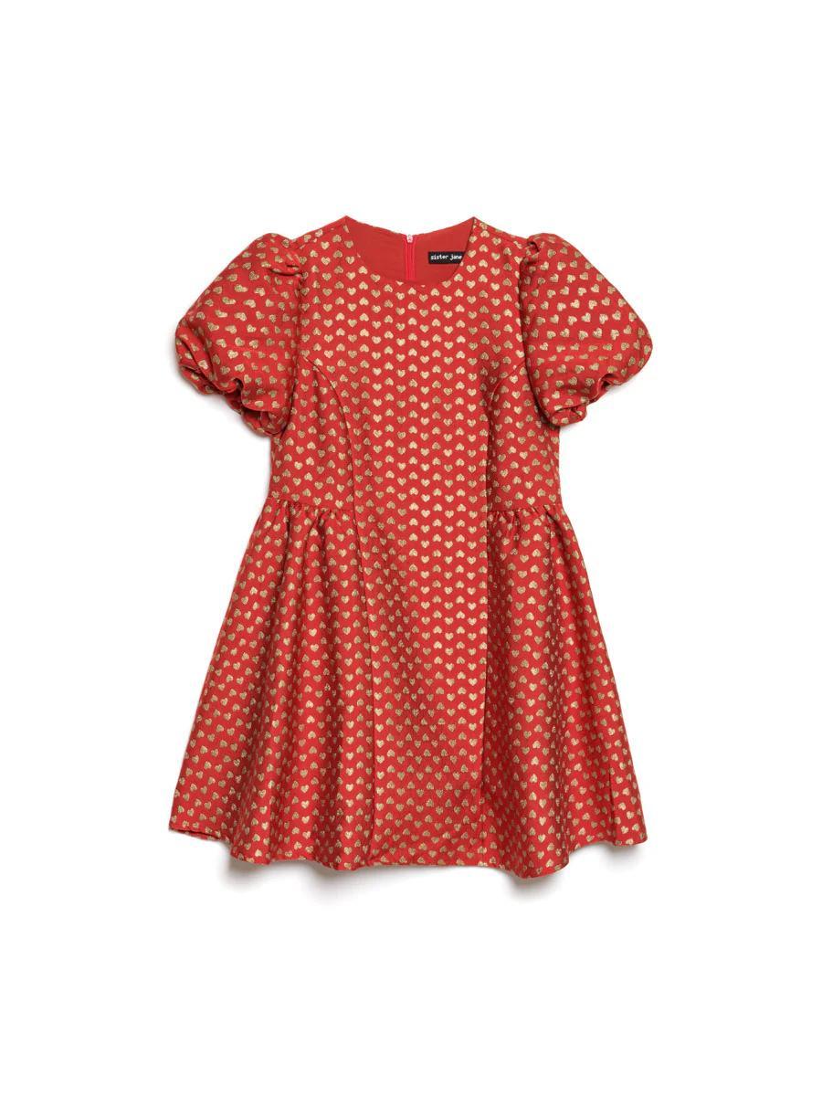 Fall head over heels in the Mini Love Jacquard Dress, where golden hearts gleam and dreams dance in the fabric. Its babydoll silhouette and hidden pockets make it the perfect mix of charm and mischief for every soirée. Exclusively available on Sister Jane.