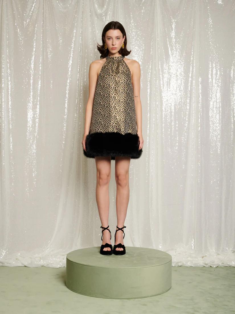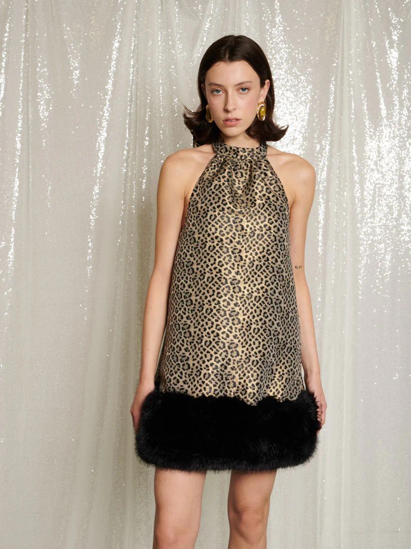 The Golden Bells Mini Dress brings a wild sparkle to party season, with leopard jacquard and faux-fur trims that purr with vintage glamour. An open back adds a wink of mischief. Exclusively available on Sister Jane.