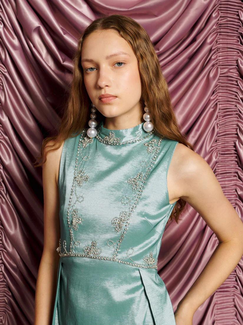 Bathed in the glow of a thousand tiny lights, this taffeta mini shimmers like a secret whispered beneath a crystal chandelier. The gem embellishments sparkle with every step, while pleated sides invite a twirl, as though the night itself were your stage.