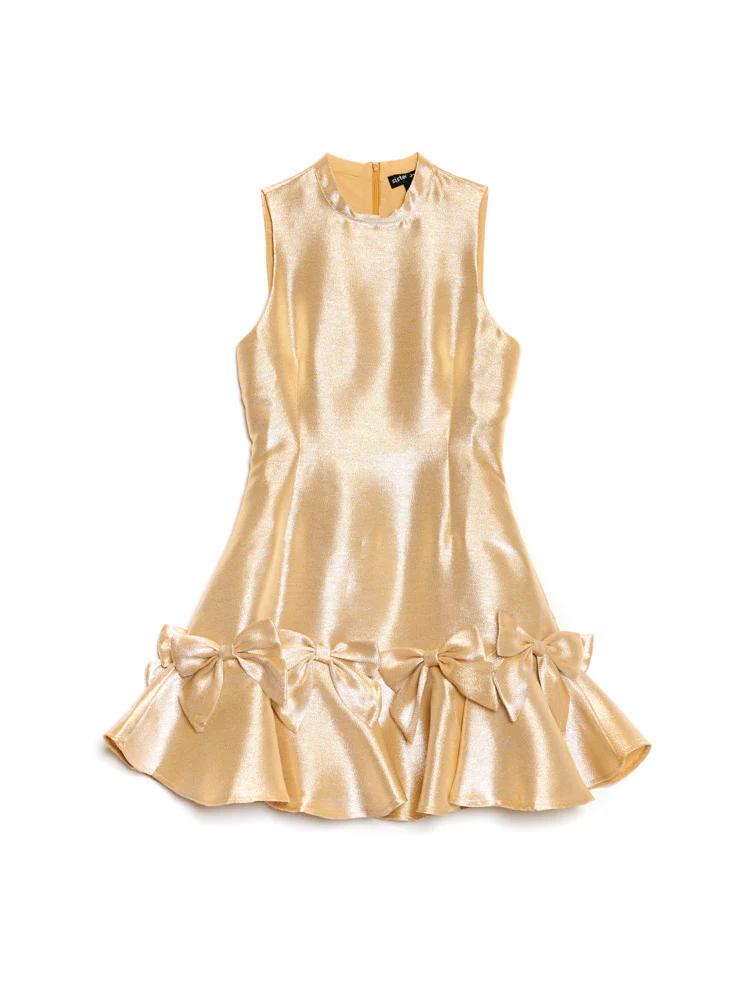 Make every step a dance in the Shimmy Mini, its metallic fabric catches the light as bows mark each seam. A dress designed for twirling long after the curtain falls.