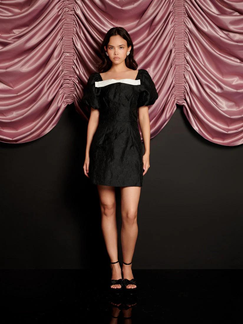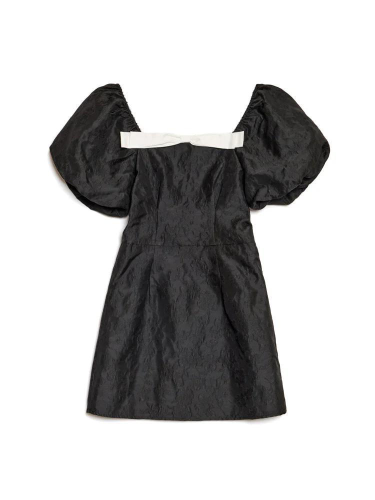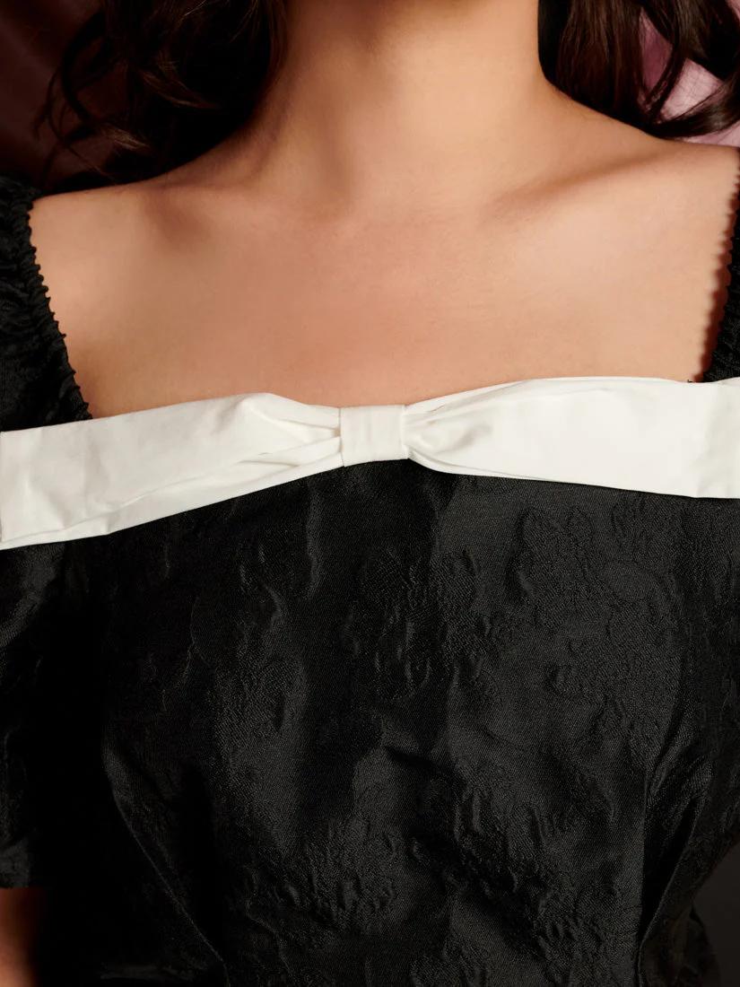 Raise a glass in the Cocktail Mini, jacquard splendour with a square neckline and playful bow trim. A toast to glamour, distilled into a dress.