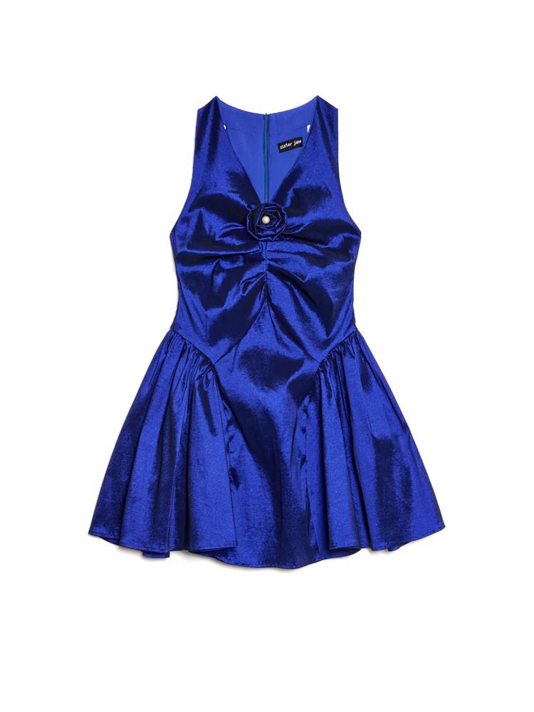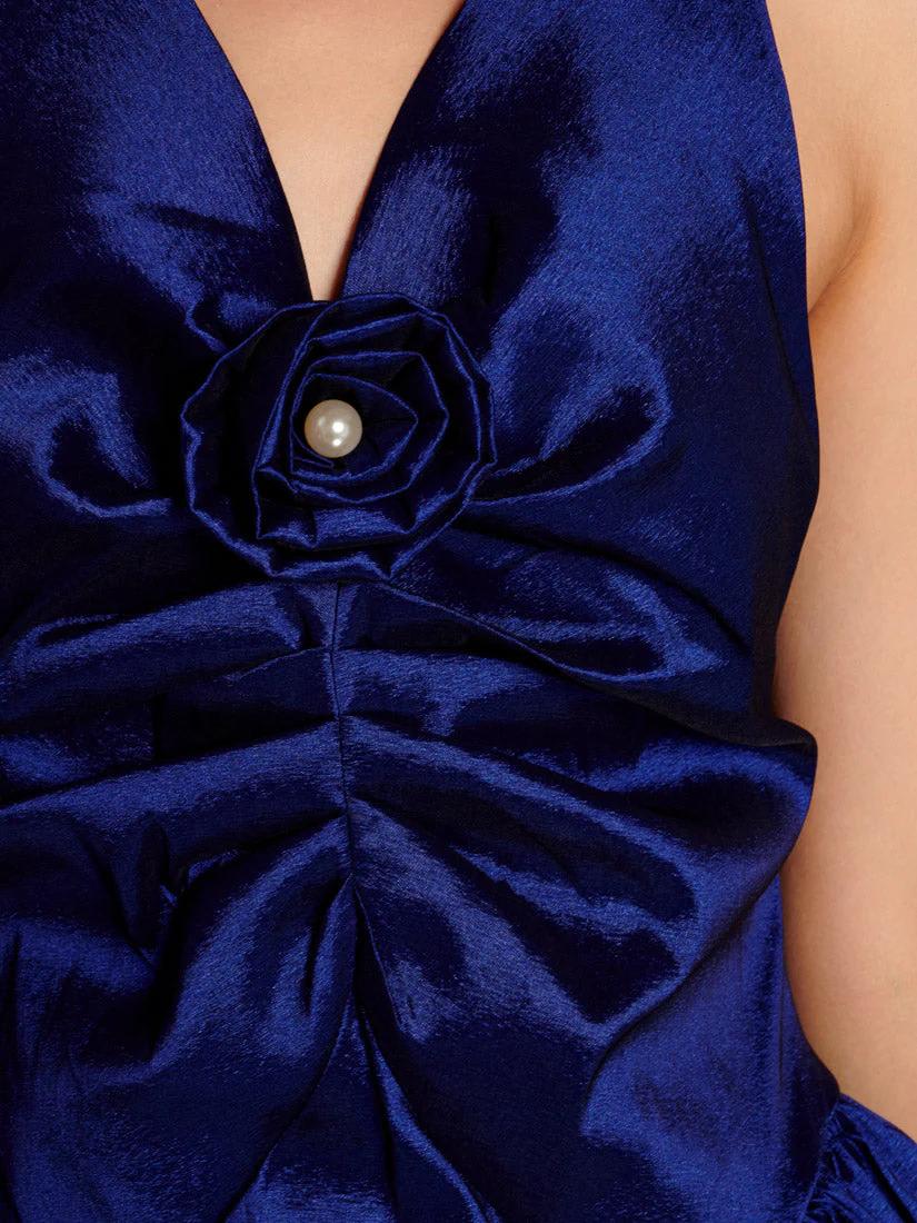 The Marylin Taffeta Mini Dress is a showstopper in glossy taffeta. A delicate rose trim with a pearl centre crowns the gathered bodice, while curved seams flatter every move.