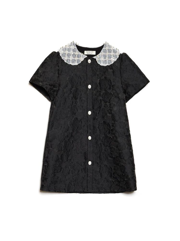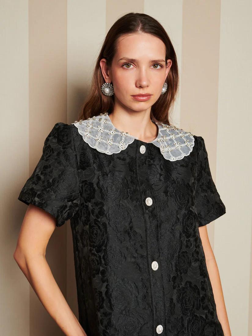 A playful mini dress adorned with a shimmering organza collar. Designed for adventure and joy, perfect for a modern day treasure hunt.