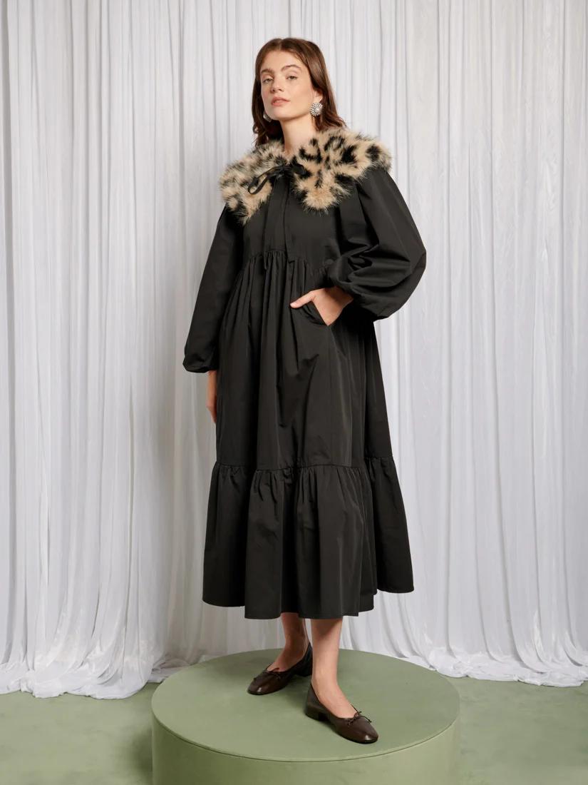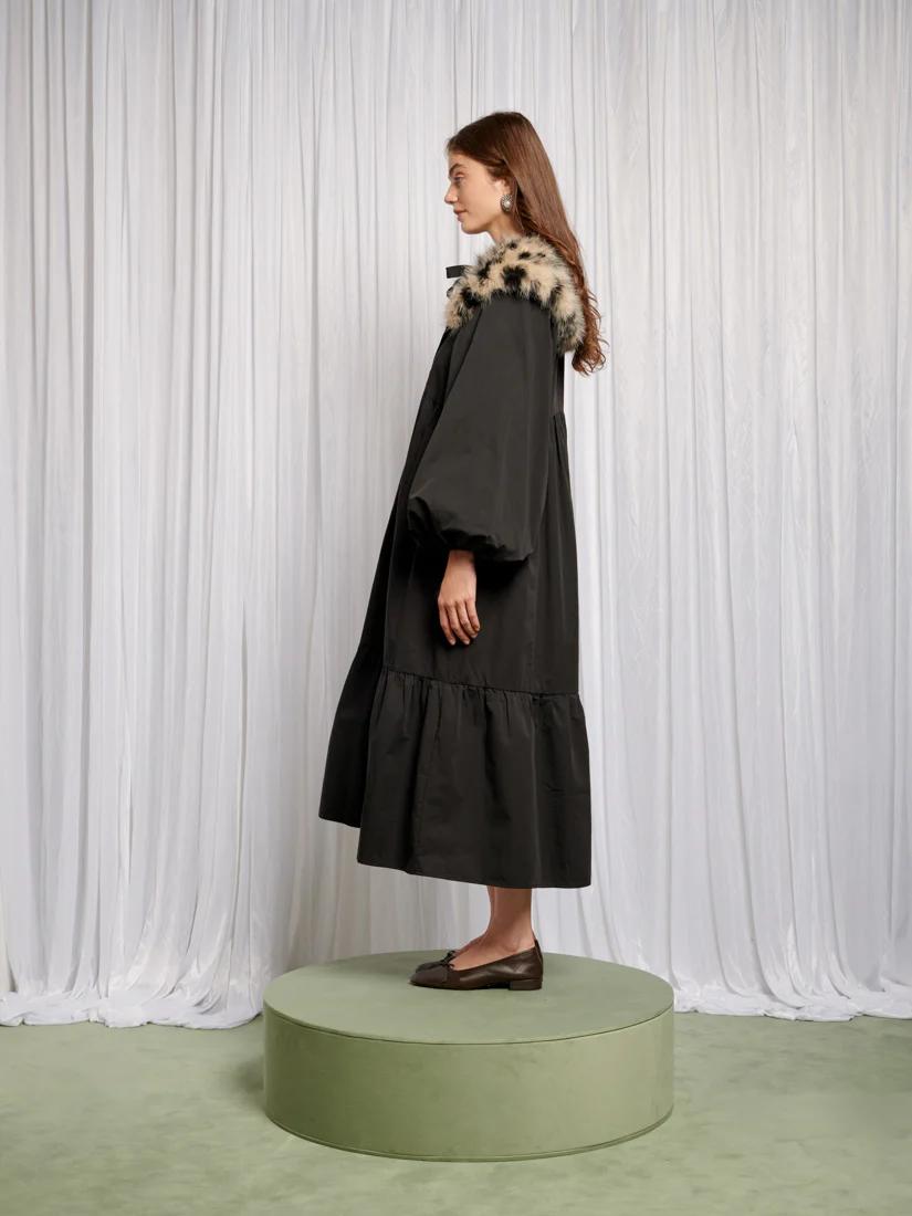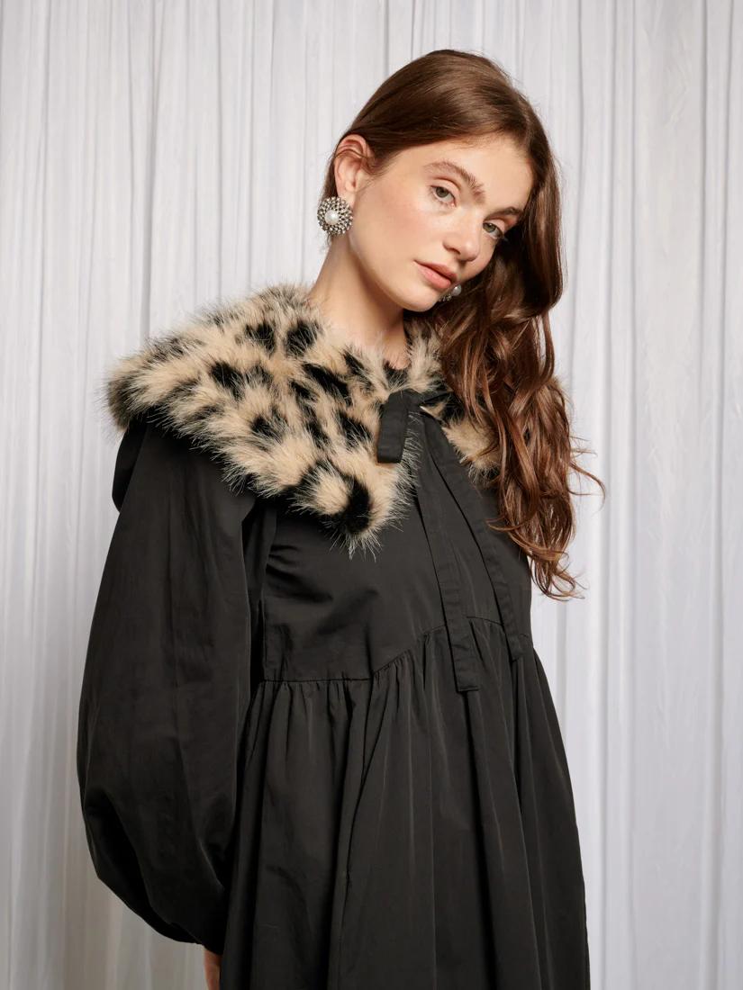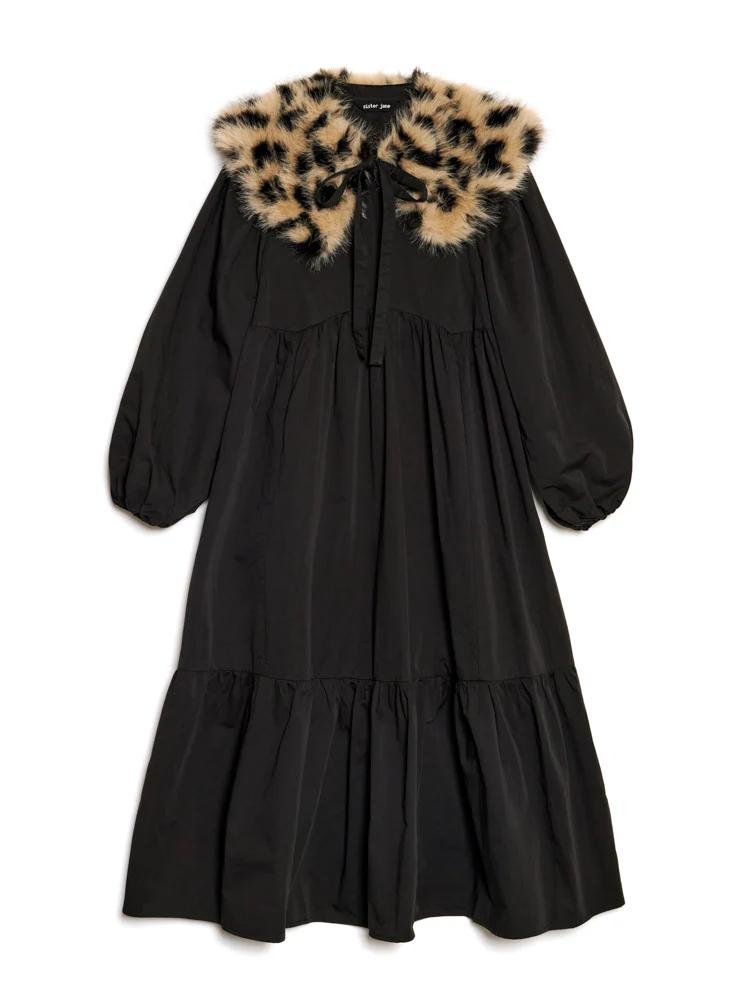The clever black dress – A flowing popeline maxi with balloon sleeves, dressed up with a removable Peter Pan collar in cheeky cheetah faux fur. Tie it on for an instant twist, or wear without for quiet sophistication. Always ready for after-class adventures. Exclusively available on Sister Jane.
