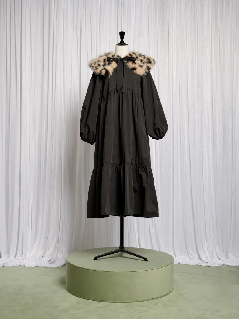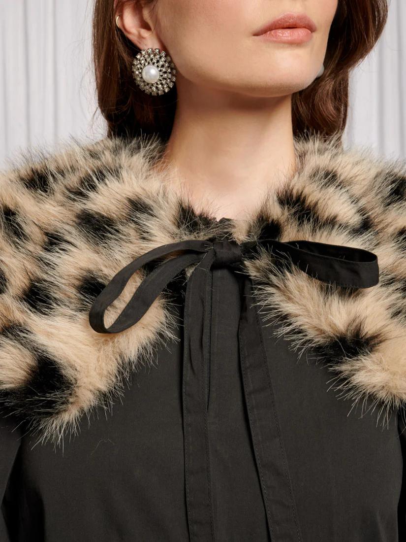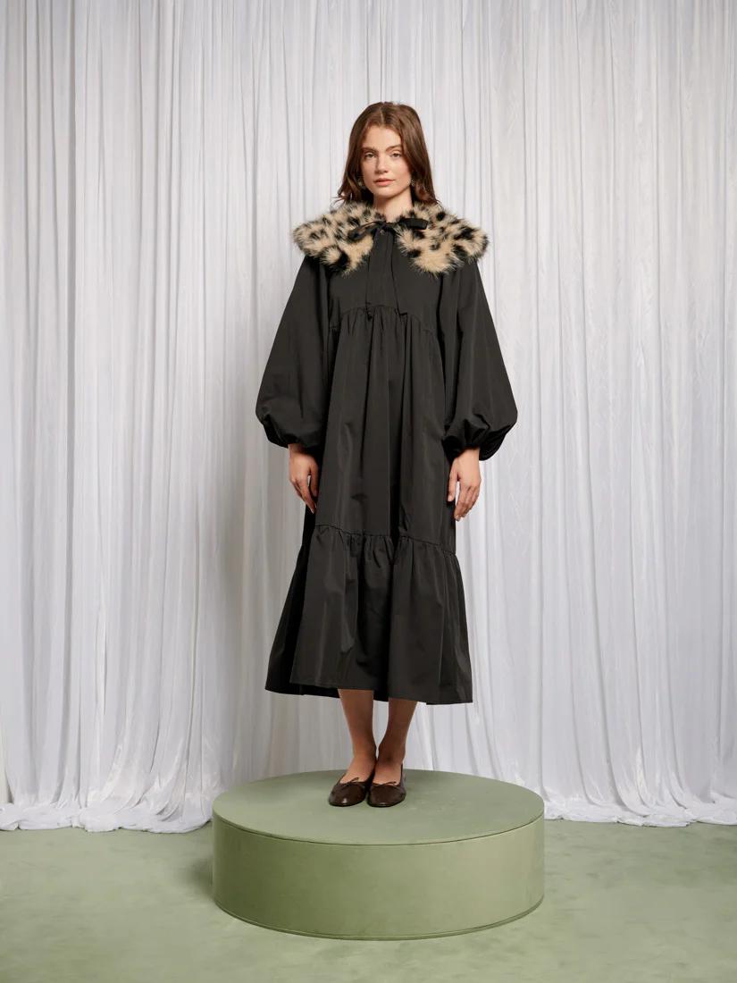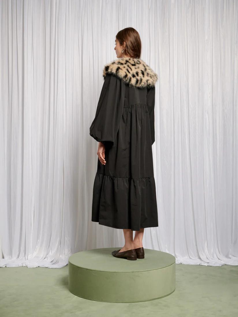 The clever black dress – A flowing popeline maxi with balloon sleeves, dressed up with a removable Peter Pan collar in cheeky cheetah faux fur. Tie it on for an instant twist, or wear without for quiet sophistication. Always ready for after-class adventures. Exclusively available on Sister Jane.