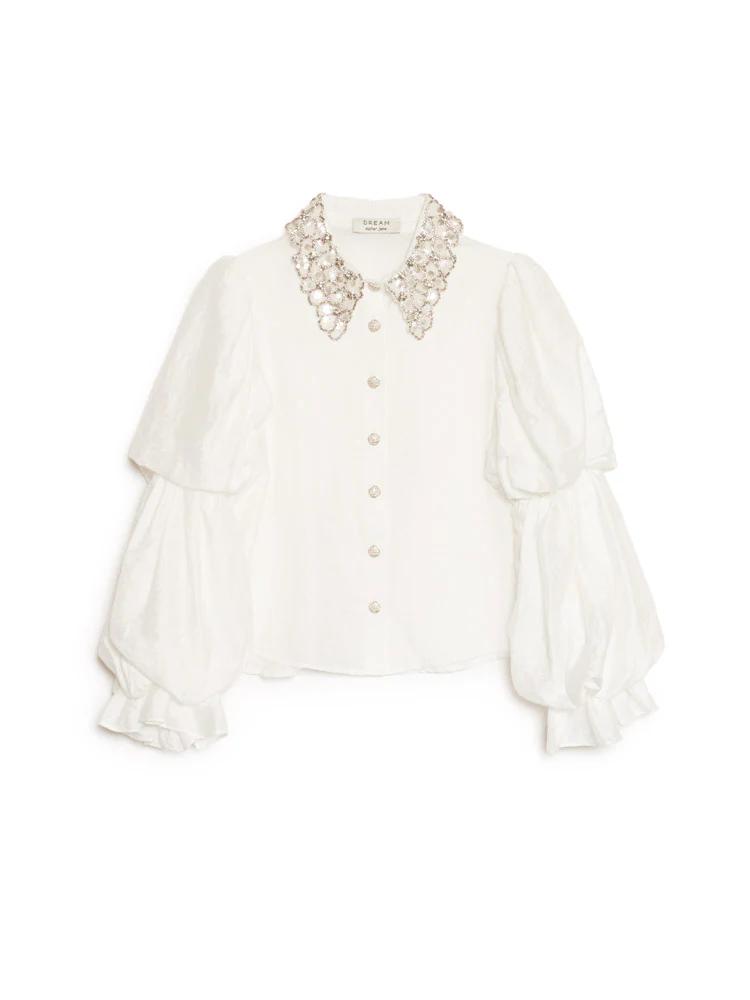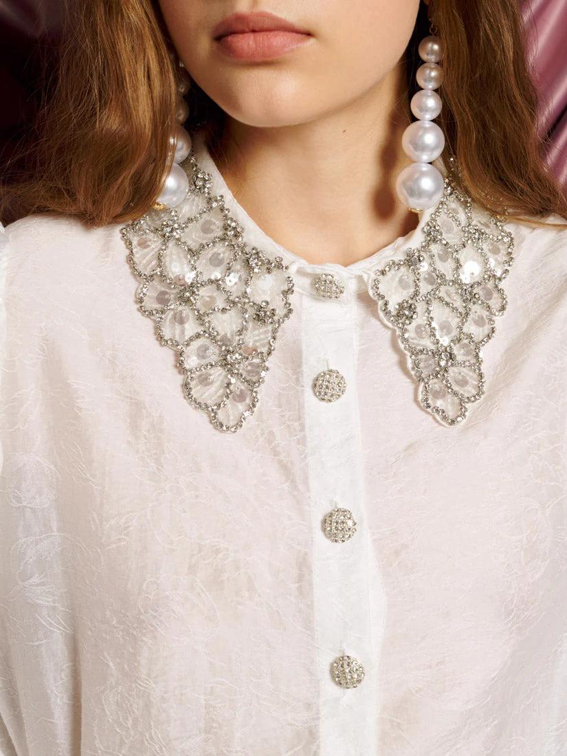 Rita Embellished Blouse is a love letter to opulence. A gem-encrusted collar frames your poise, embodying confidence with a touch of drama. Pair it with the Showgirls Tweed Trousers and let the show begin.