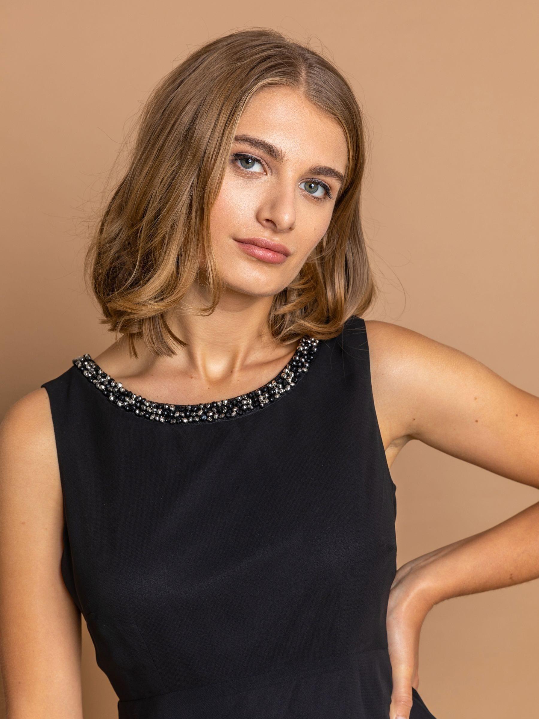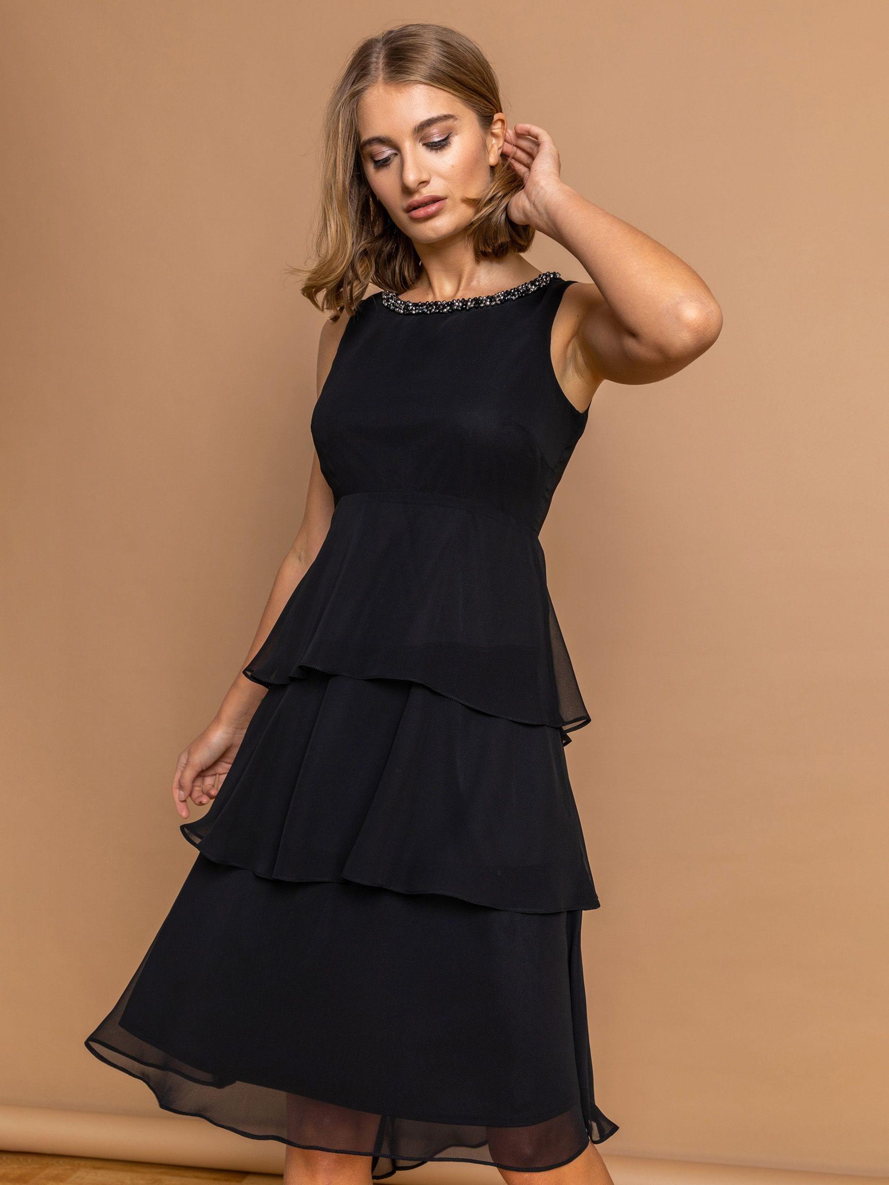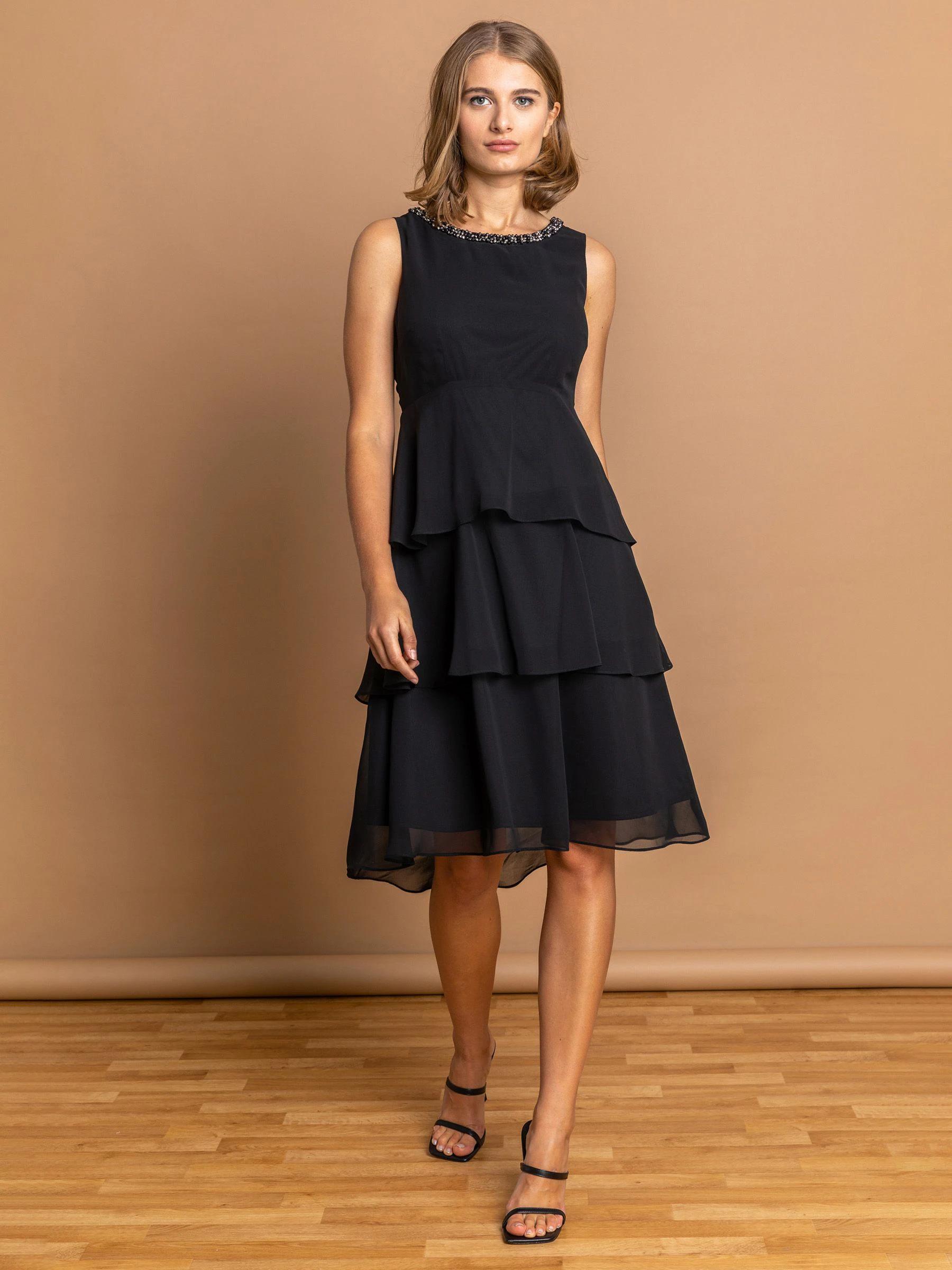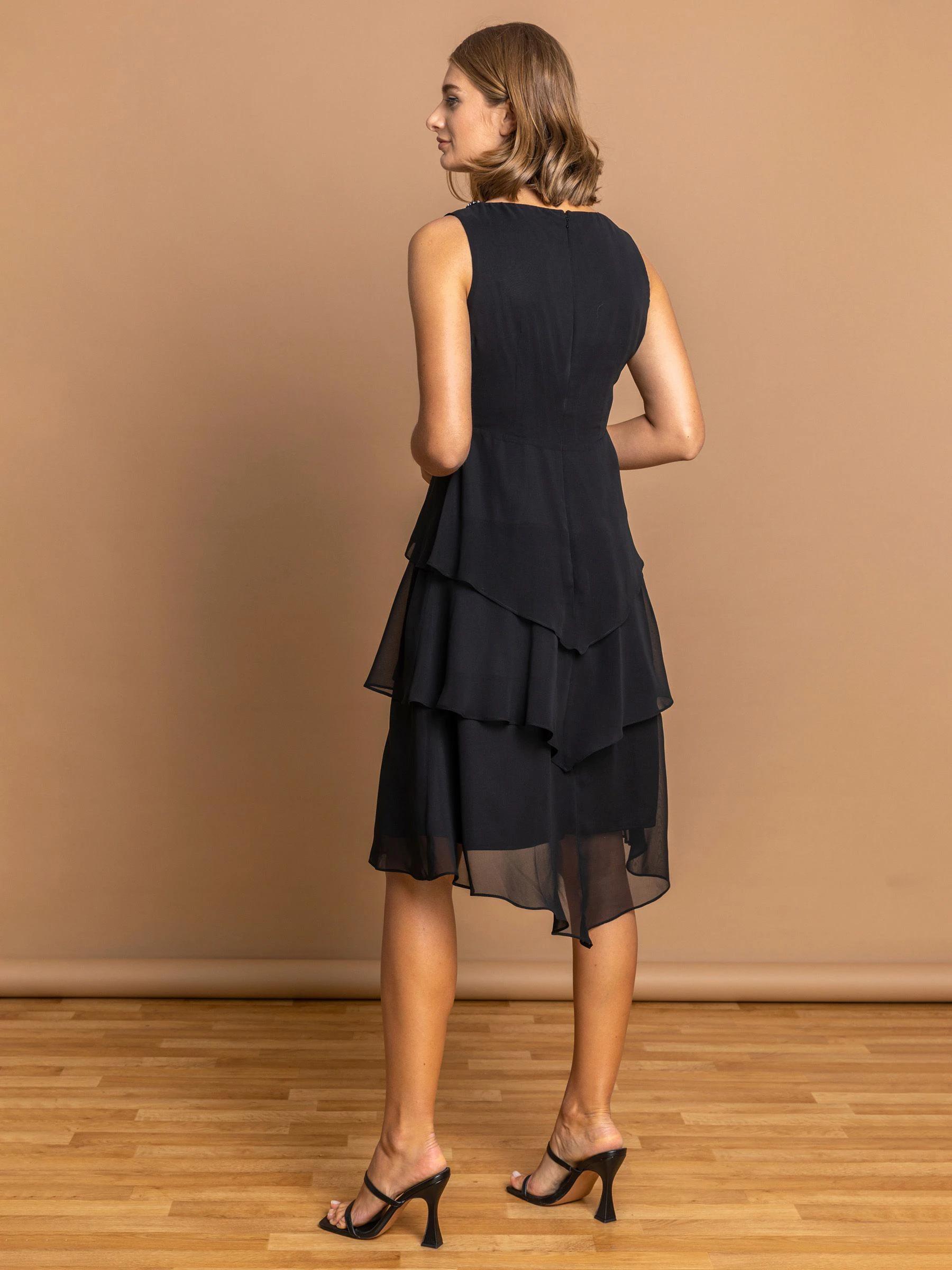 Roman Black Embellished Neck Tiered Chiffon Dress