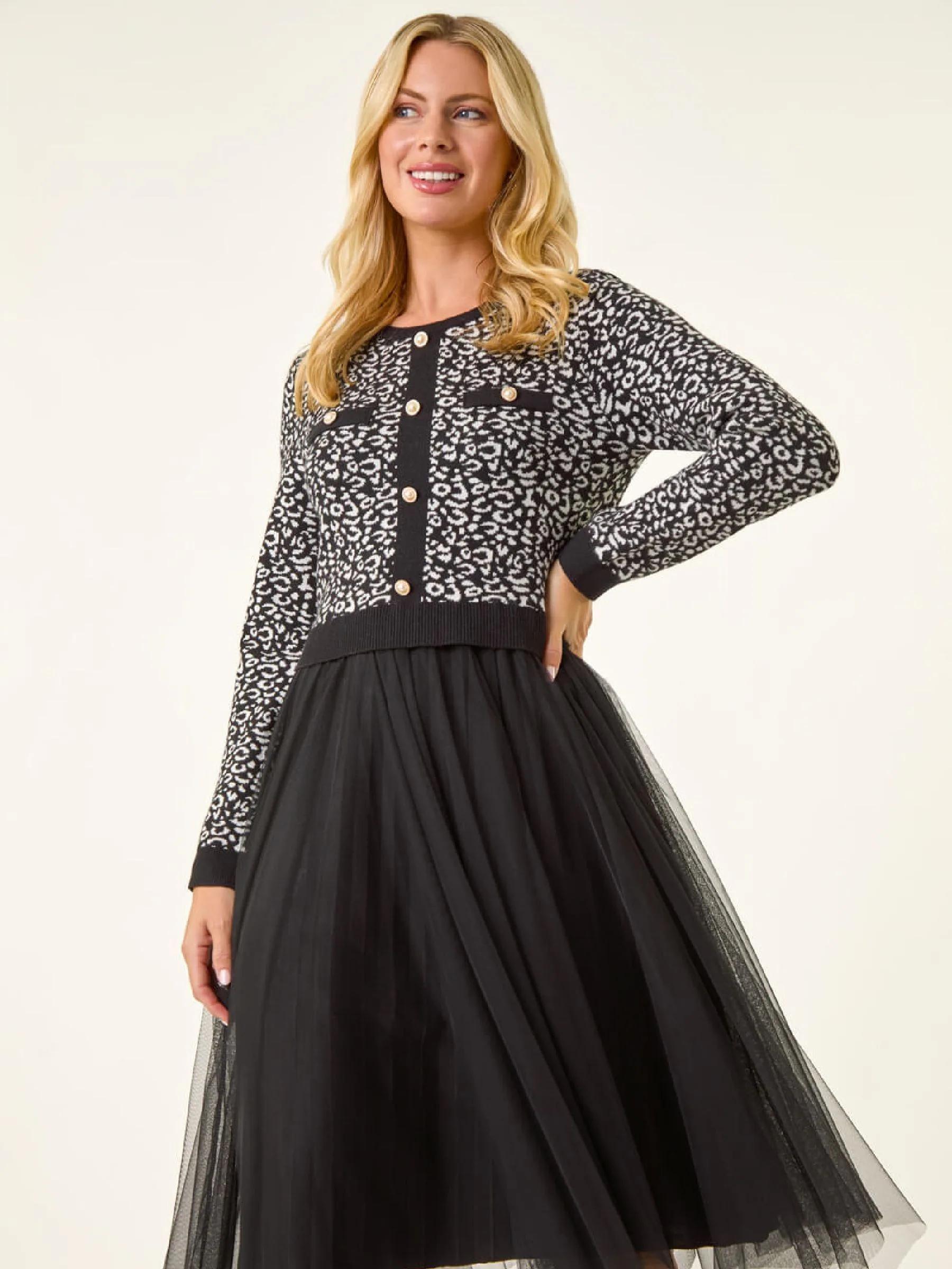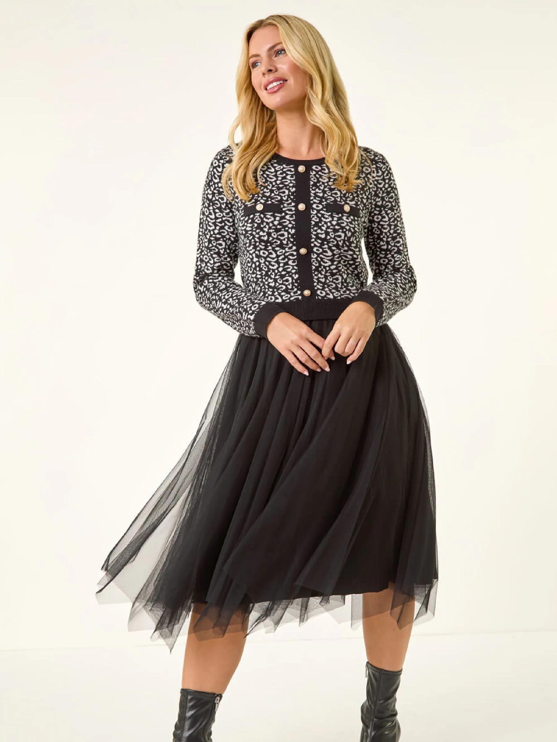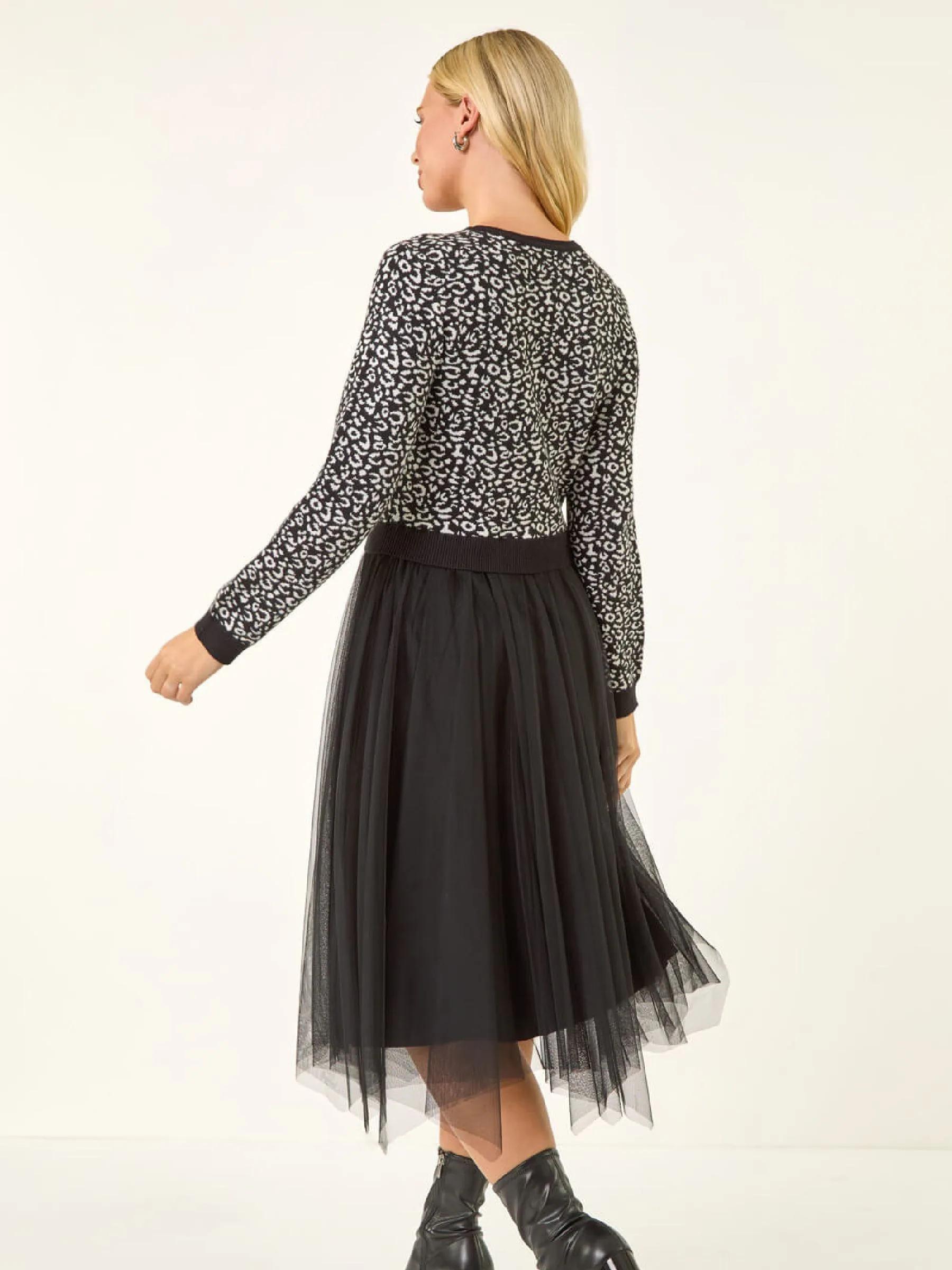 Roman Black Petite Animal Knitted Mesh Dress