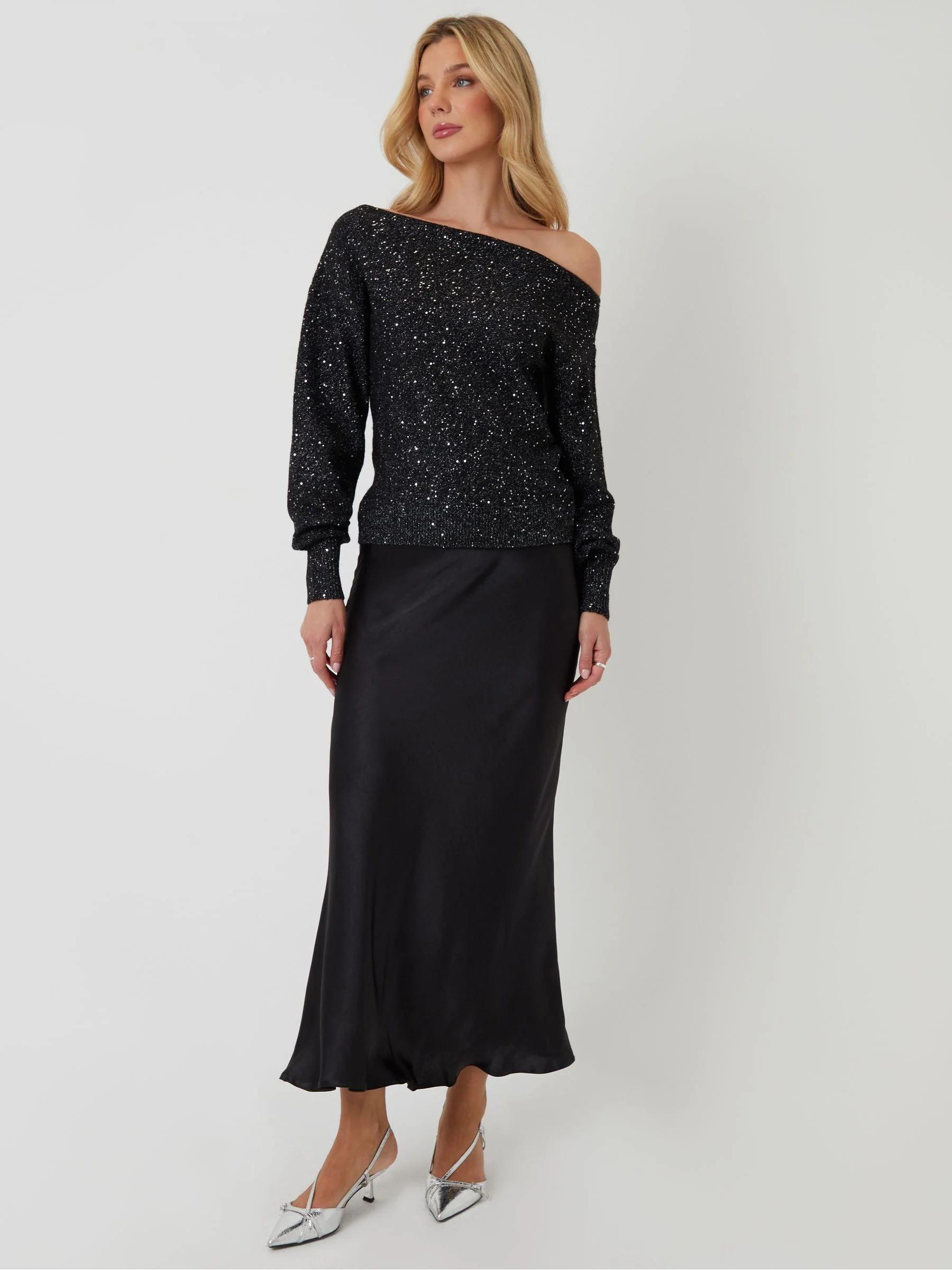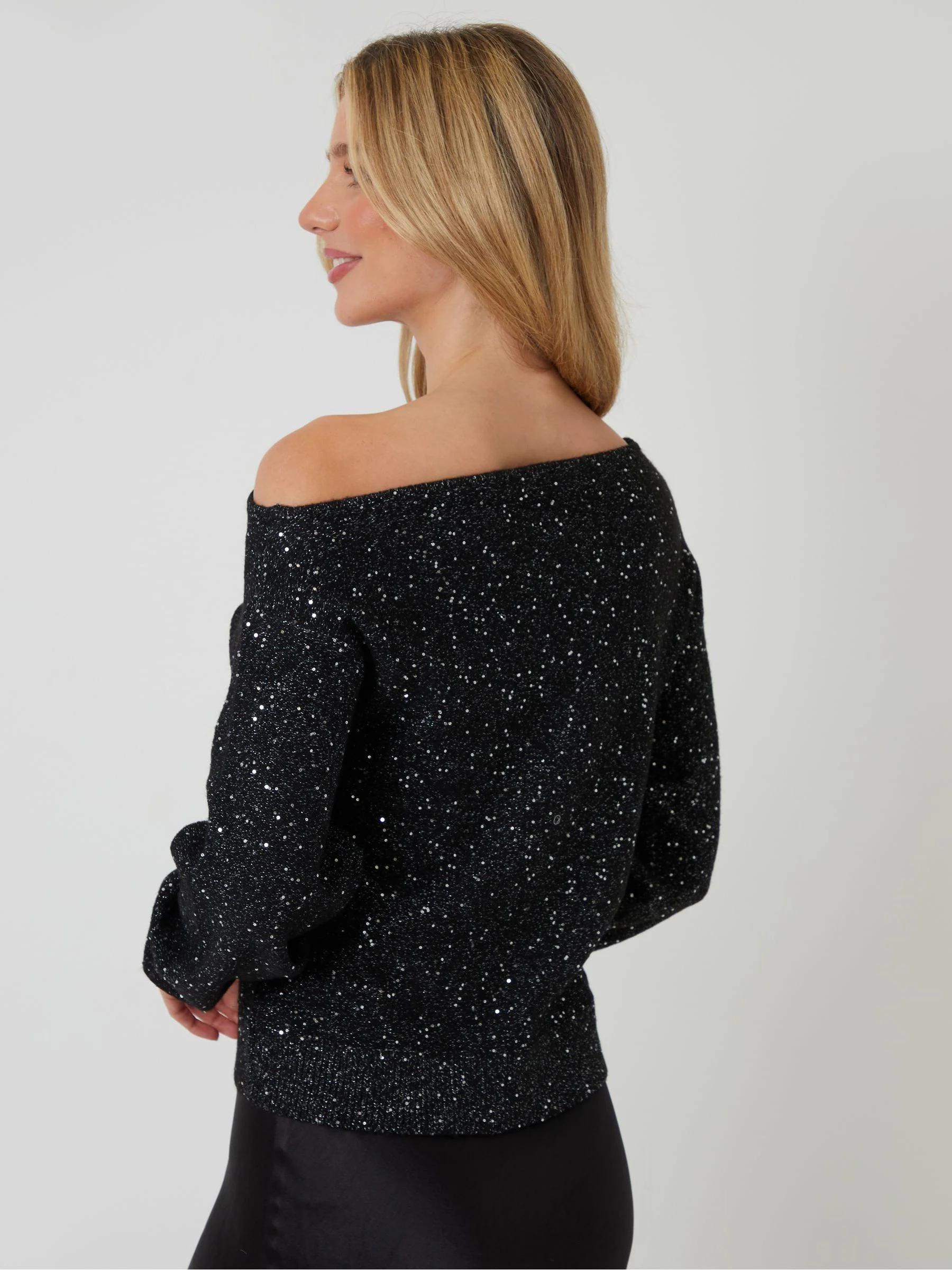 Threadbare Black Knitted Sequin Slash Neck Jumper