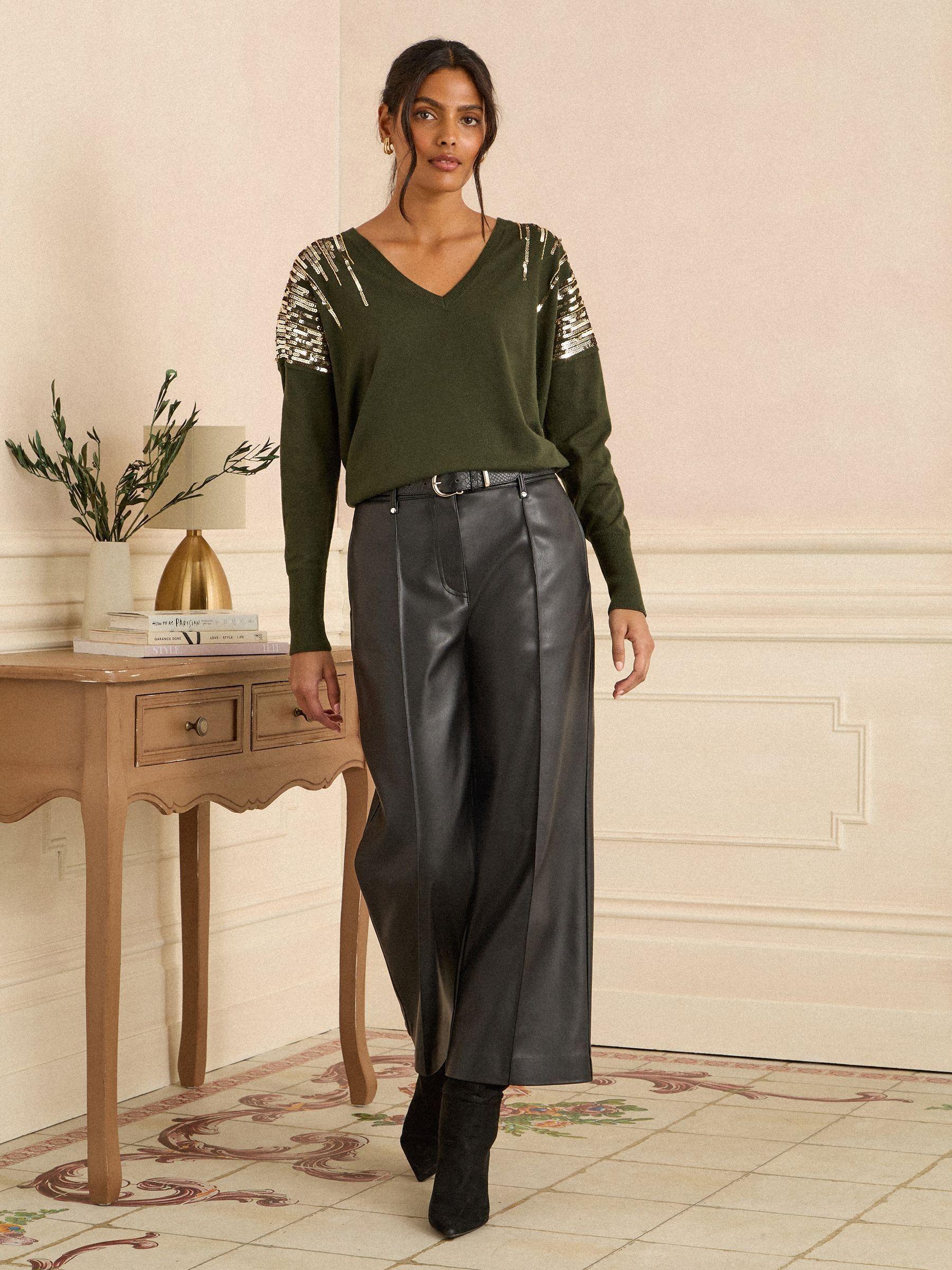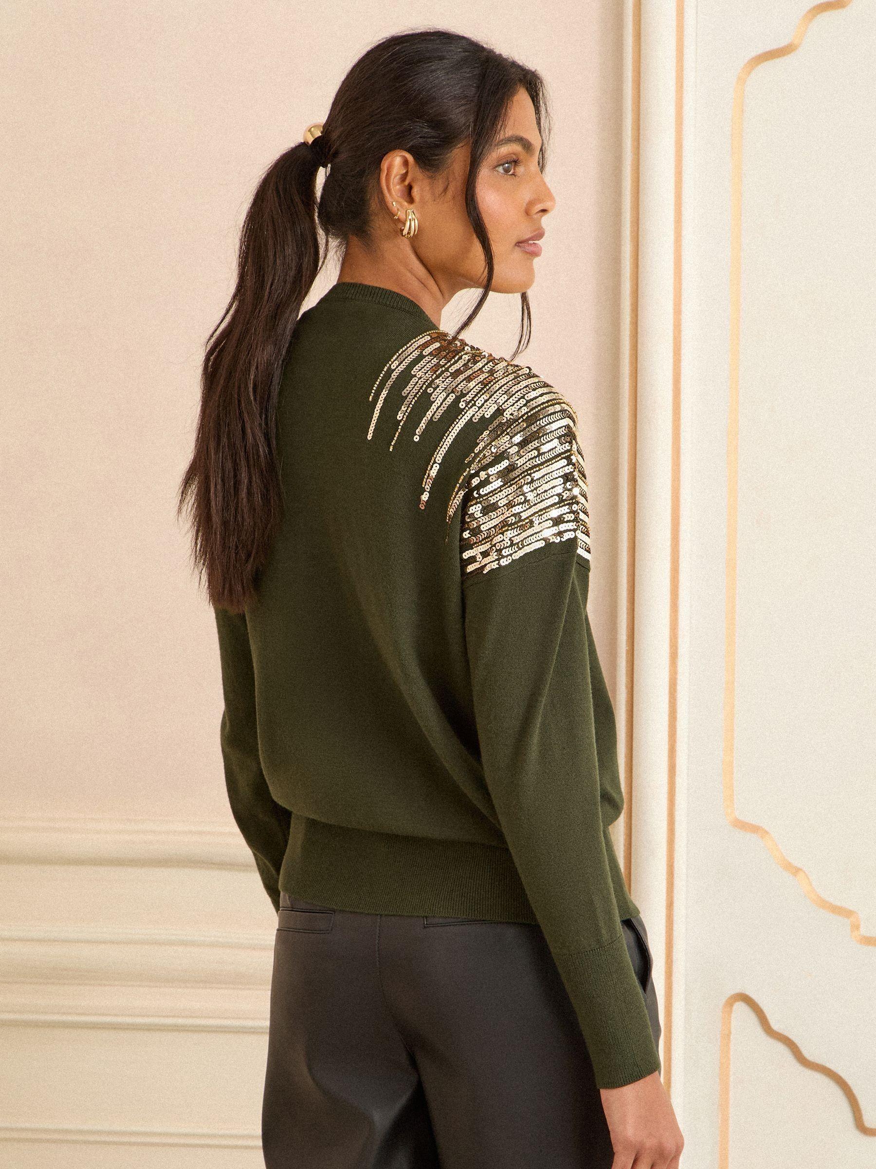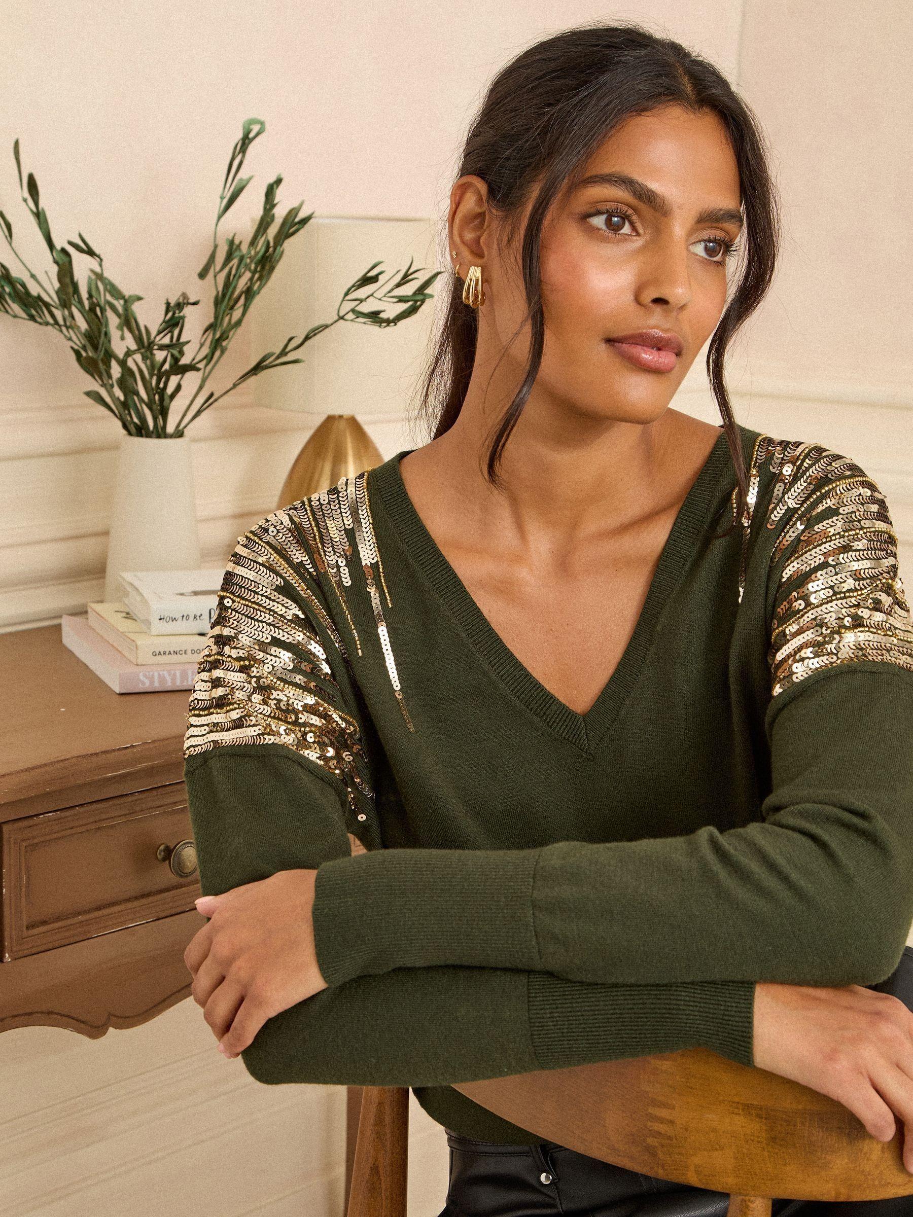 Love & Roses Khaki Green Sequin V-Neck Knitted Jumper
