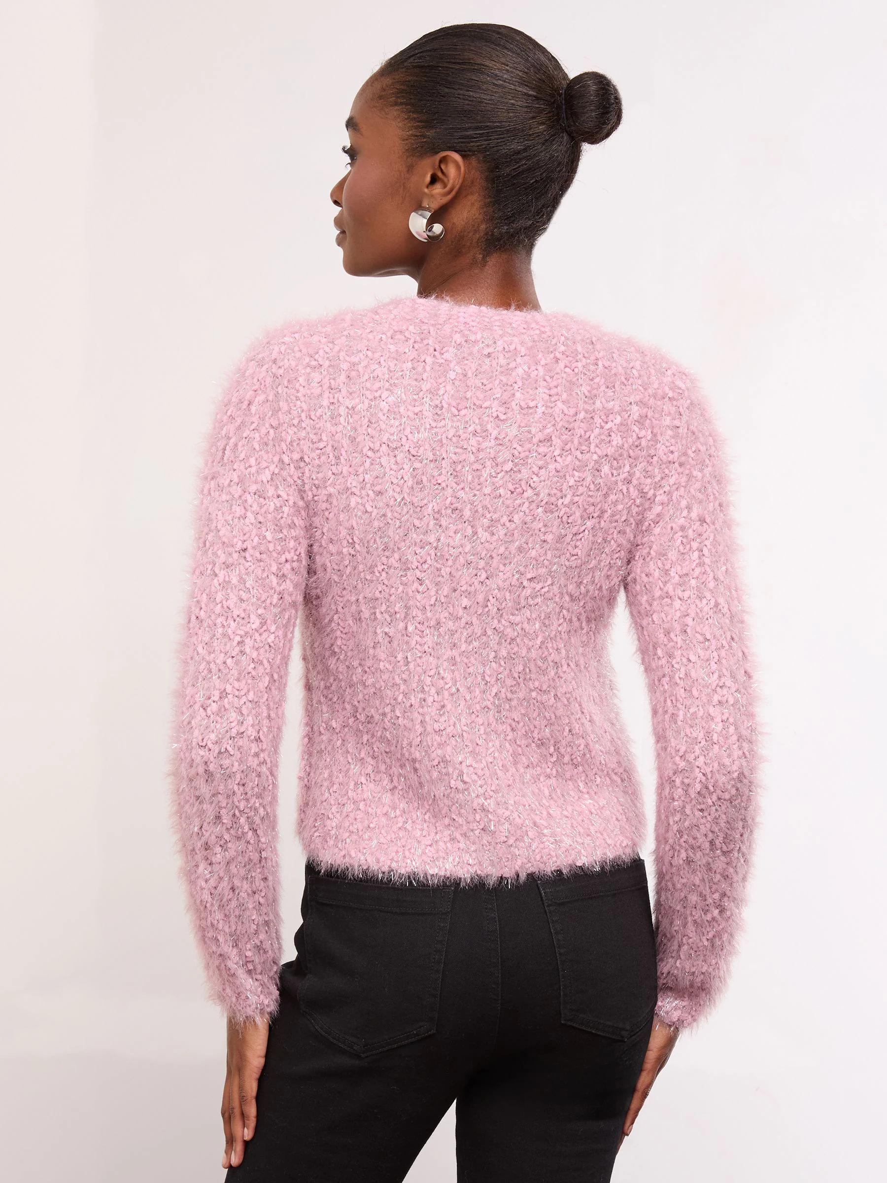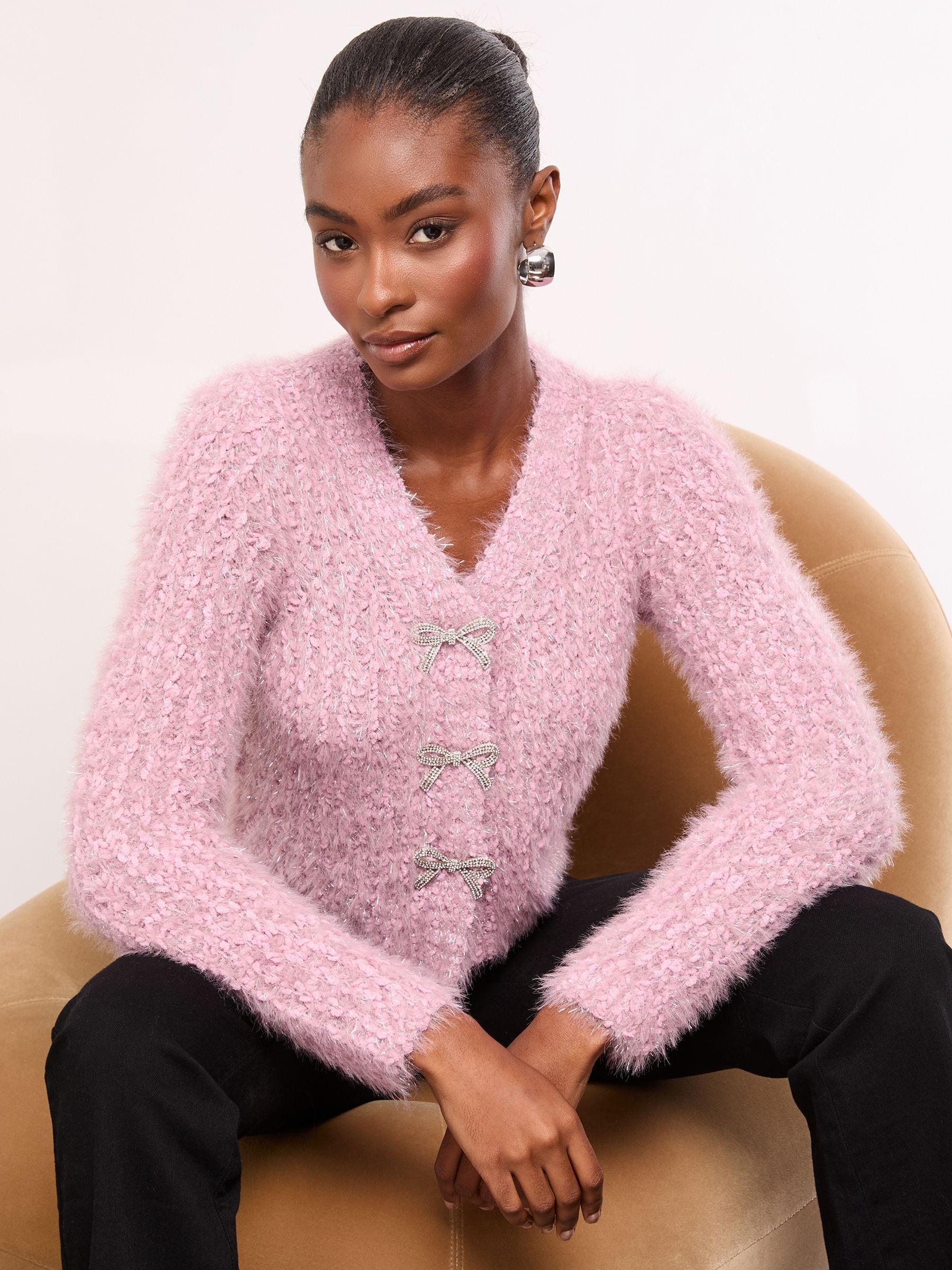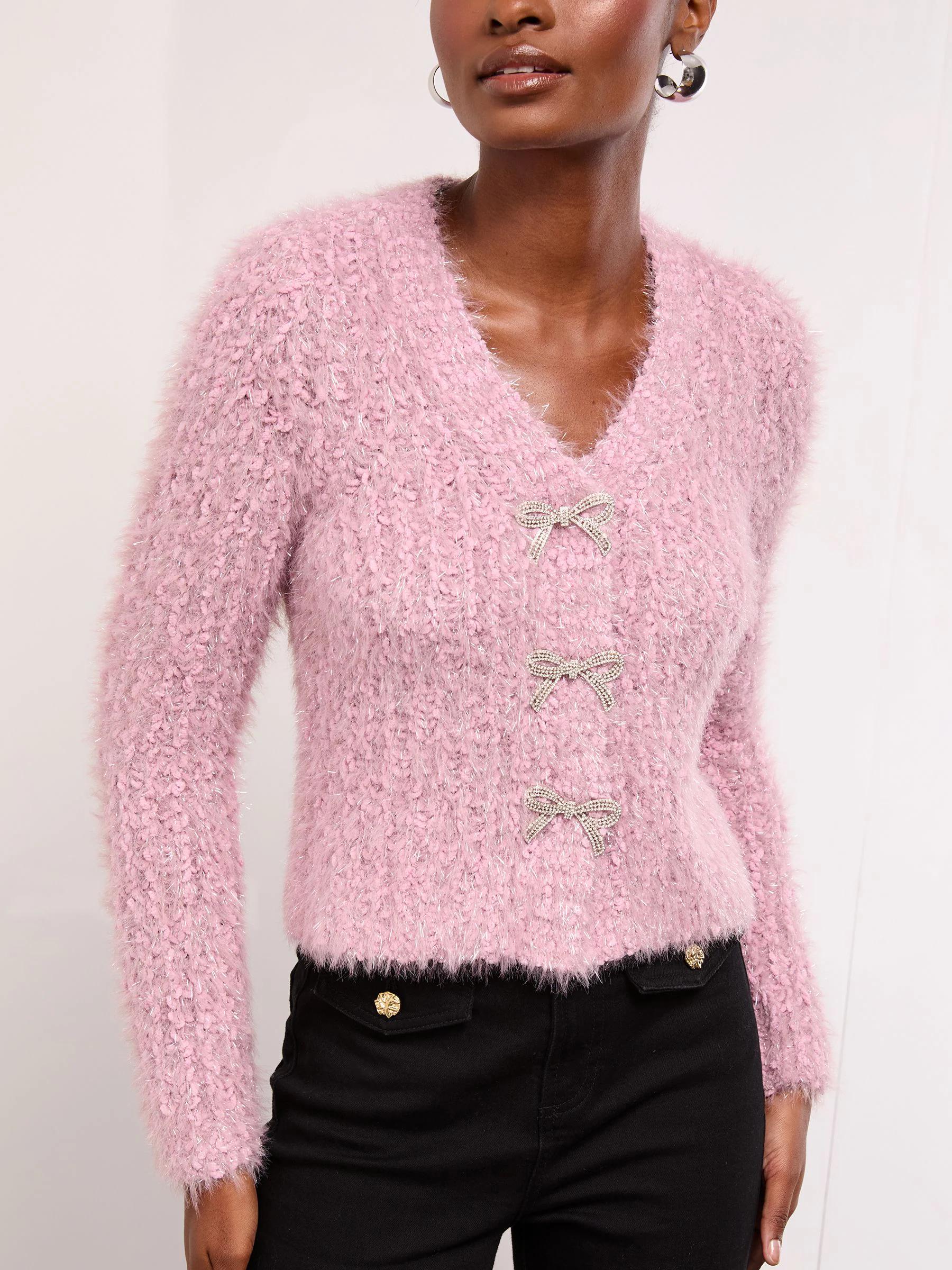 Lipsy Pink V-Neck Textured Tinsel Embellished Bow Buttoned Knit Cardigan