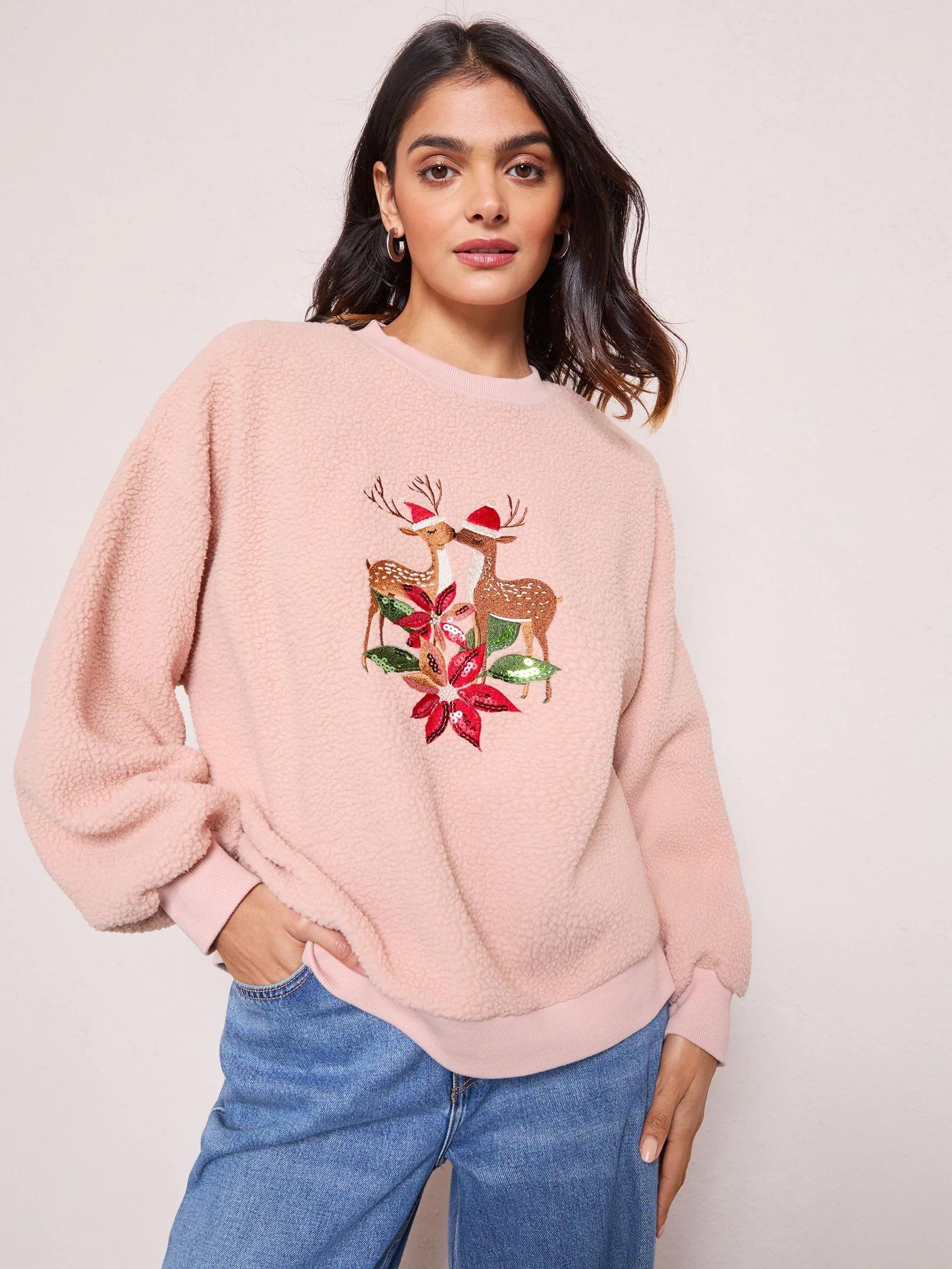 Friends Like These Pink Reindeer Embroidered Borg Sweatshirt