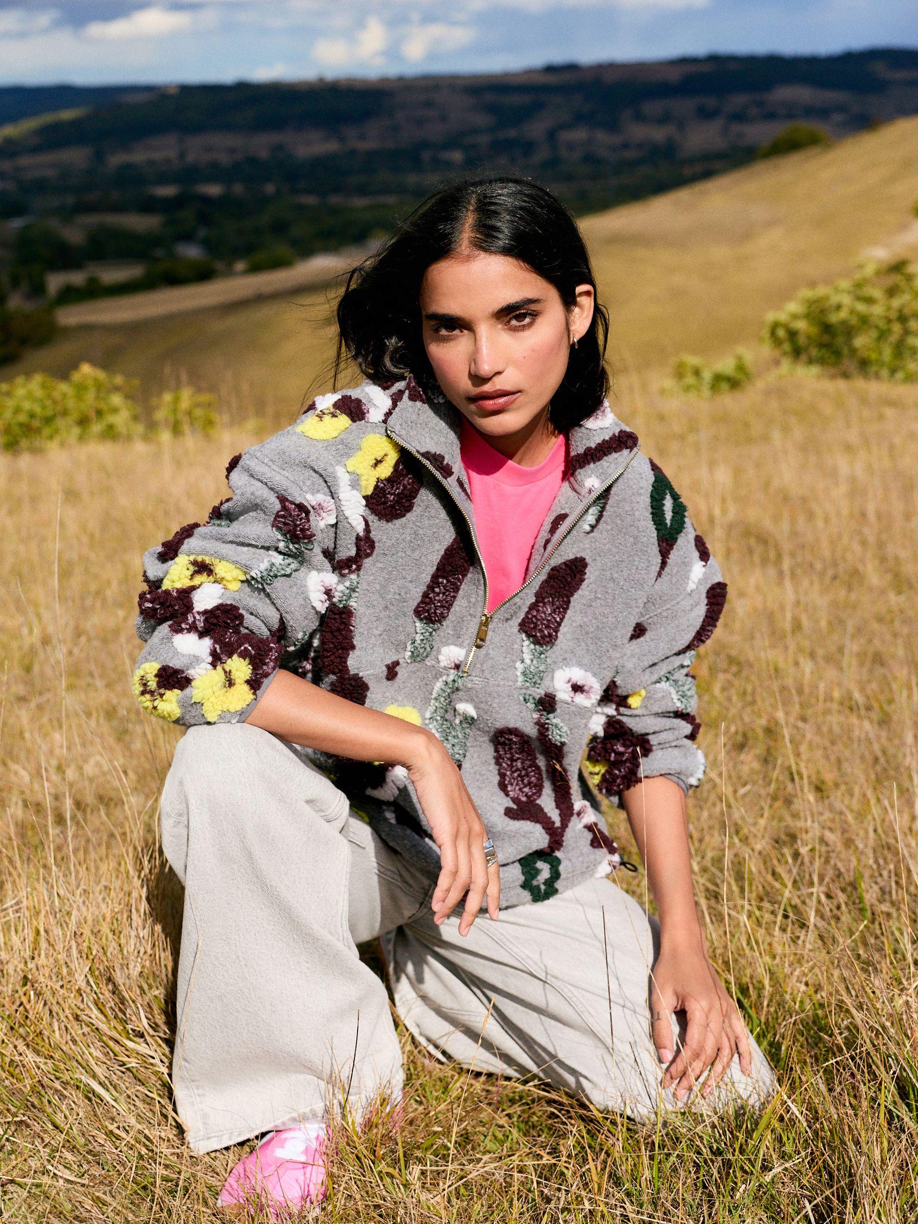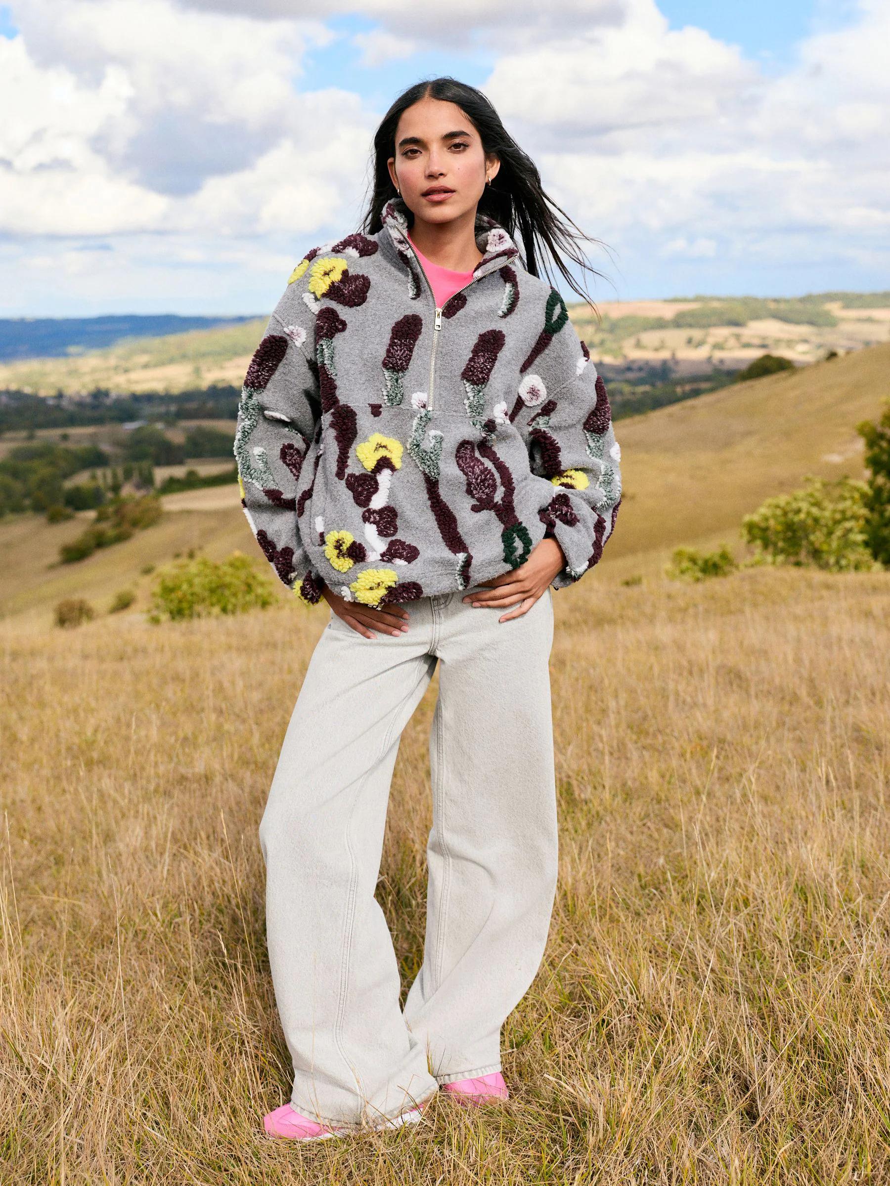 Grey Floral Jaquarded Borg Half Zip Neck Fleece Sweatshirt