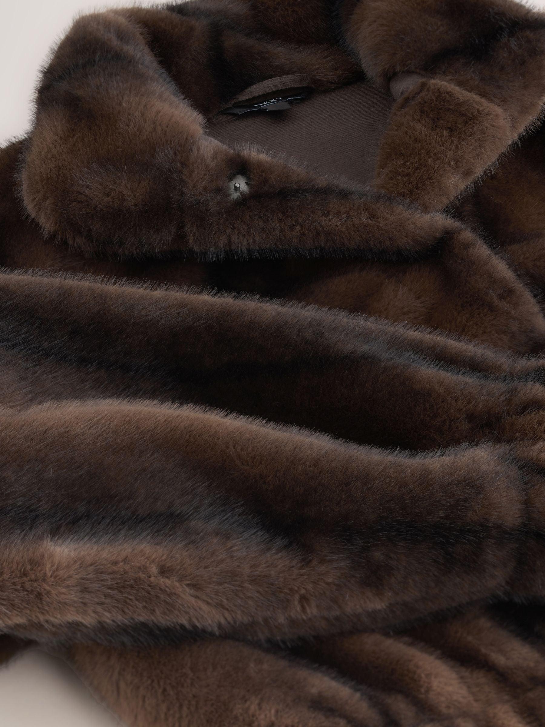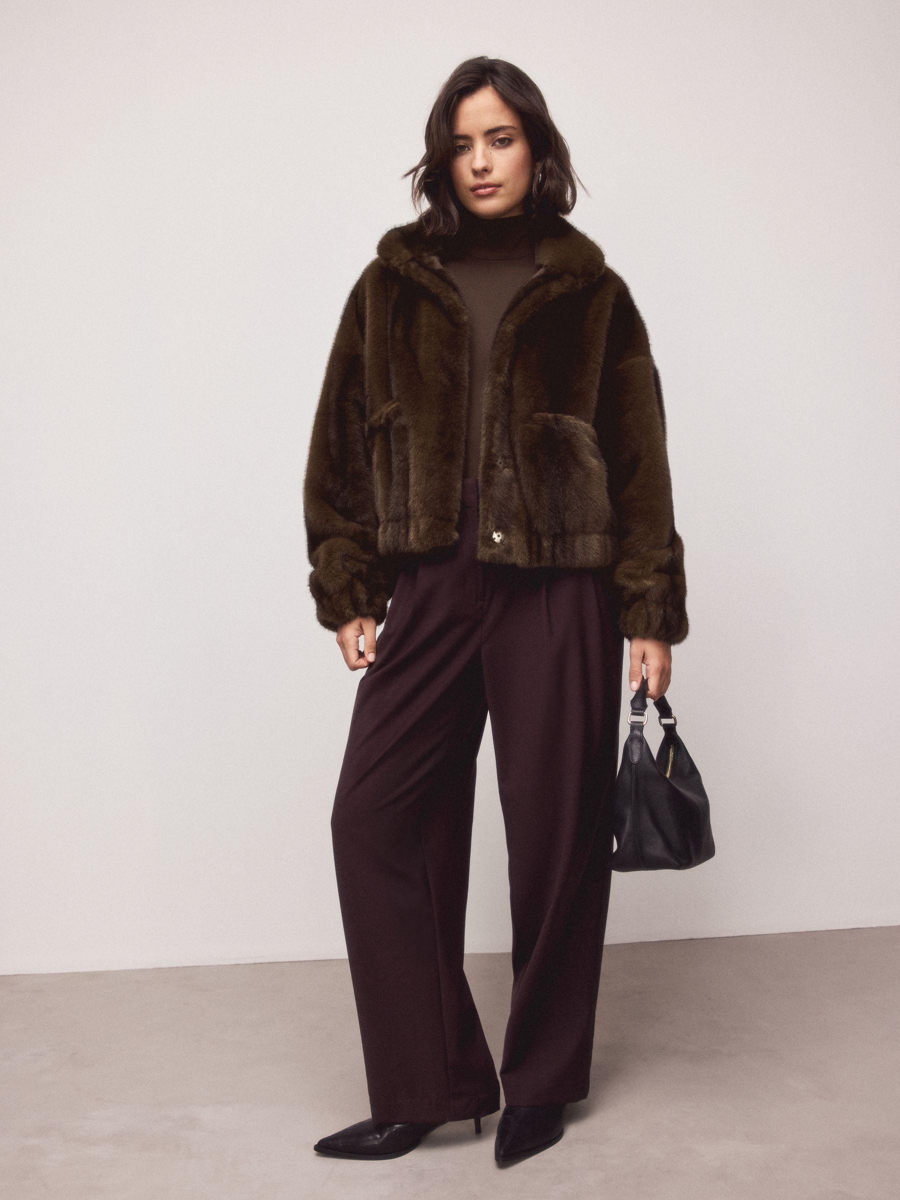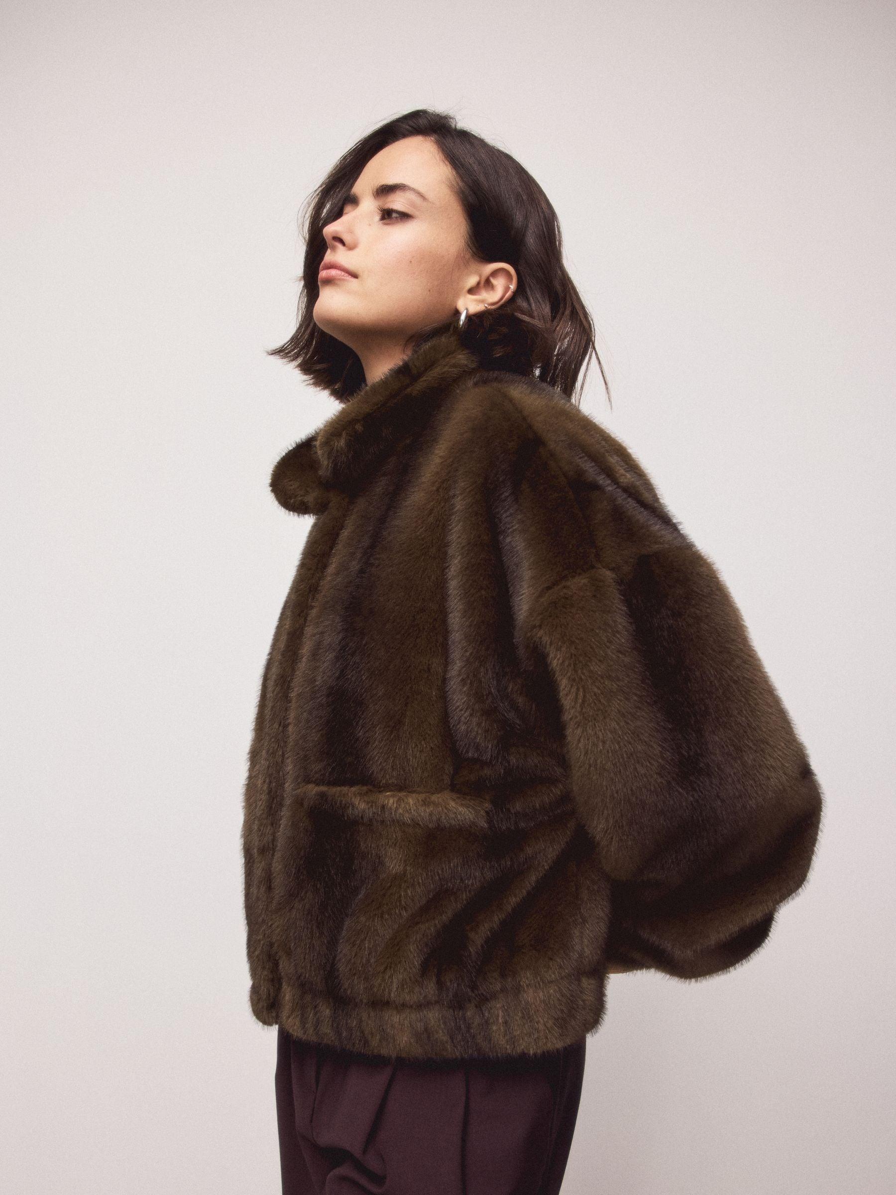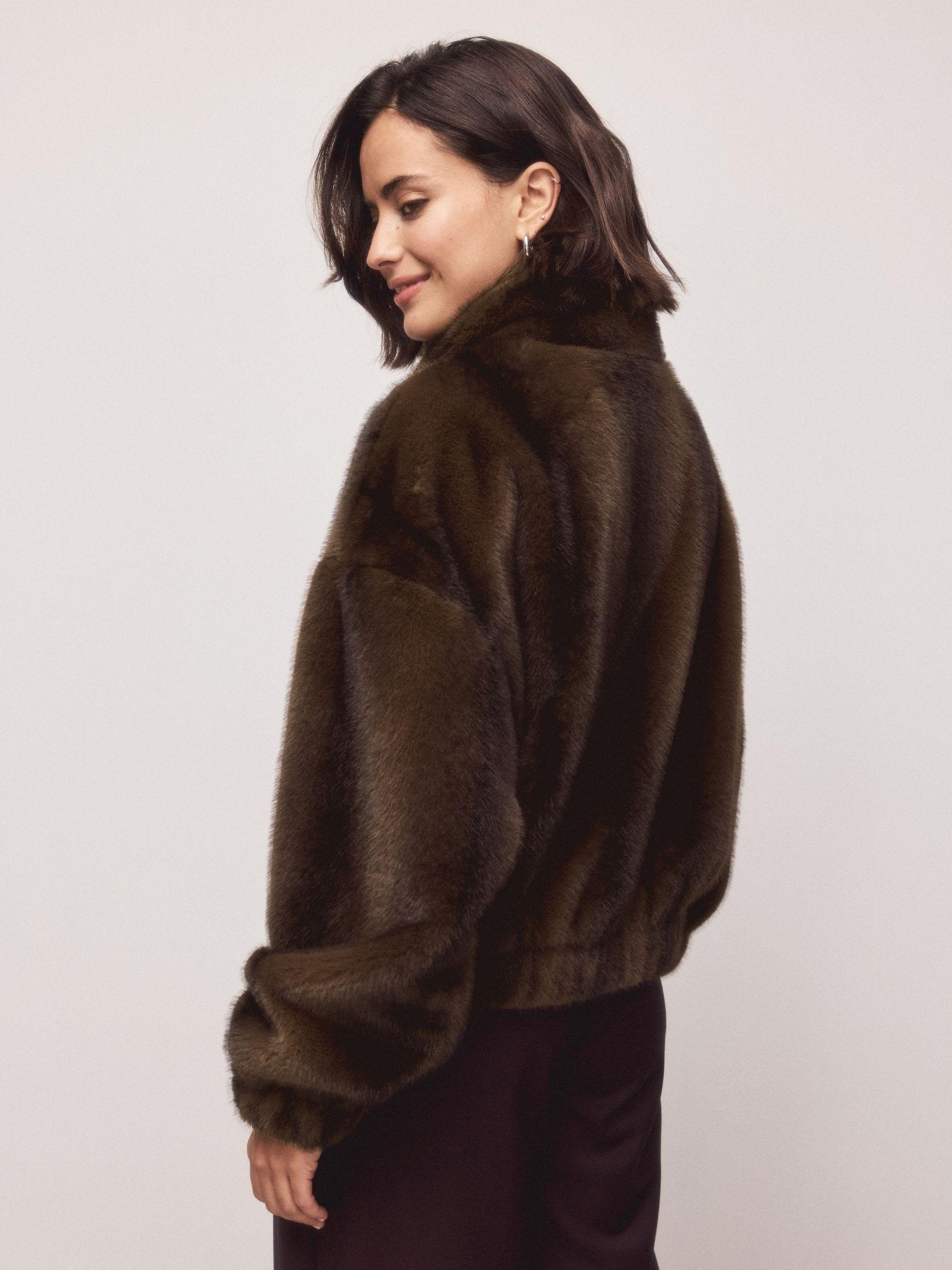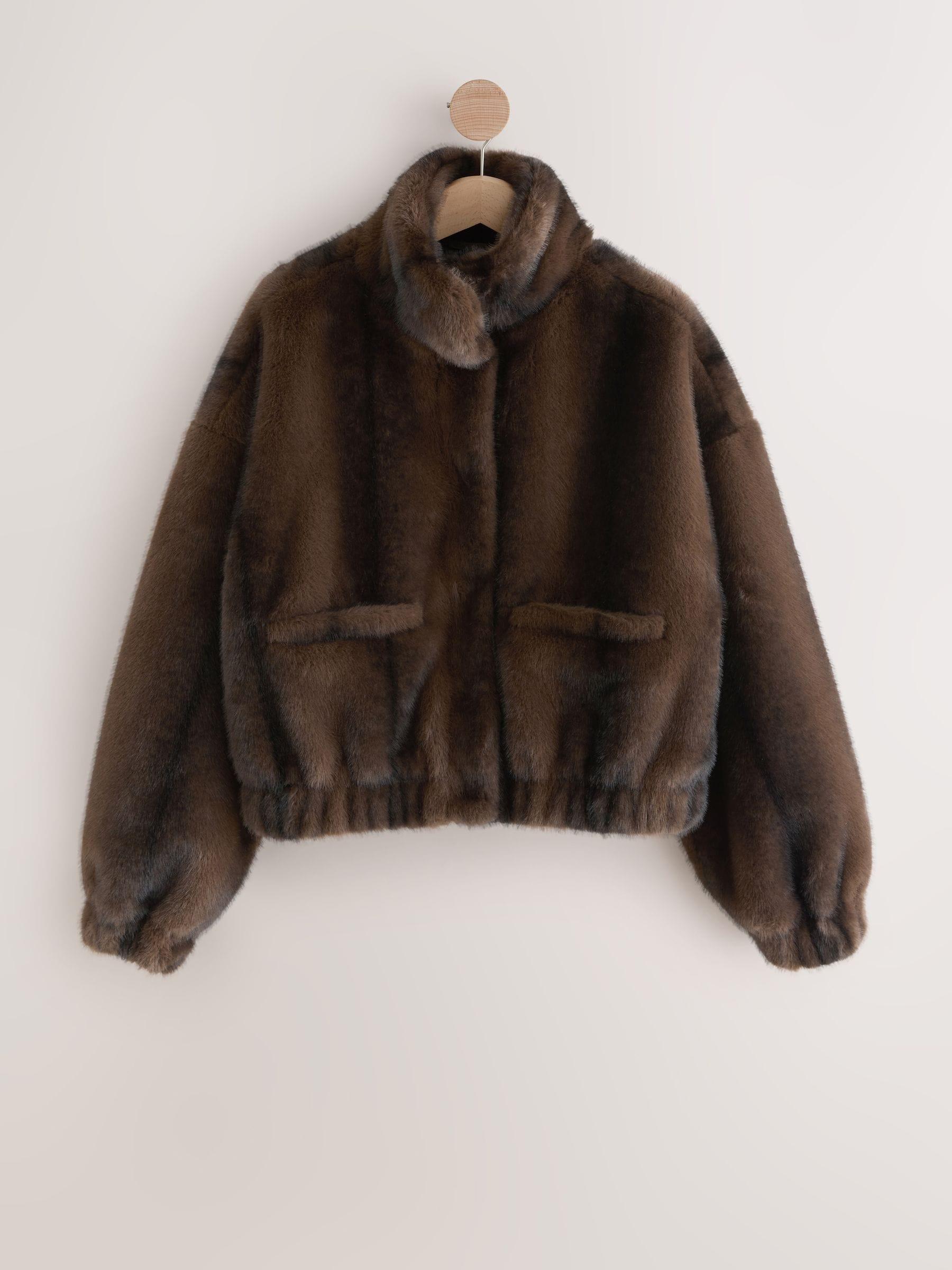 Chocolate Brown Soft Touch Faux Fur Funnel Neck Bomber Jacket