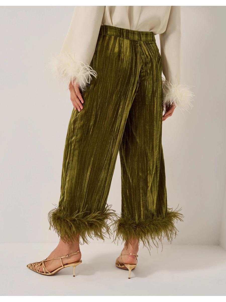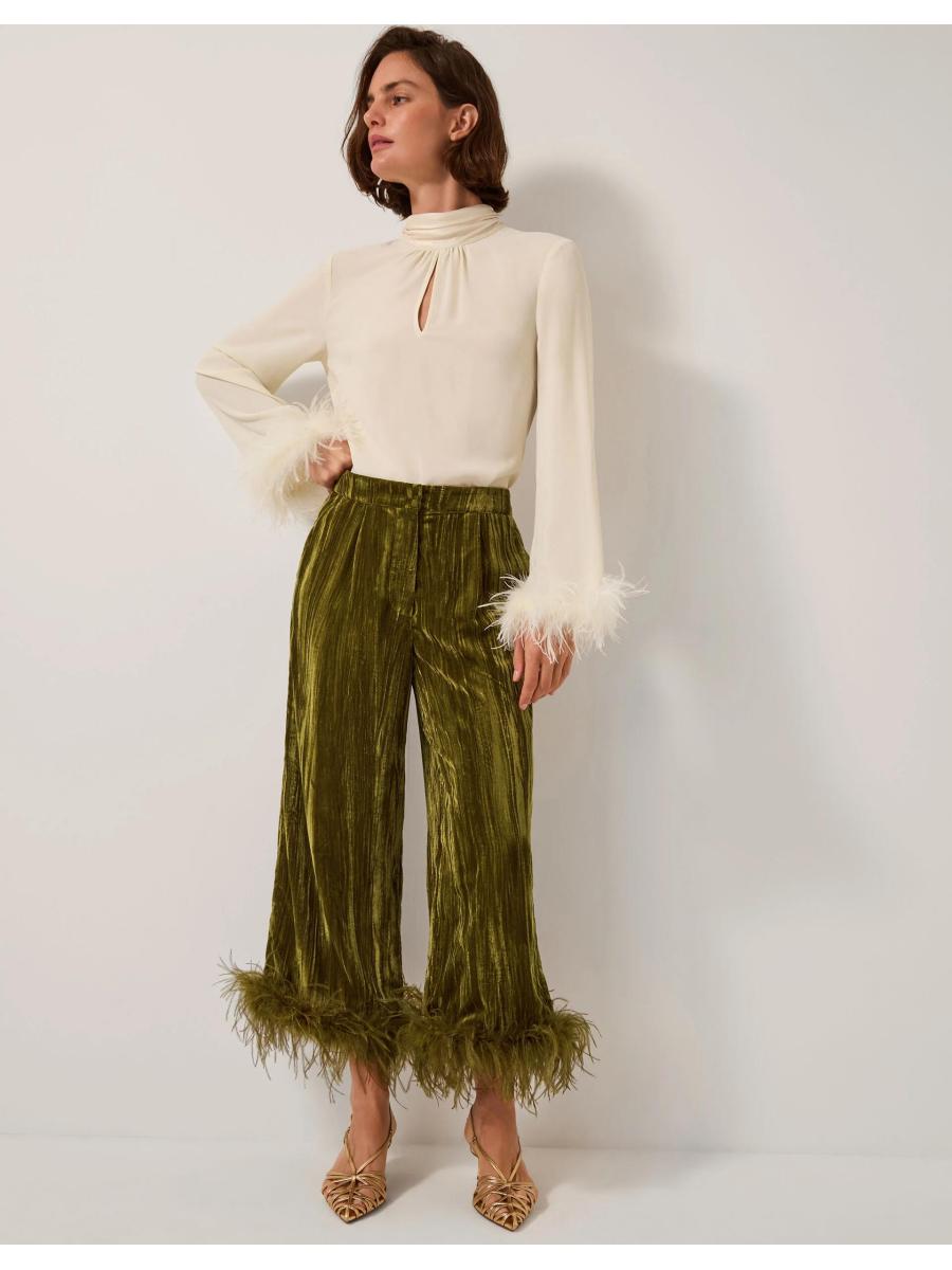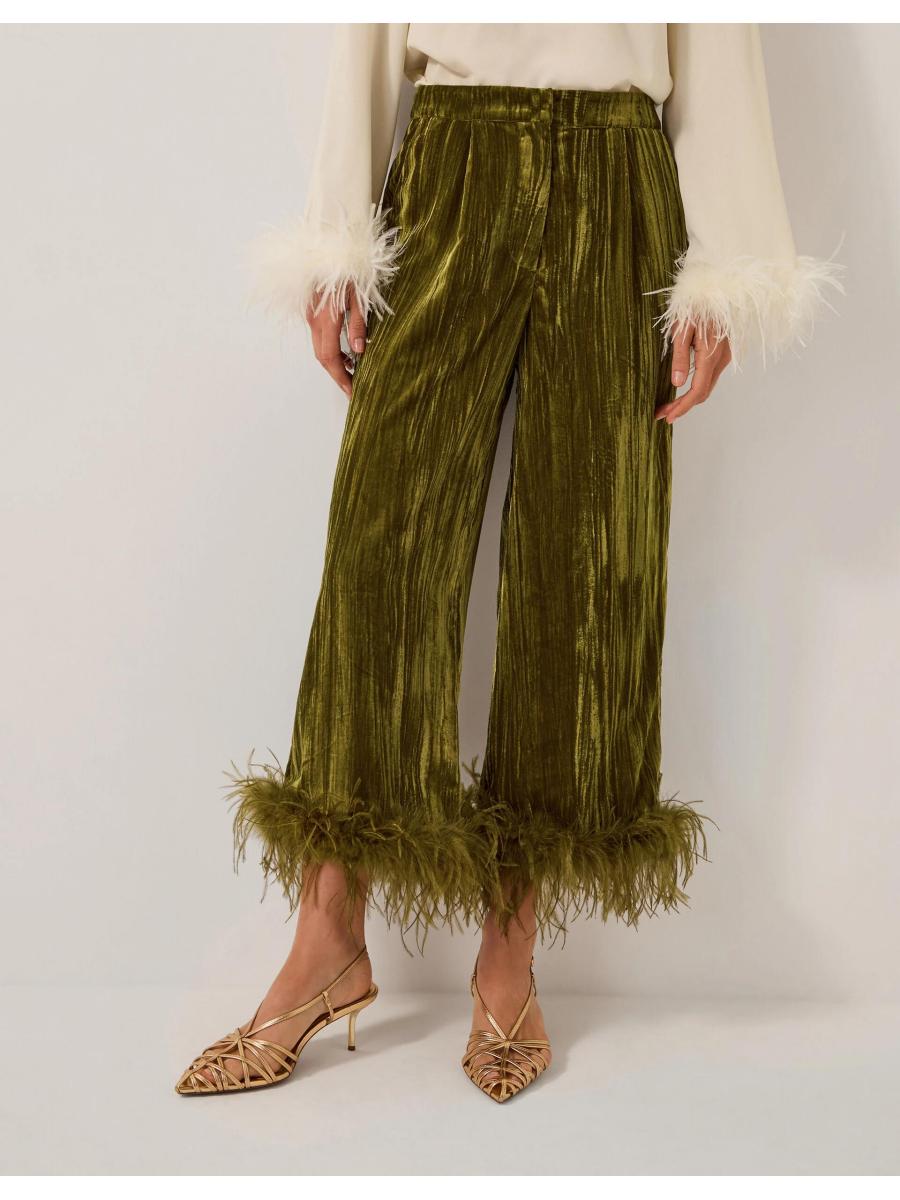 Dial up the drama. Designed with feathery cuffs, this plisse trousers are true showstoppers. Whether you style them with a classic blouse or the matching jacket for the full effect, they're a wonderful addition to your occasion wear collection. Green