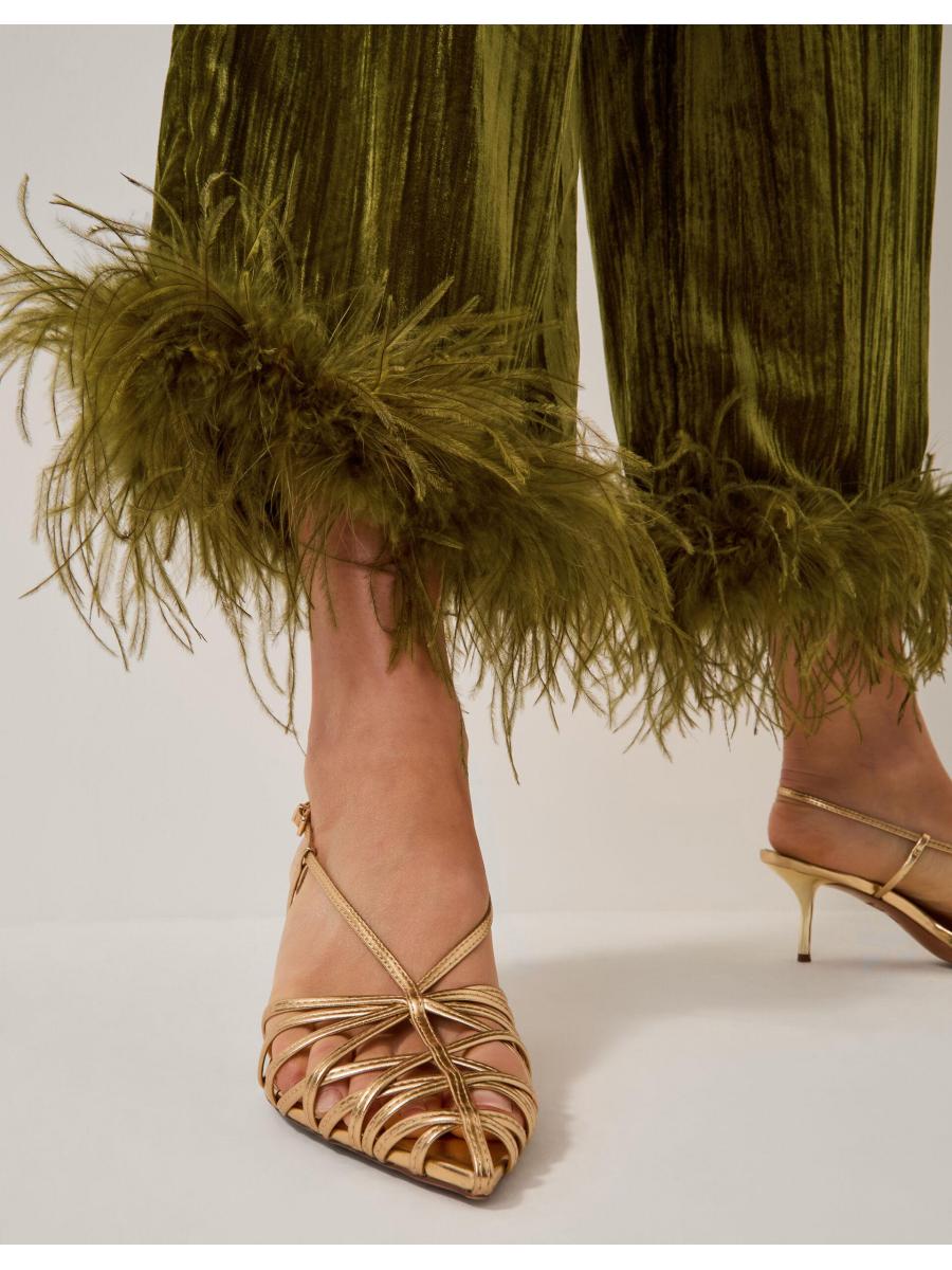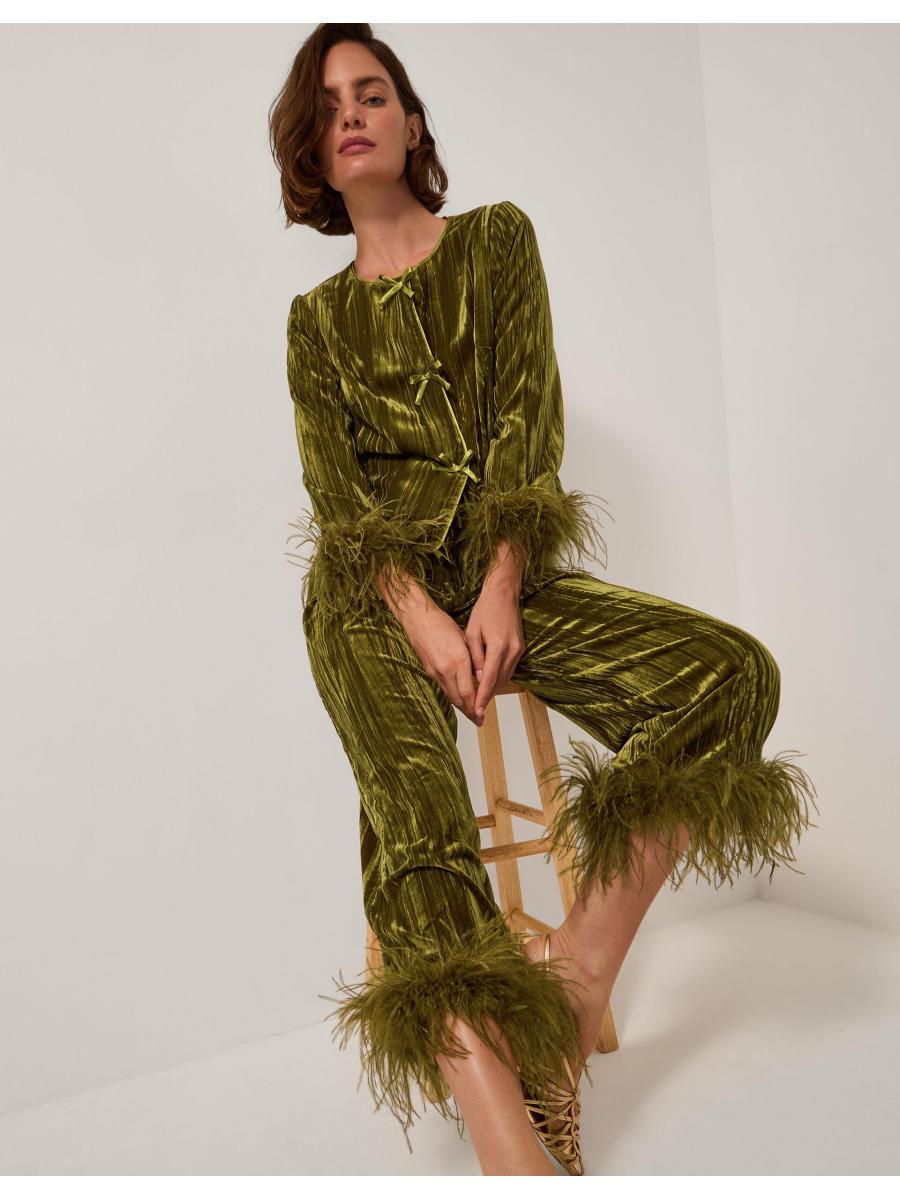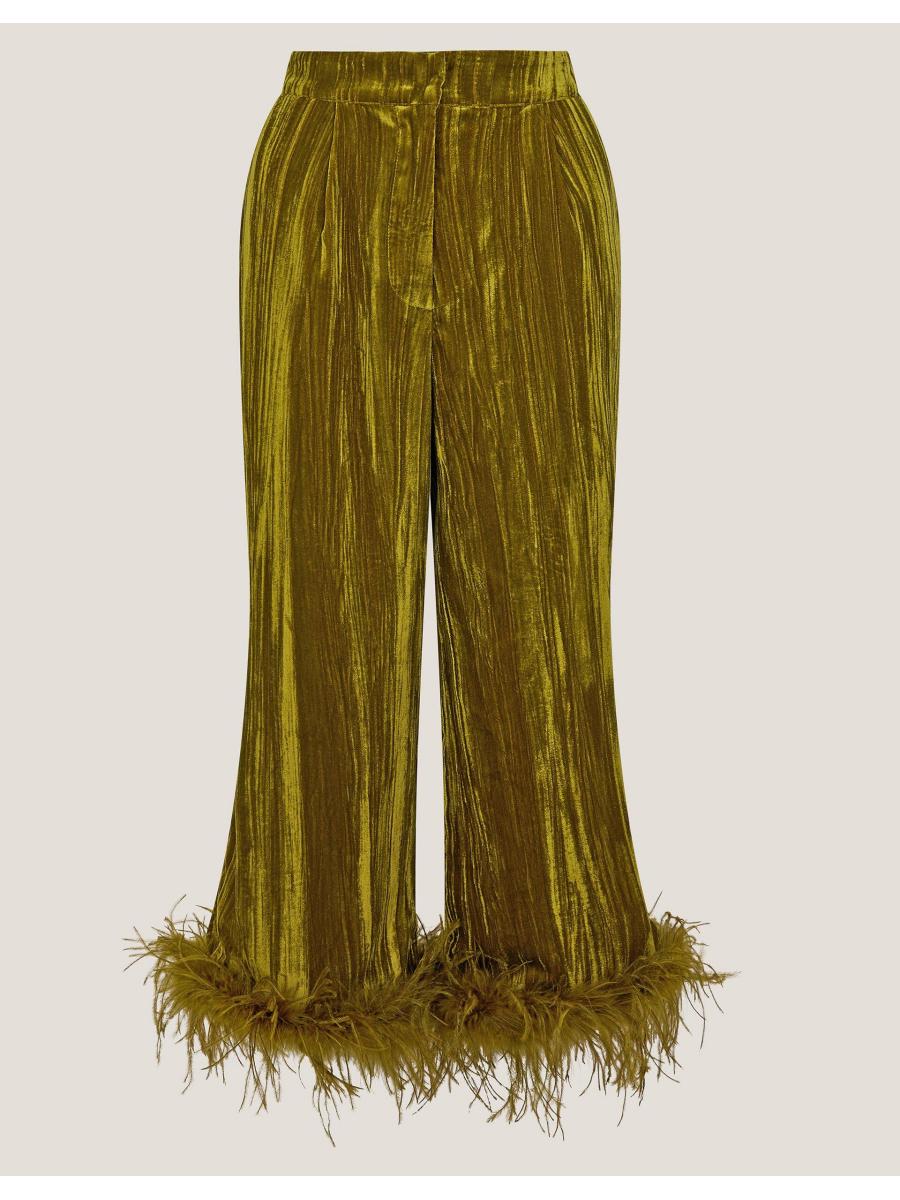 Dial up the drama. Designed with feathery cuffs, this plisse trousers are true showstoppers. Whether you style them with a classic blouse or the matching jacket for the full effect, they're a wonderful addition to your occasion wear collection. Green