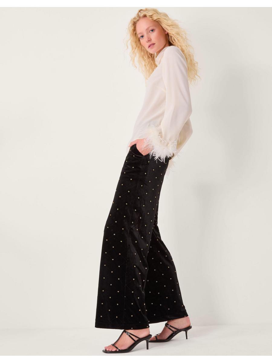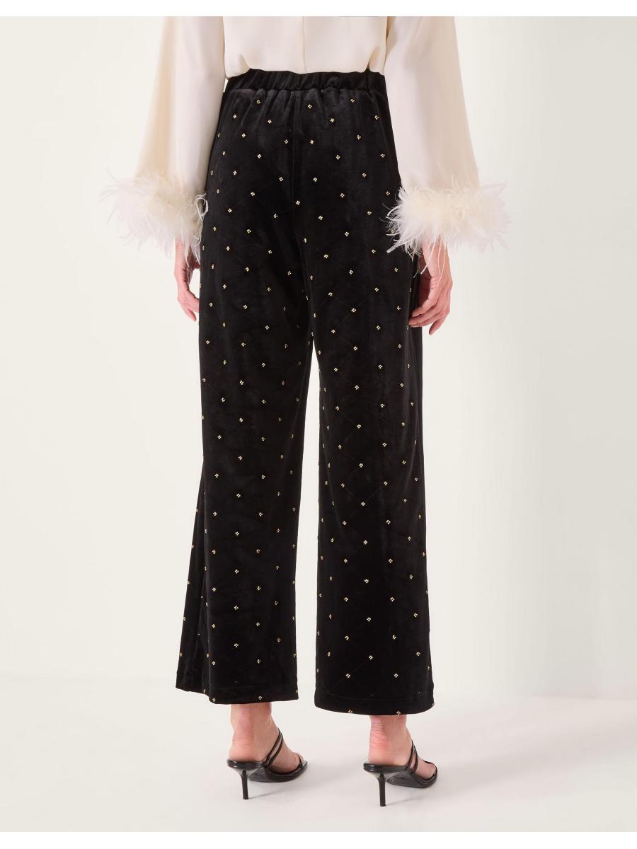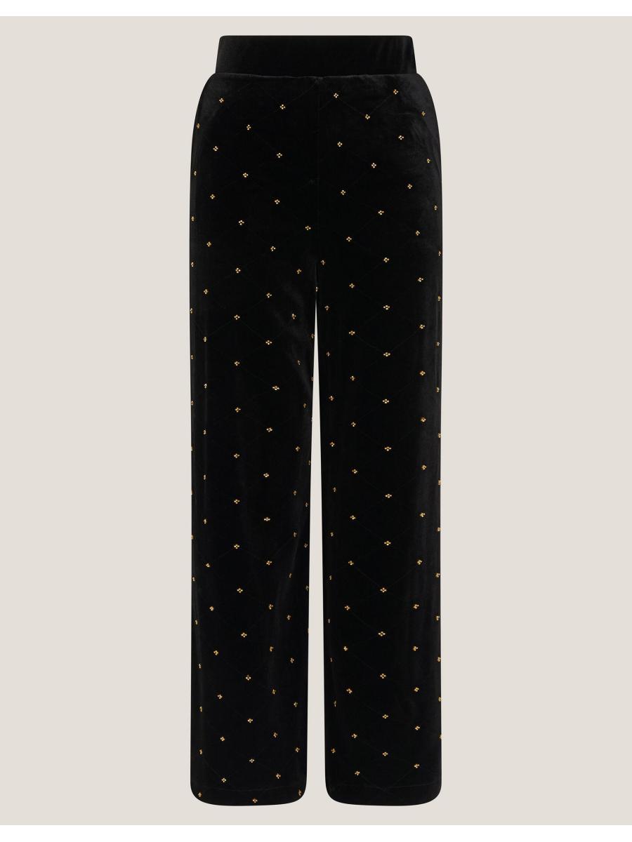 Description It's velvet time, baby! A top contender for party season, these trousers make a statement with every stride. Designed in velvet with a lightly quilted finish, the wide legs are embellished with clusters of gold beads for a touch of sparkle. Black Details Fabric & Details Outer: Elastane 9% , Polyester 91% L 77 CM 30 degree wash Pull on Embroidered Weight: 310.0 ID: 10018980001b-details__content-item"> Outer: Elastane 9% , Polyester 91%