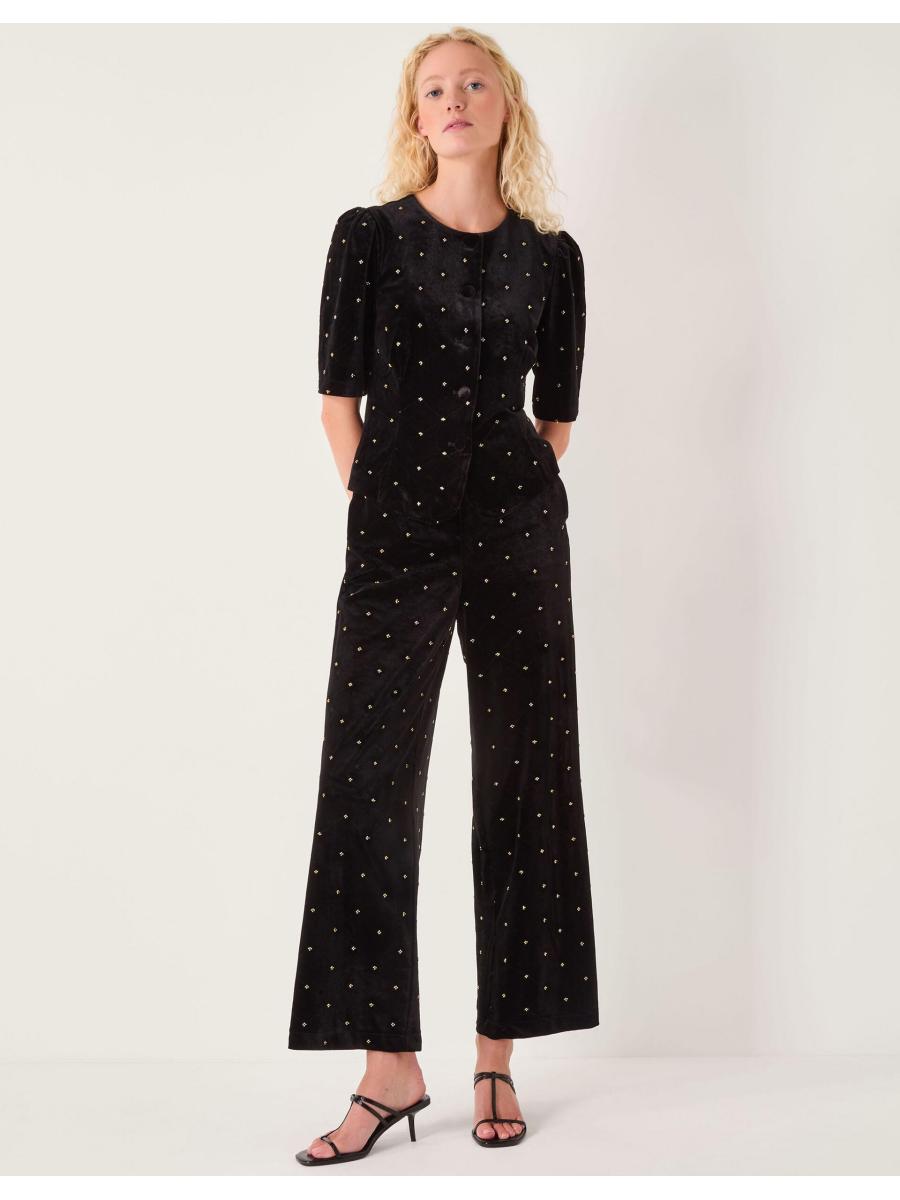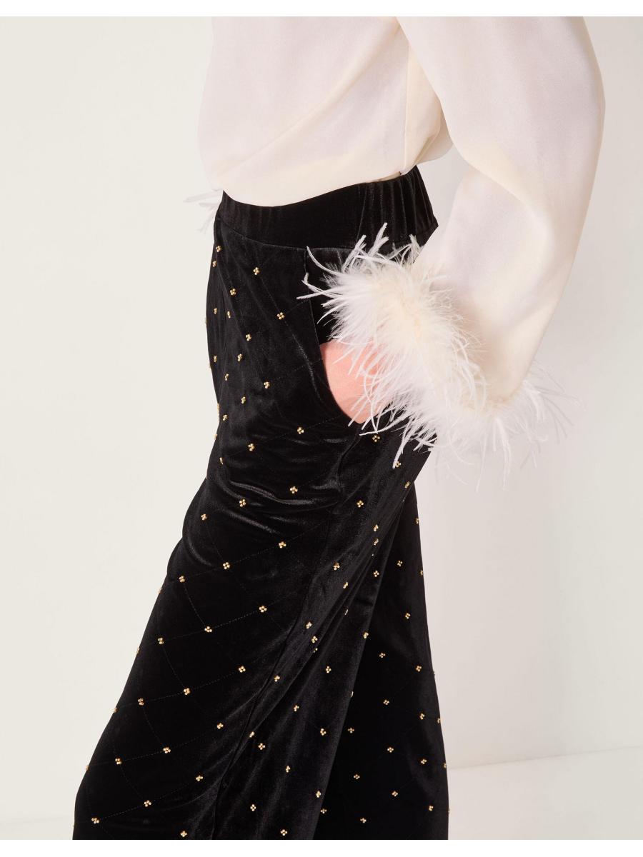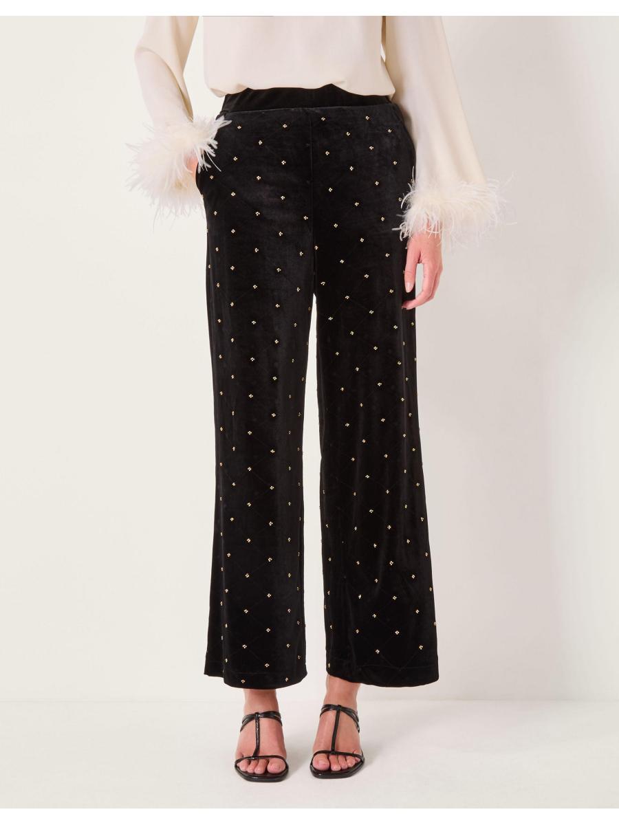Description It's velvet time, baby! A top contender for party season, these trousers make a statement with every stride. Designed in velvet with a lightly quilted finish, the wide legs are embellished with clusters of gold beads for a touch of sparkle. Black Details Fabric & Details Outer: Elastane 9% , Polyester 91% L 77 CM 30 degree wash Pull on Embroidered Weight: 310.0 ID: 10018980001b-details__content-item"> Outer: Elastane 9% , Polyester 91%
