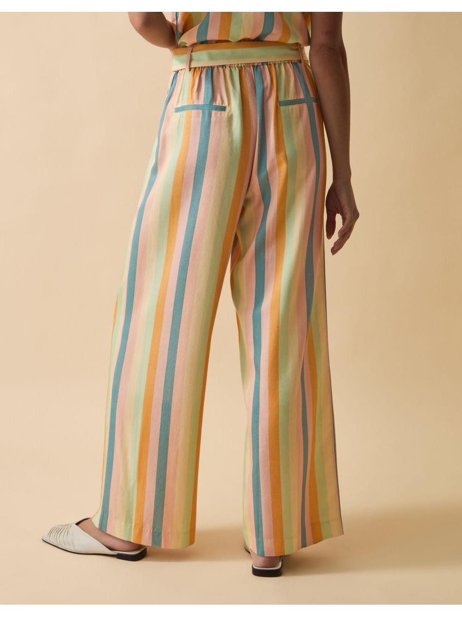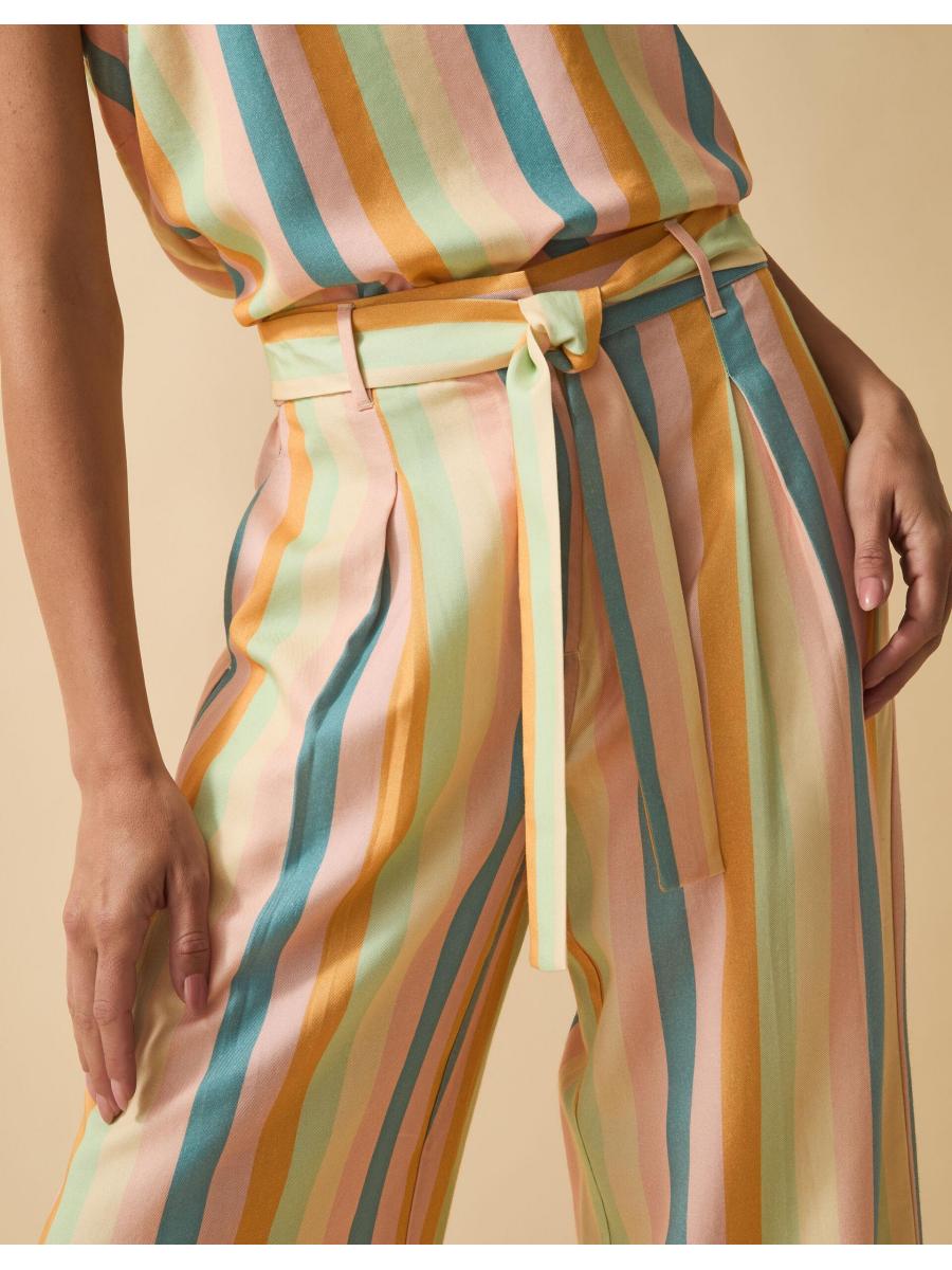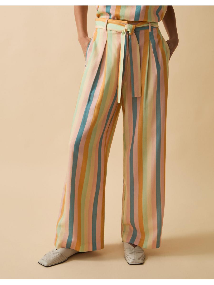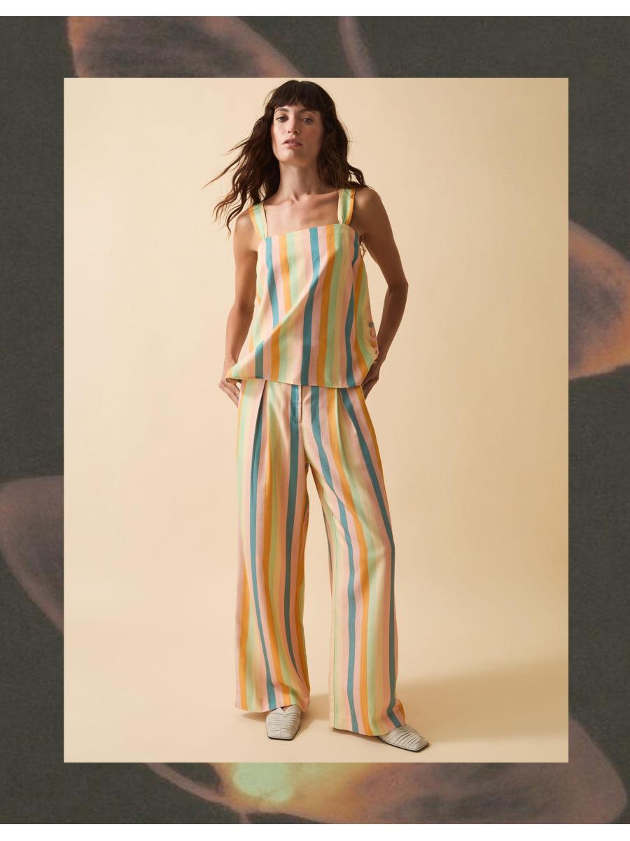 The product: Dopamine dressing. Incorporate some fun into your wardrobe of wonders with these trousers. Slung high on the waist, they're cut in a wide leg silhouette and patterned with bold stripes in soft, pastel colours. Looking to make a statement? Style with the matching top.