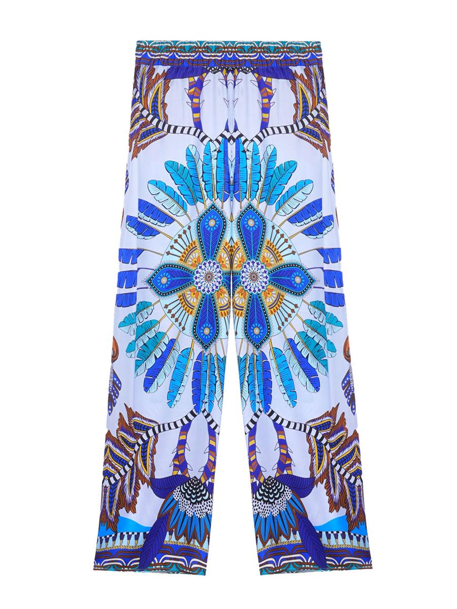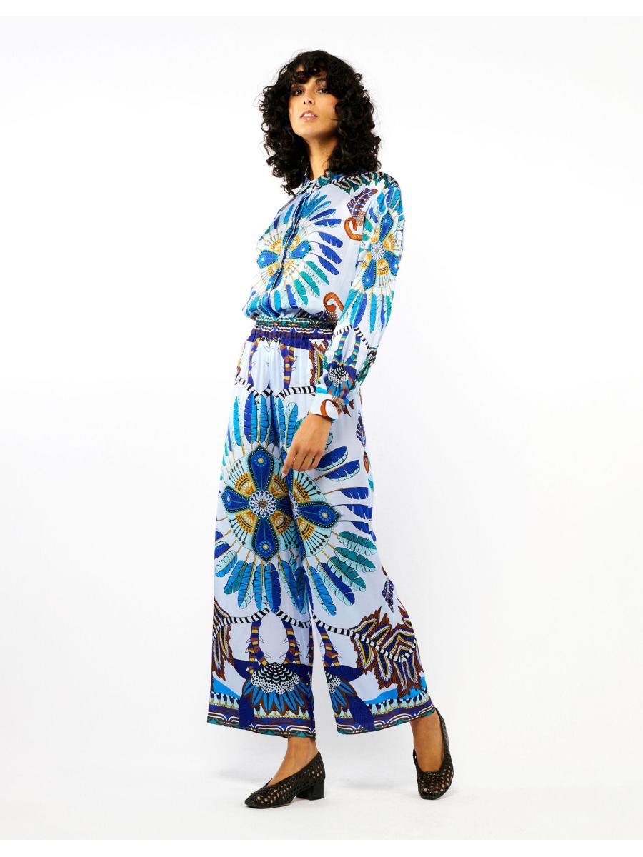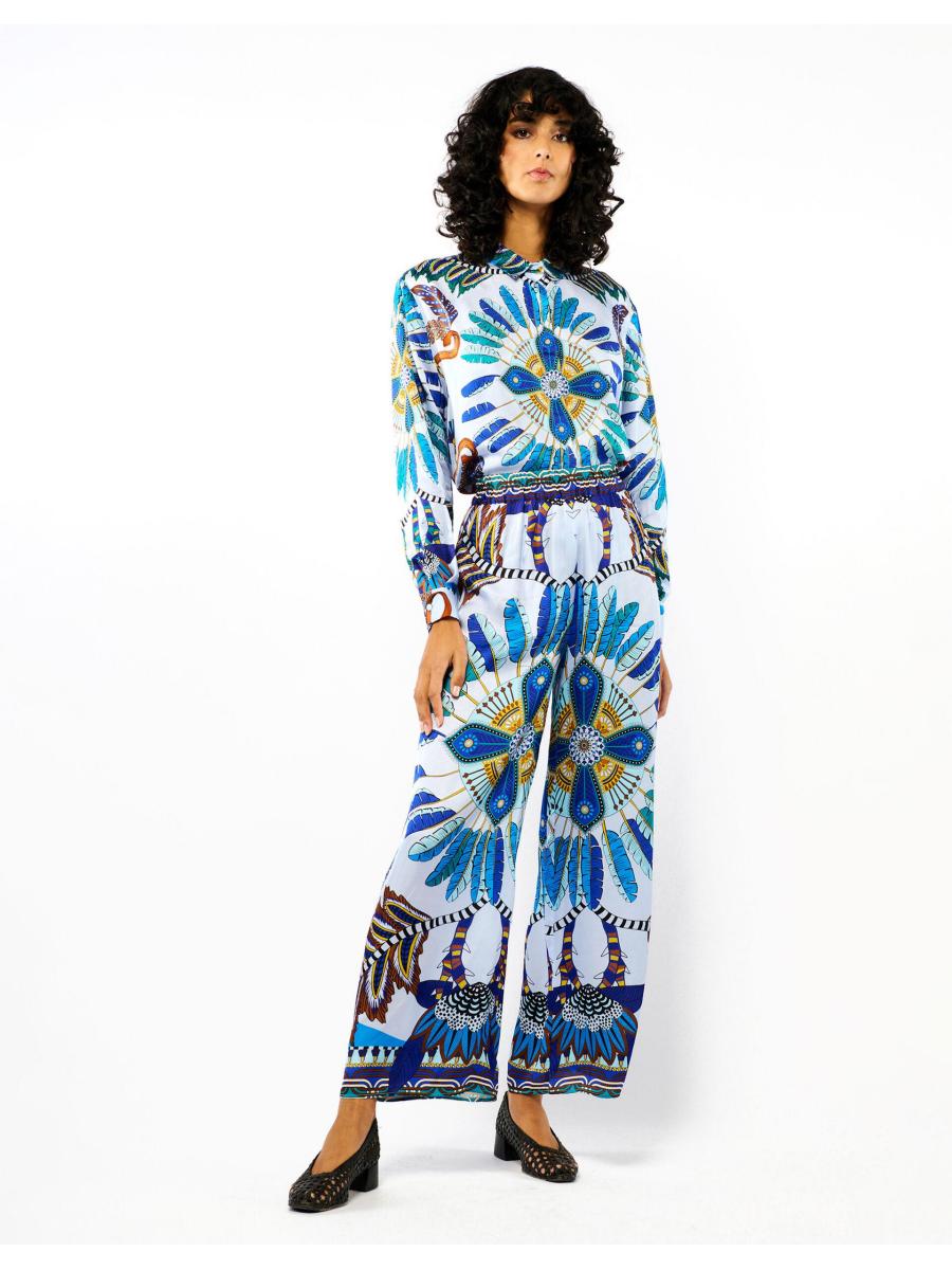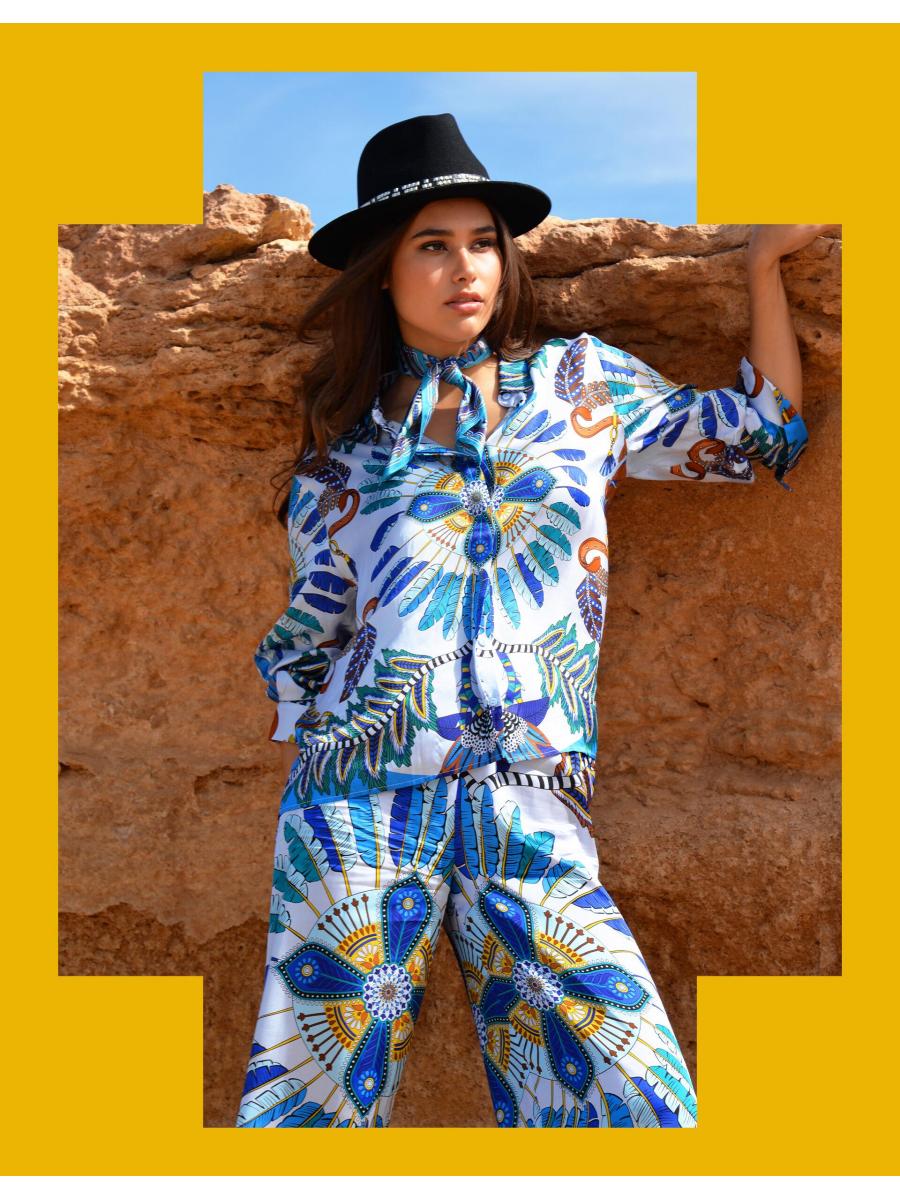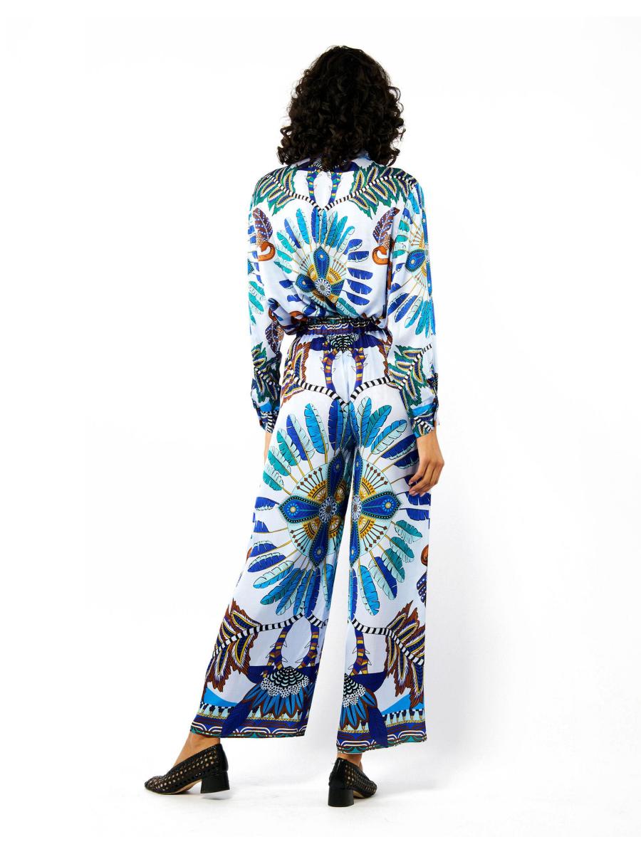 The product: In full plume. A style every maximalist will love, these wide leg trousers showcase symmetrical patterns of decorative motifs and feathers in vibrant blue and golden tones. Create a bold, co-ordinated look with the matching Bonaventure Shirt.