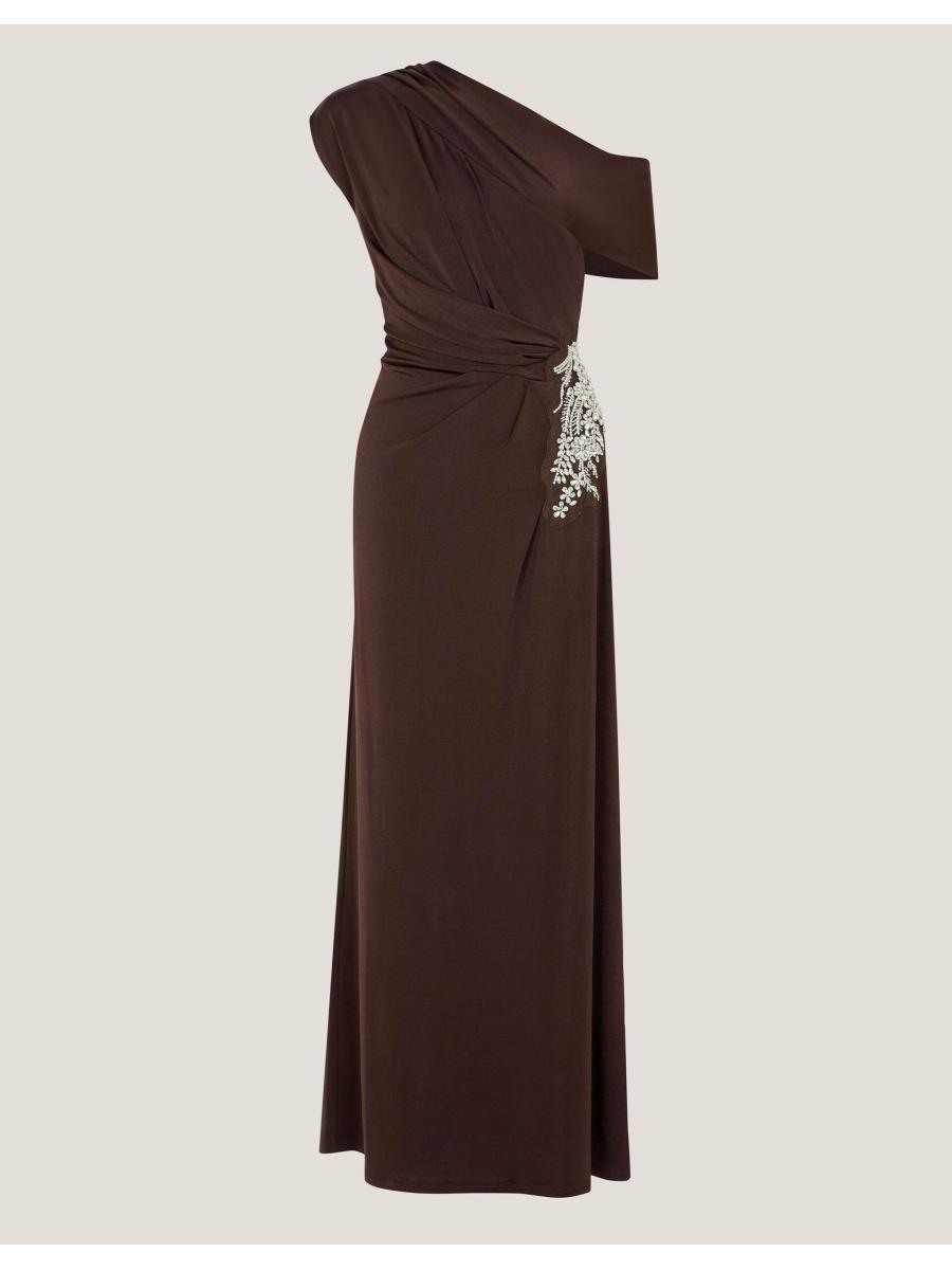 Description It's cocktail hour. Embellished with sparkly florals that trail down the hip, this one shoulder dress elegantly wraps around you with its asymmetrical neckline and ruched detailing. Falling below the ankles, it's a dazzling addition to your party collection. Brown Details Fabric & Details Outer: Elastane 8% , Polyester 92% L 125 CM machine wash Pull on Slash neck Short sleeves Embroidered Weight: 215 ID: 10019320063b-details__content-item"> Outer: Elastane 8% , Polyester 92%