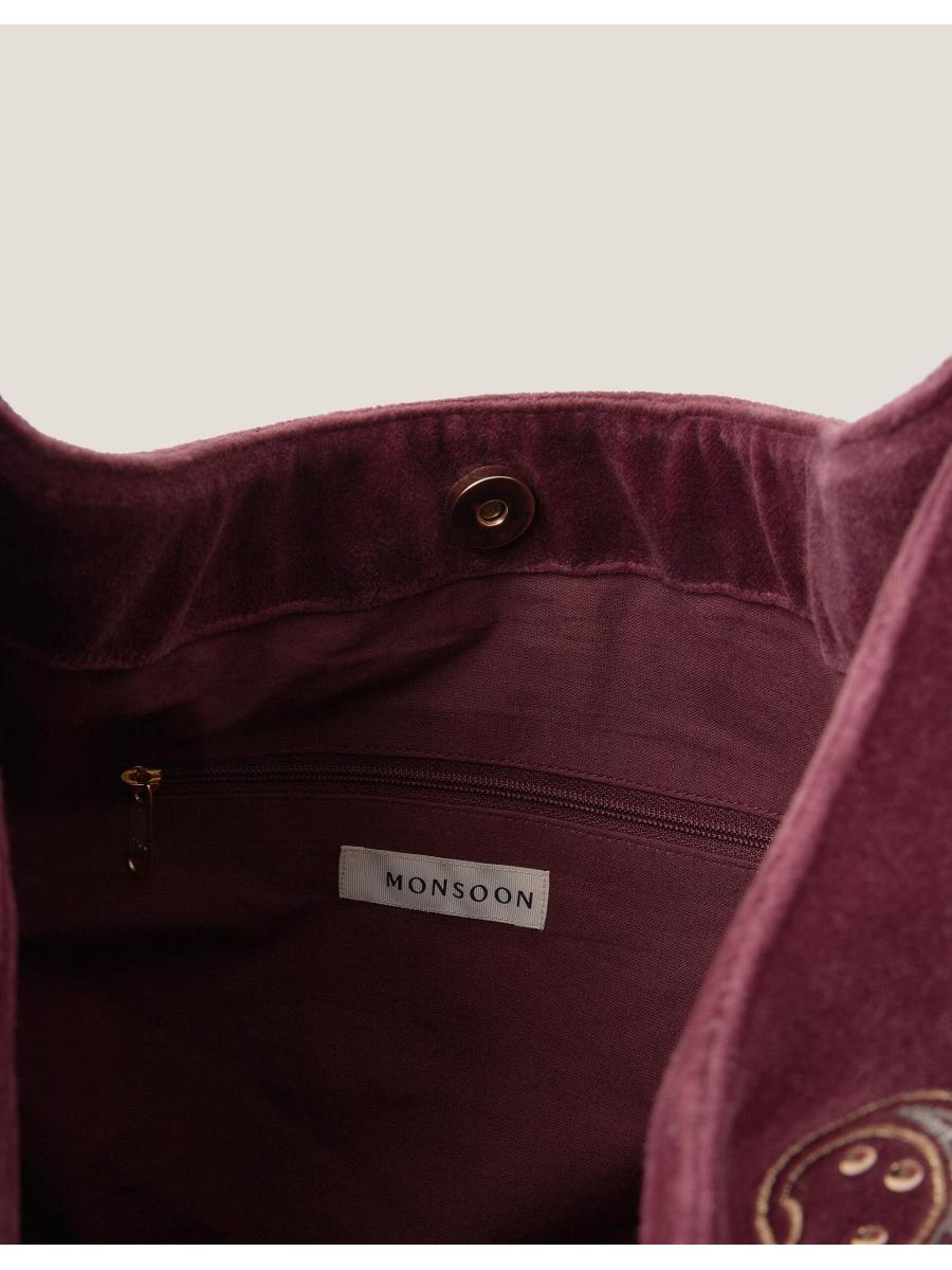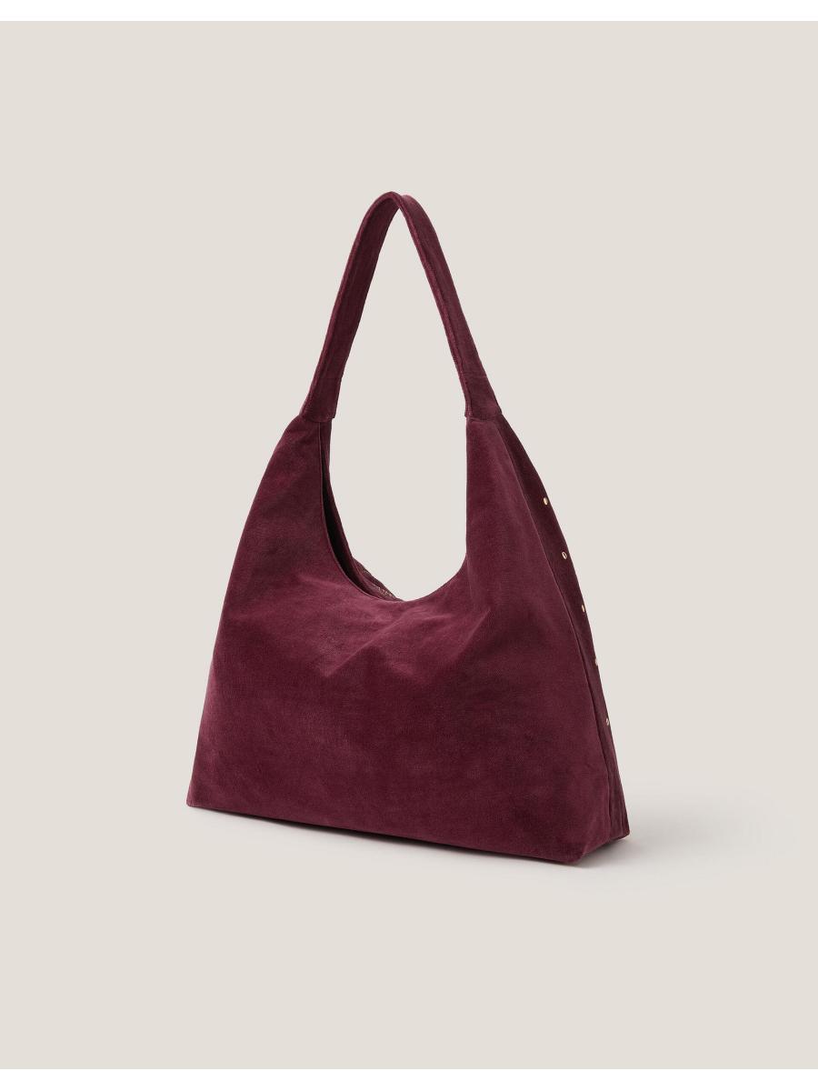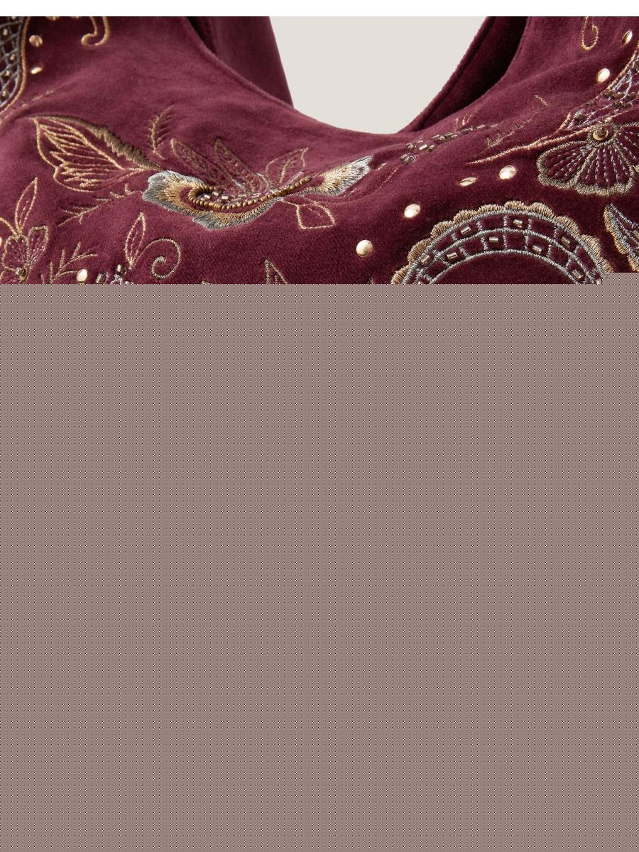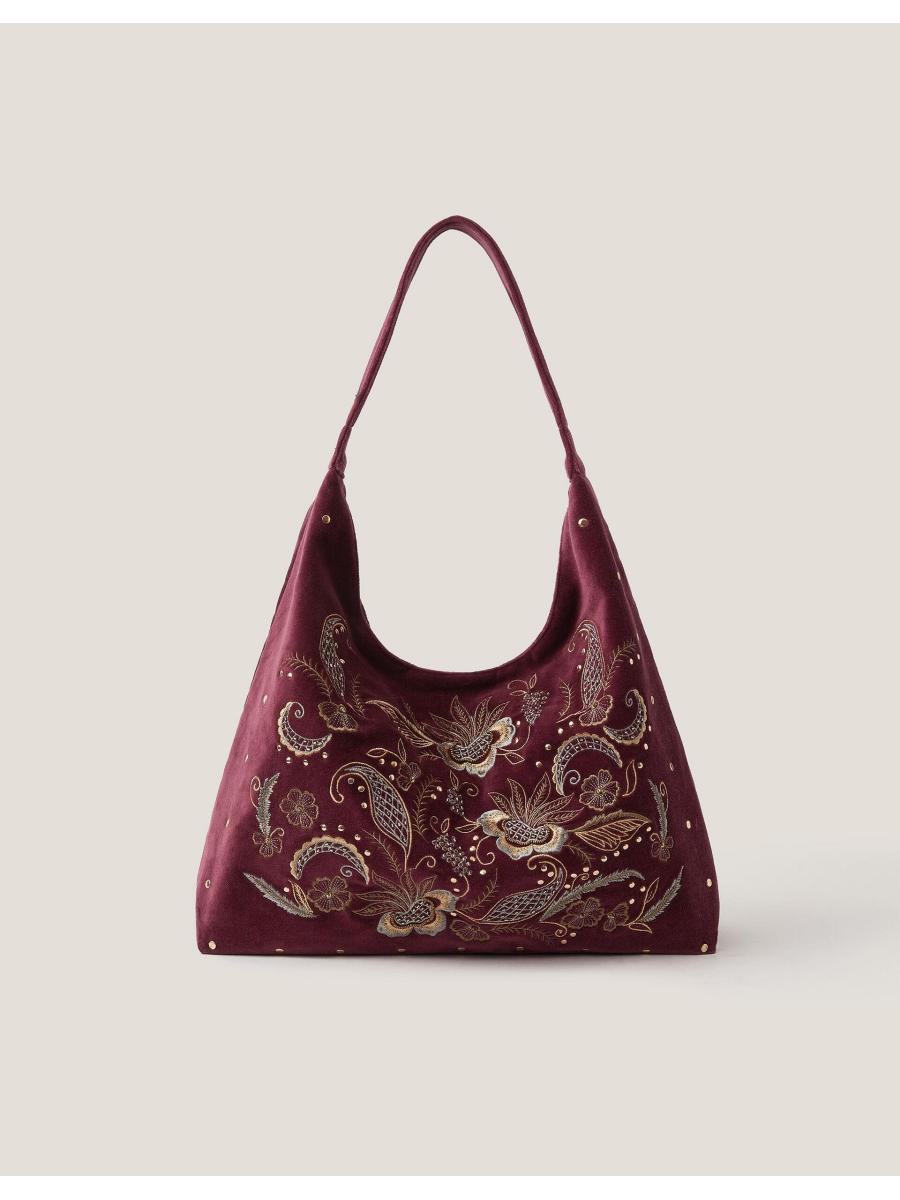 Because everyday essentials must travel in style. Bringing bags of boho vibes to all your looks, this shoulder bag boasts a slouchy chic structure in a dreamy burgundy hue. Decorated with whimsical floral embroidery and gold-tone studs, it features a magnetic button fastening with a small zip pocket inside.