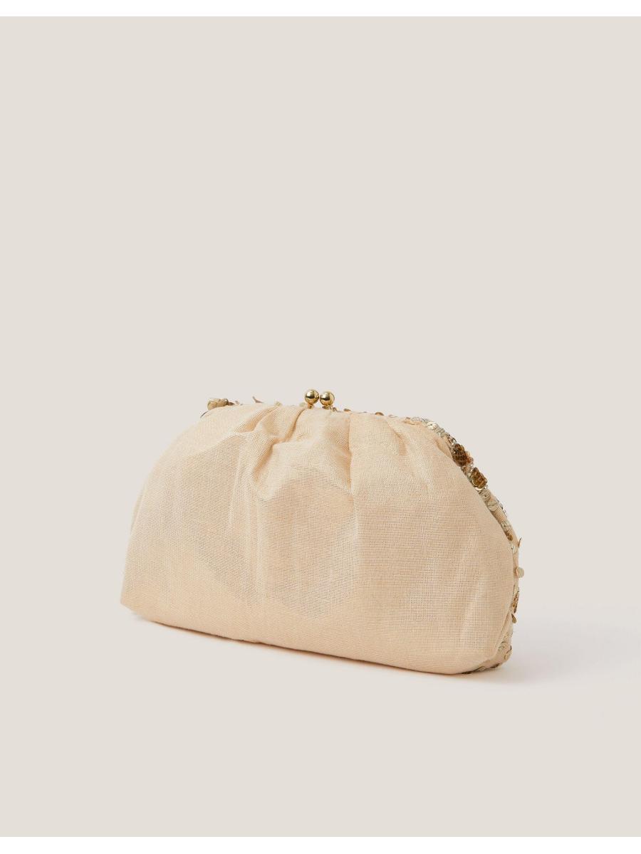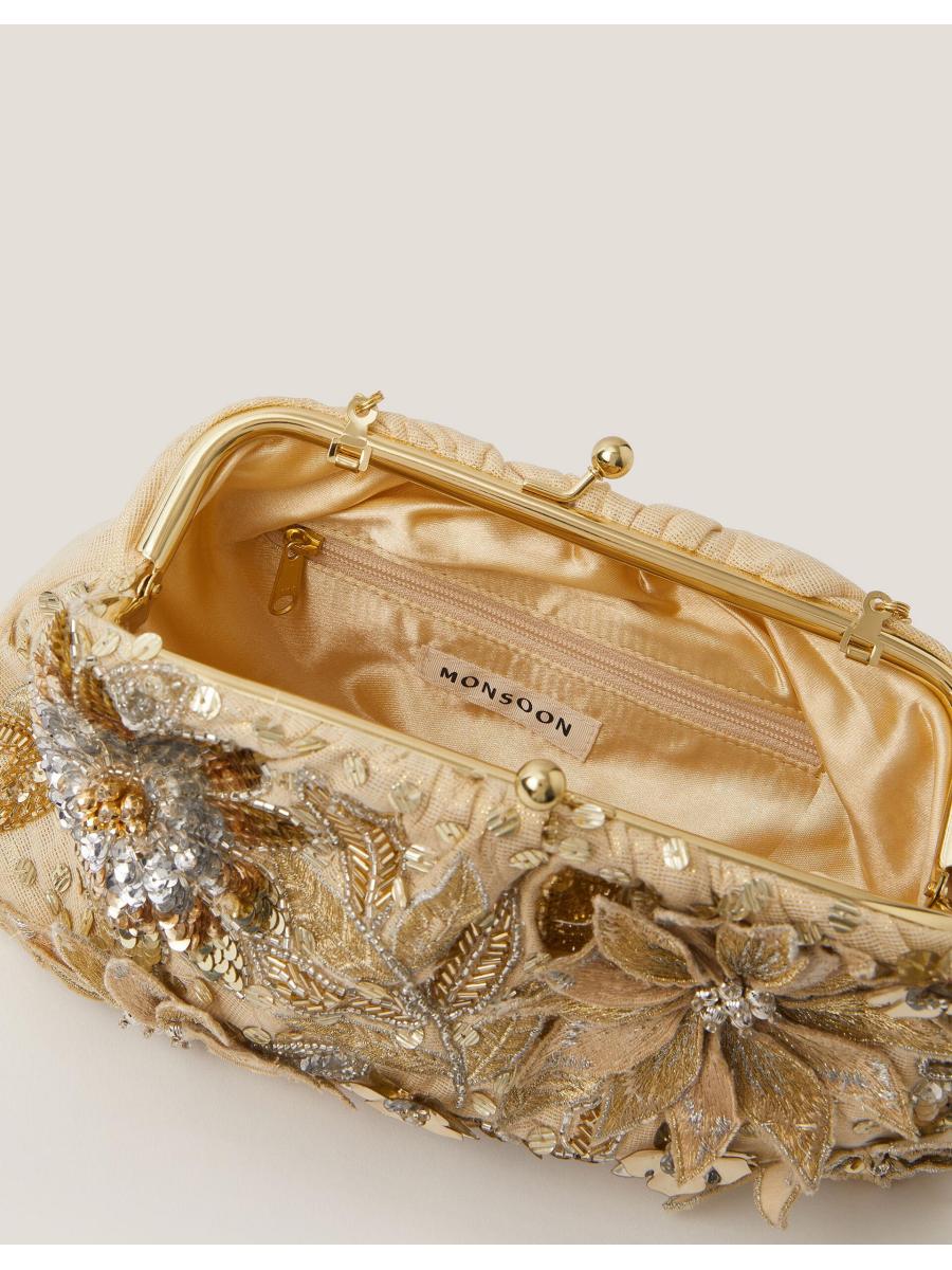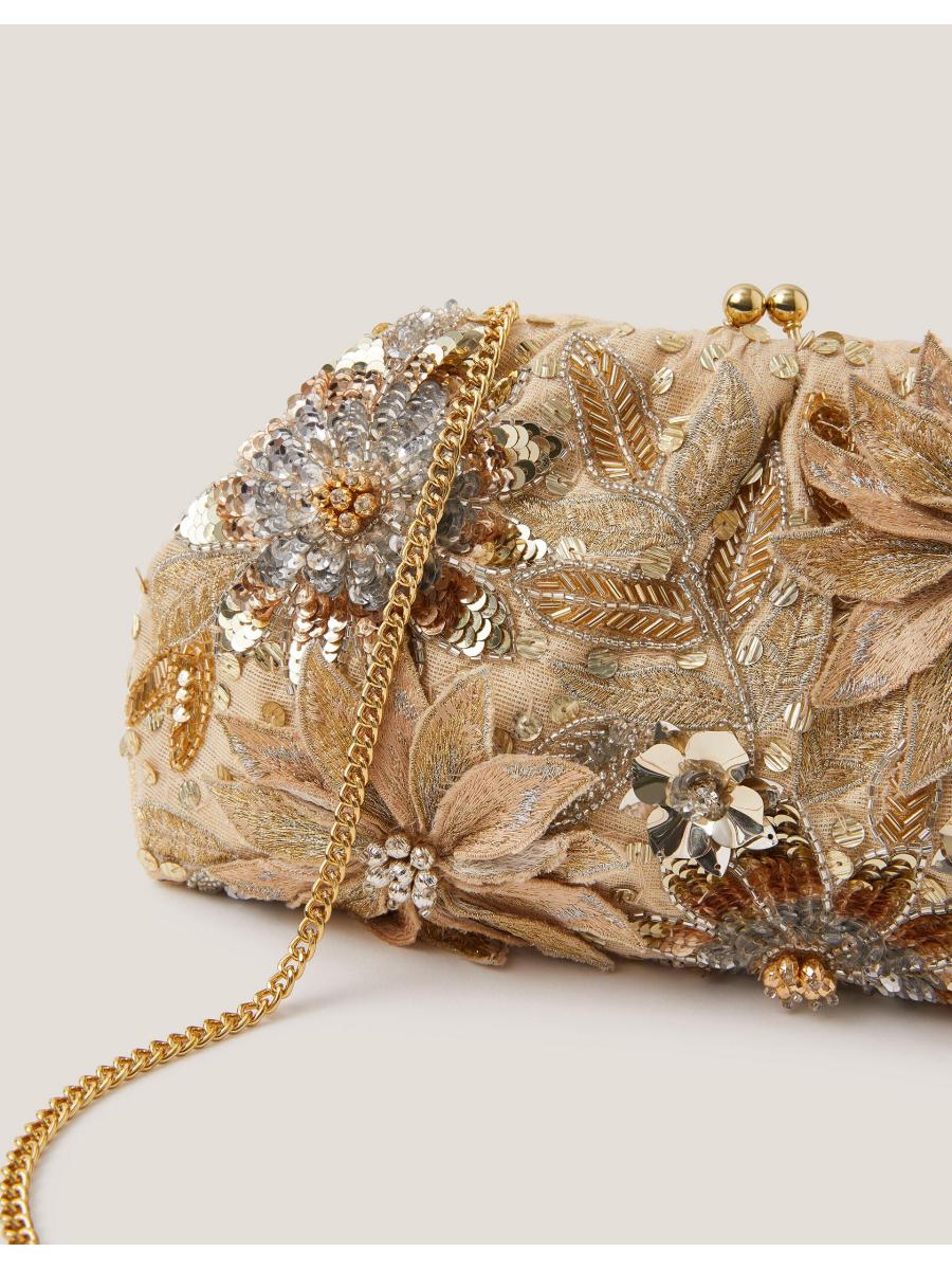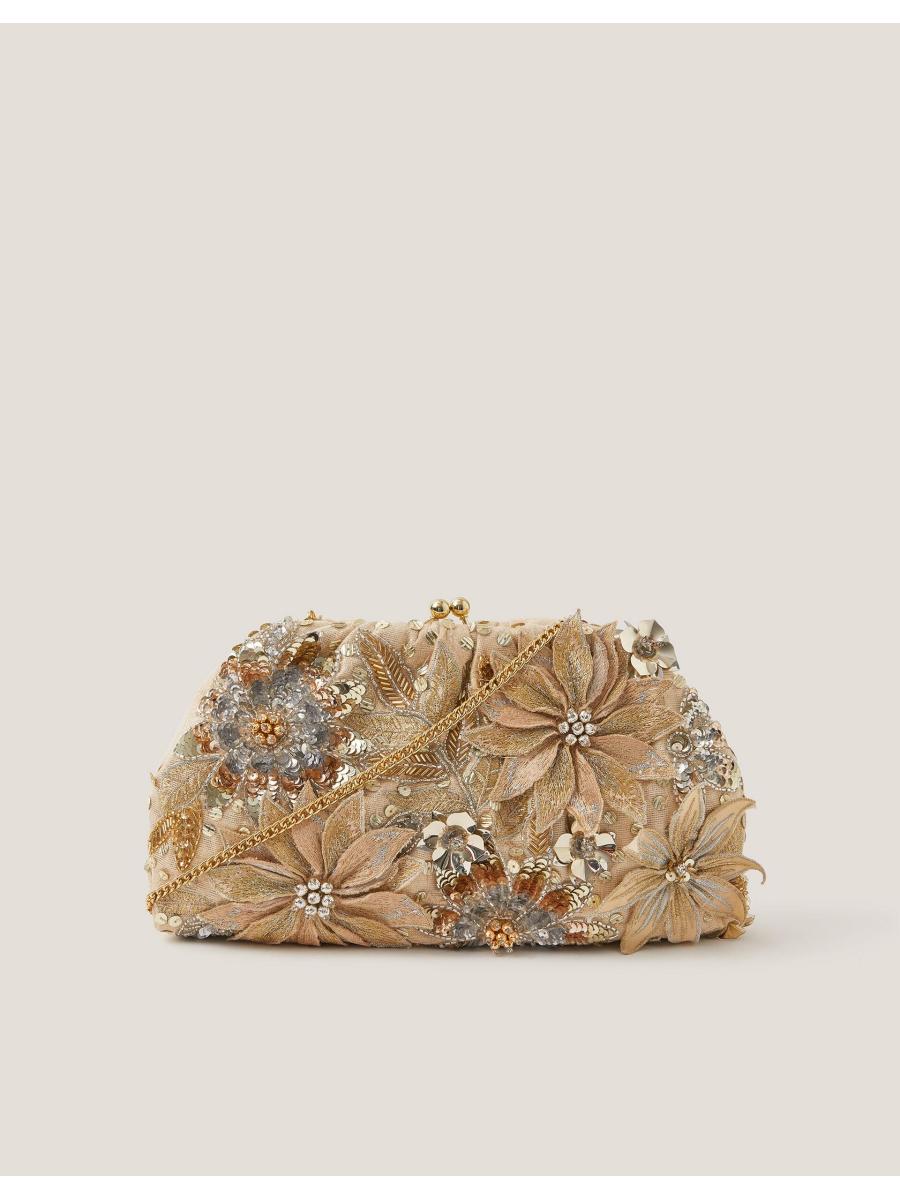 Description Bloomin' lovely. The perfect occasion accessory, this clutch bag is designed with a clip frame profile and decorated with 3D embroidery, sequin flowers and beaded embellishments in a mix of metallic tones. Finished with an optional chain strap and inner zip compartment. Gold Details Fabric & Details Outer: Cotton 83% , Metallised Fibre 17% Lining: Polyester 100% H 20 cm x W 27 cm x L 5 CM wipe clean Embroidered Weight: 260.0 ID: 1000866978b-details__content-item"> Outer: Cotton 83% , Metallised Fibre 17% Lining: Polyester 100%