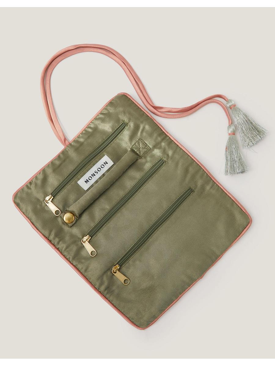 Jetting off for some winter sun? Delicately embroidered with flowers on a luxe velvet backdrop, this jewellery storage roll is a suitcase staple. Designed with three zipped compartments, you can organise all your rings, bracelets and necklaces, saving yourself all the rummaging when you get ready! Finished with a tassel tie for fastening.