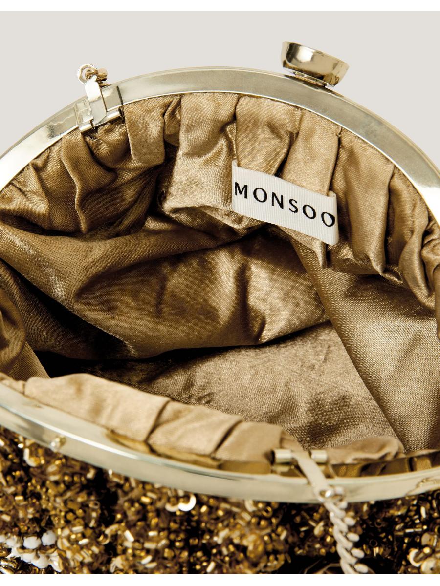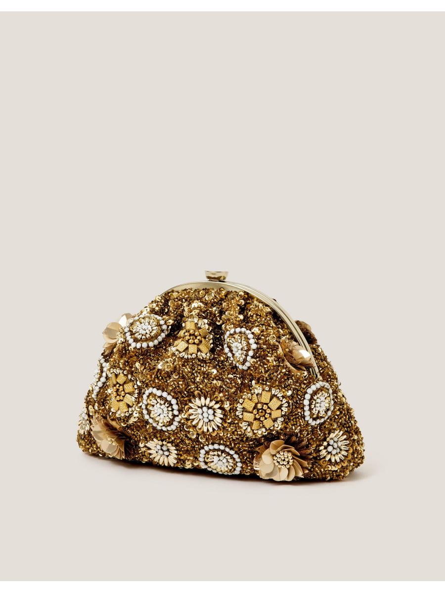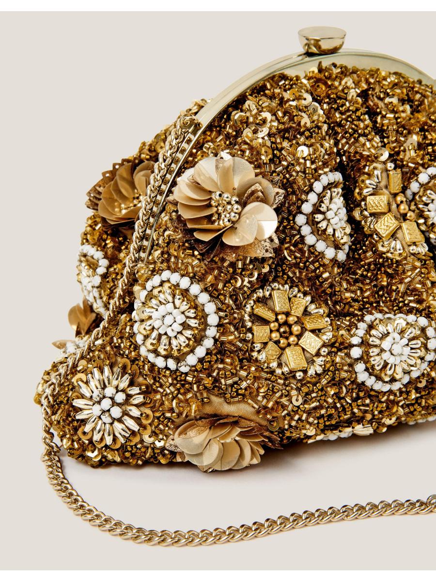 You're so golden. Always a winner for every party look, this clutch bag is embellished with sequins, beads and floral designs in a mix of golden and bronze tones. Open the clip frame fastening to reveal enough space for all your night-out essentials (and an optional chain strap for hands-free dancing and mingling).