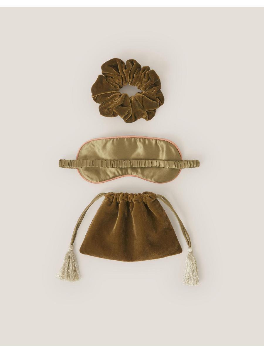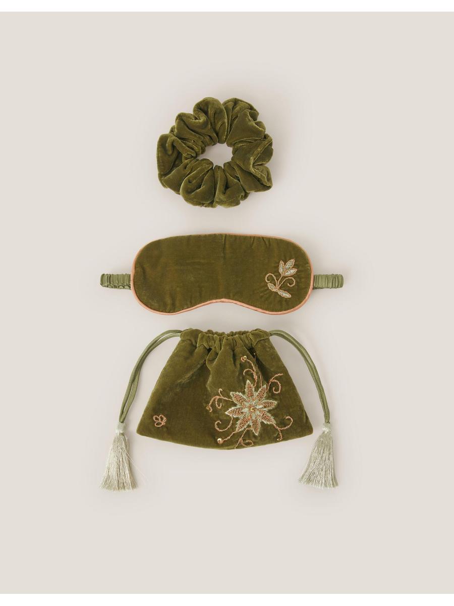 Description Beauty sleep incoming... Embroidered with florals on a velvety soft olive green backdrop, this set will become a necessity for your evening routine. Included is an eye mask, matching scrunchie and a drawstring bag to store it all in when you're on the go. Sweet dreams! Details Fabric & Details Outer: Polyester 100% Lining: Polyester 100% H 13 cm x W 19 cm wipe clean Embroidered Weight: 105.0 ID: 1000918498b-details__content-item"> Outer: Polyester 100% Lining: Polyester 100%
