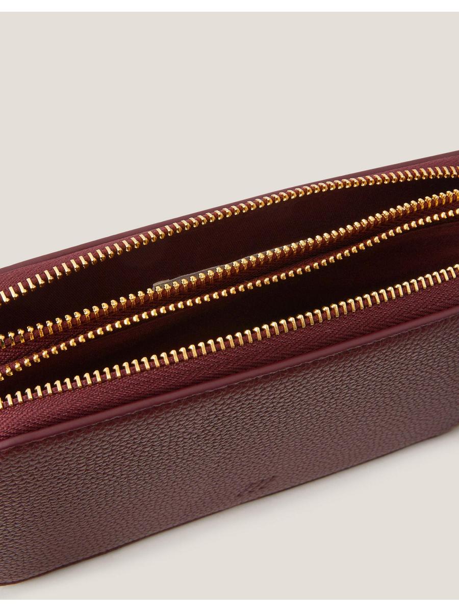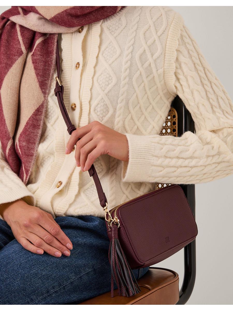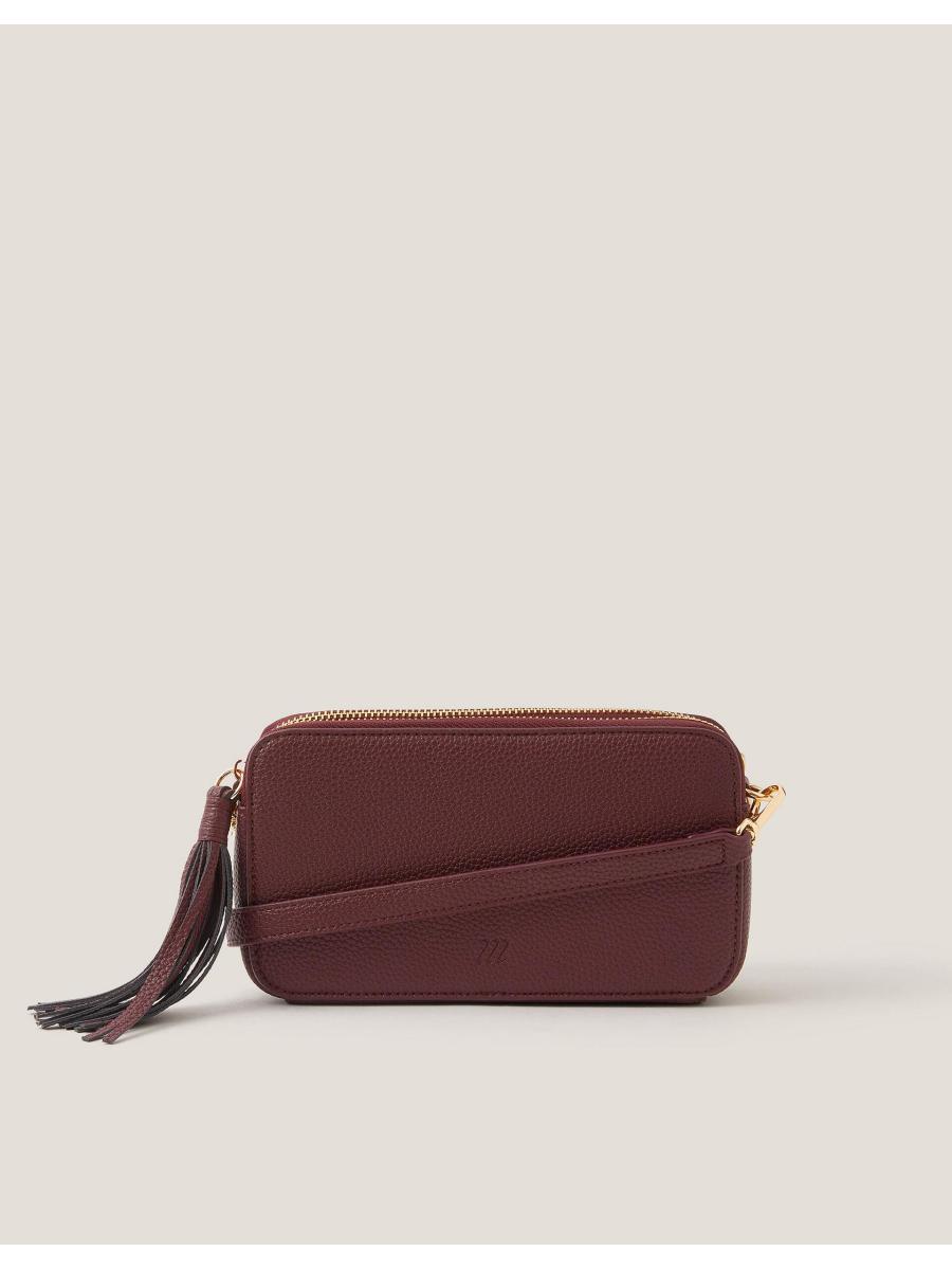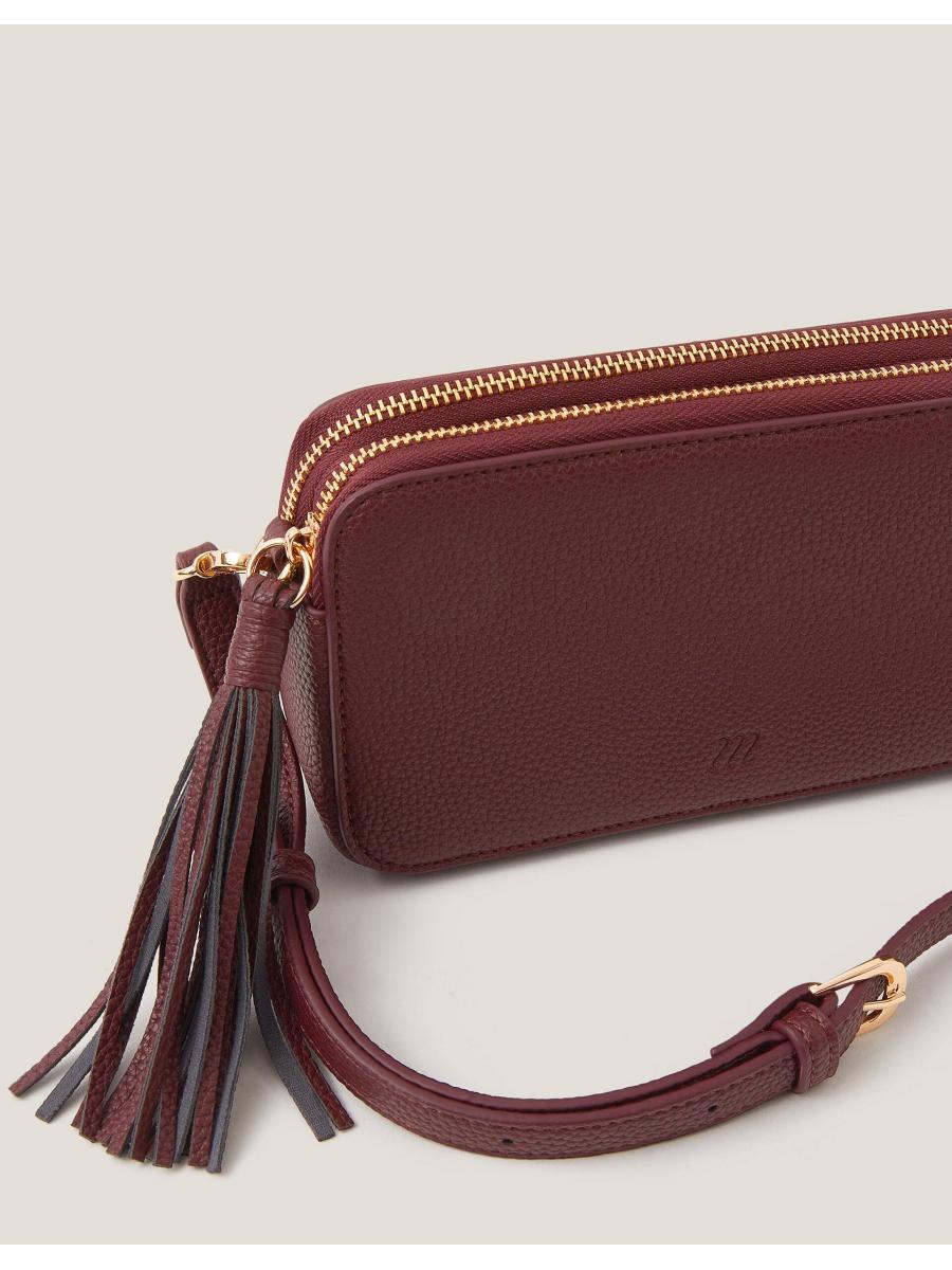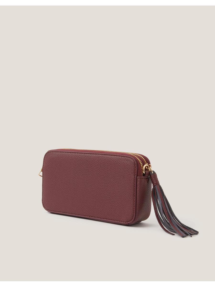 Classic companion. Designed in faux leather with a rectangular profile, this bag features two main zip compartment, so staying organised is effortless. Finished with an adjustable crossbody strap and matching tassel charm.