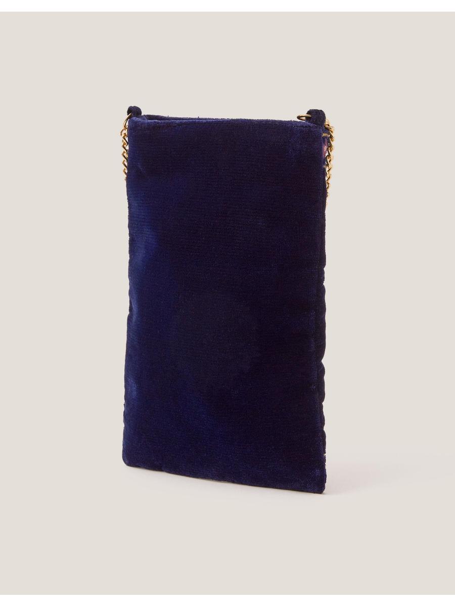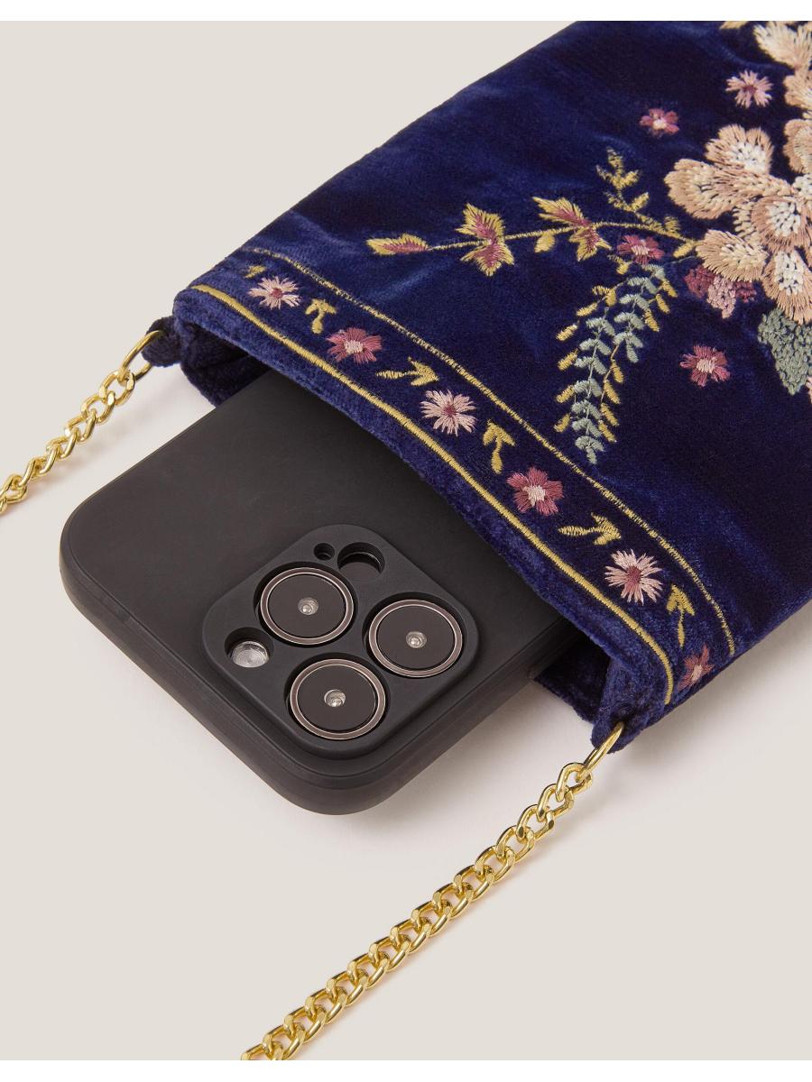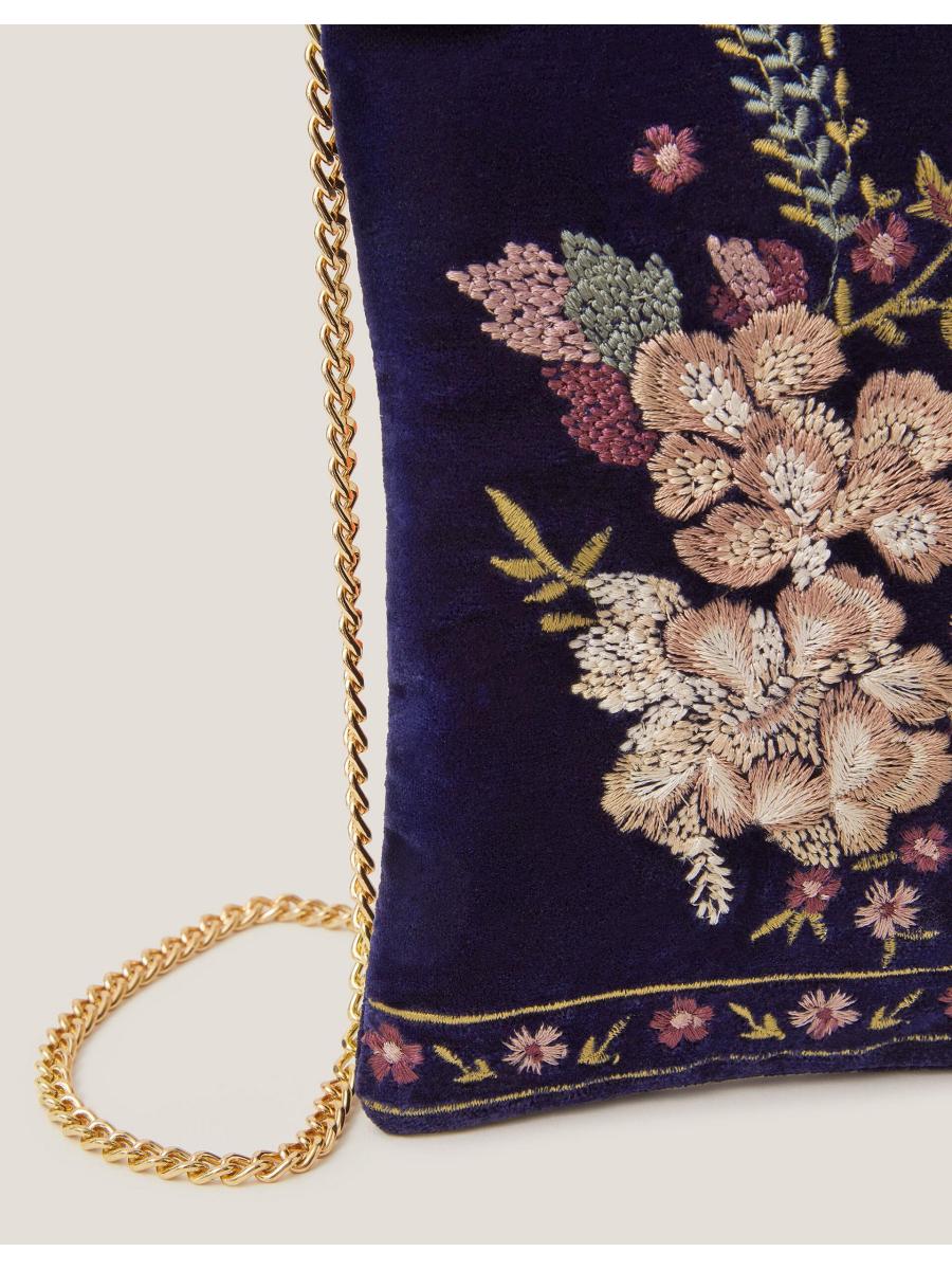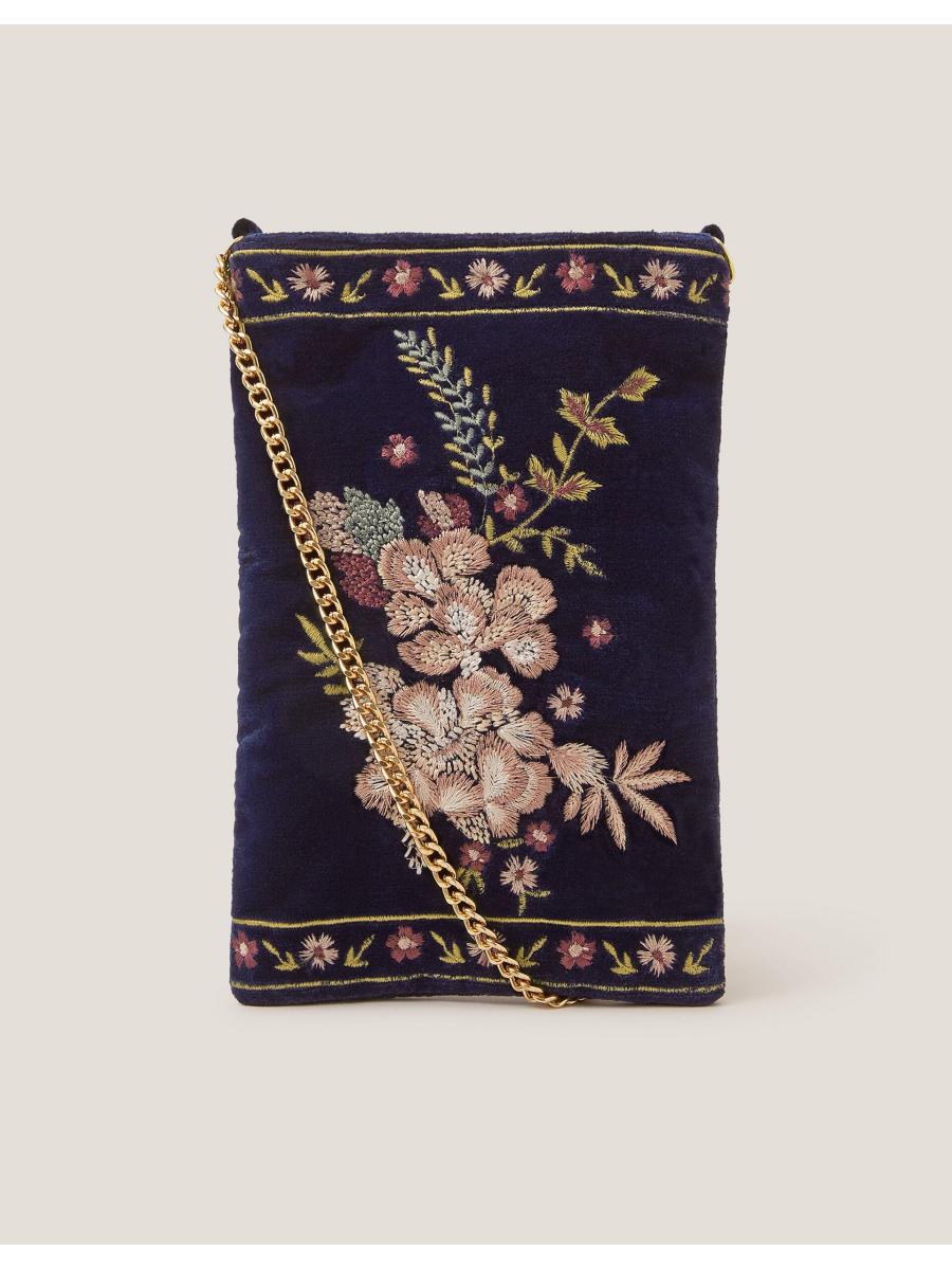 One of life’s smallest luxuries. Blooming with boho charm, this bag is perfectly-sized to slot in your phone. Designed in luxe velvet, it's decorated with ornate floral embroidery. Finished with a long gold-tone chain strap for swinging off the shoulder or styling across the body.