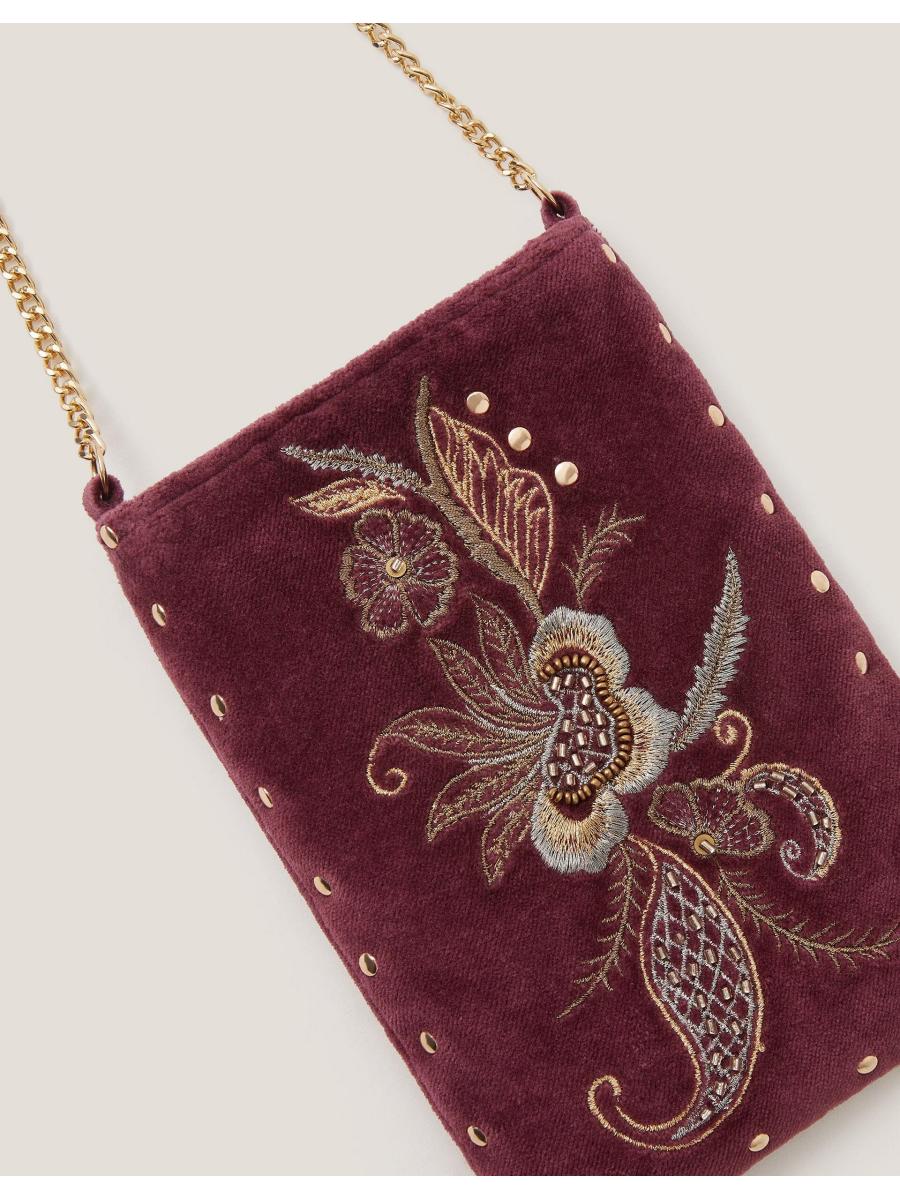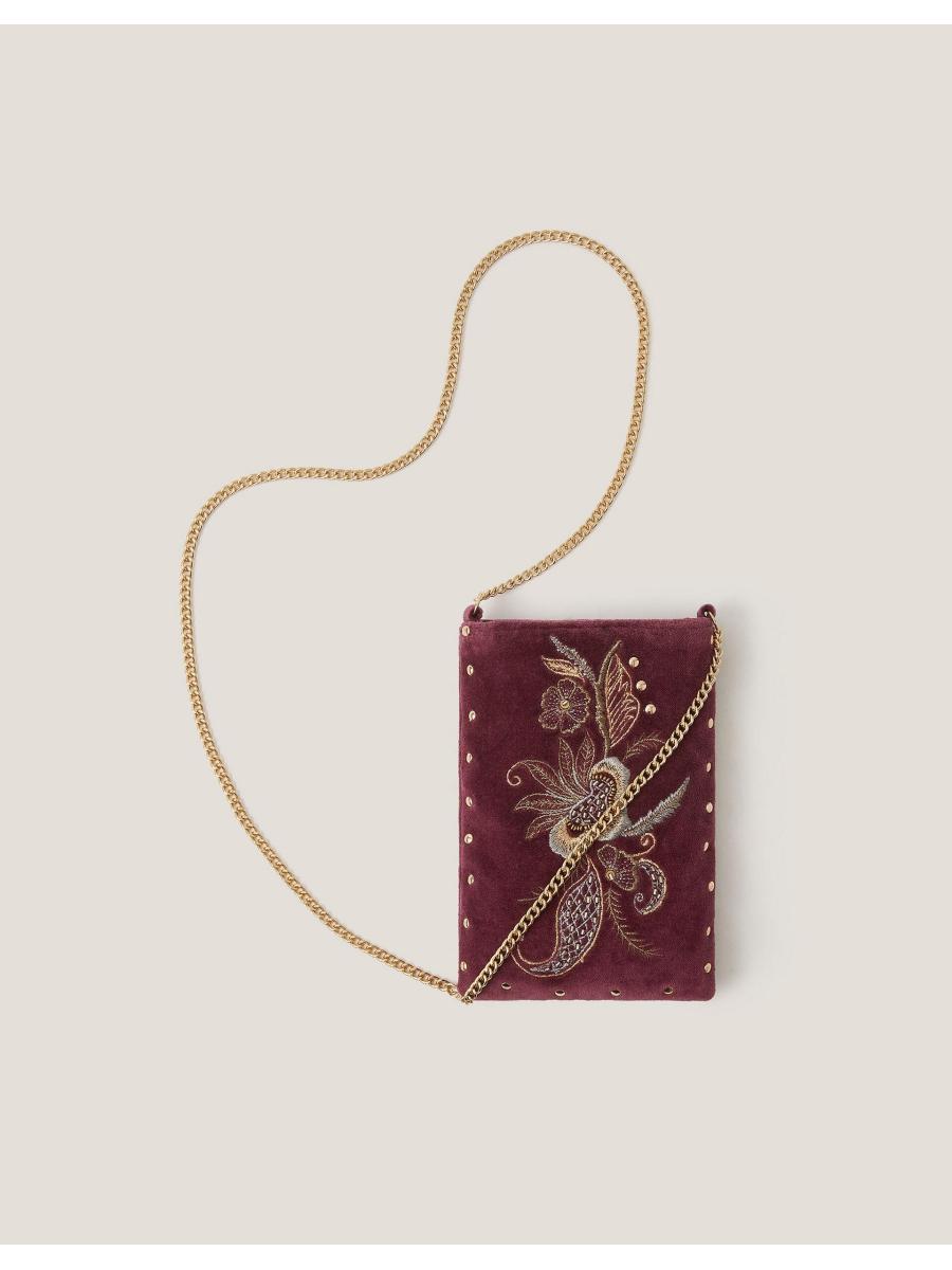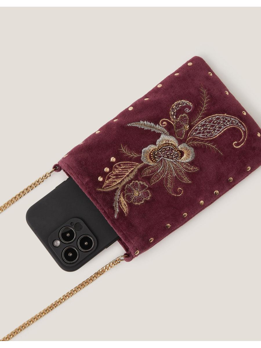 Hold me closer. A little Western, a little boho, this bag is perfectly-sized to slot in your phone. Decorated with ornate florals, shimmery beads and gold-tone studs, it's finished with a long chain strap to style across the body.