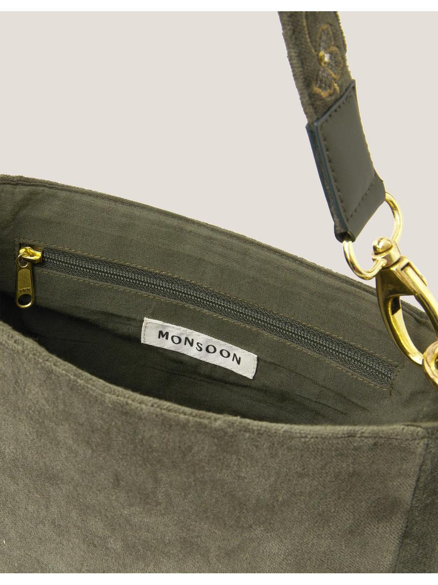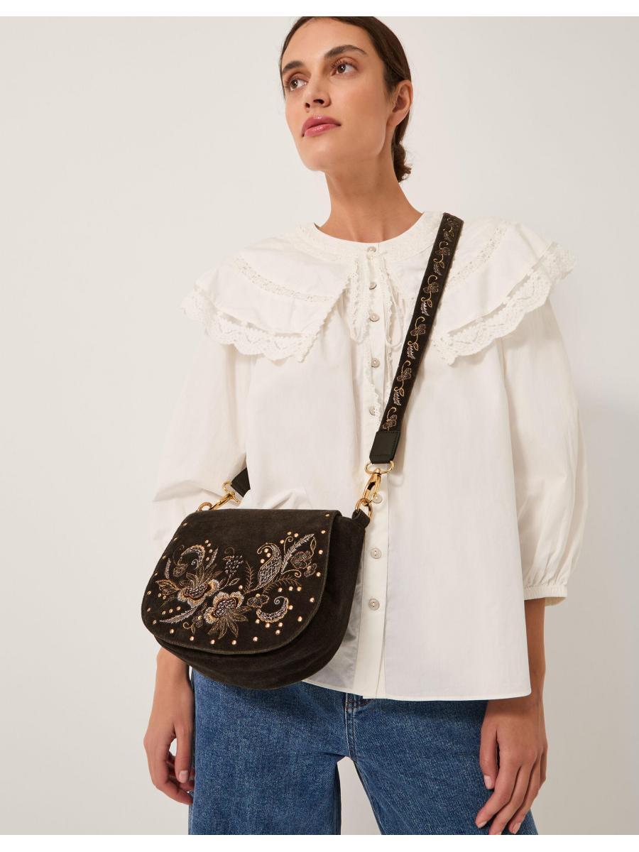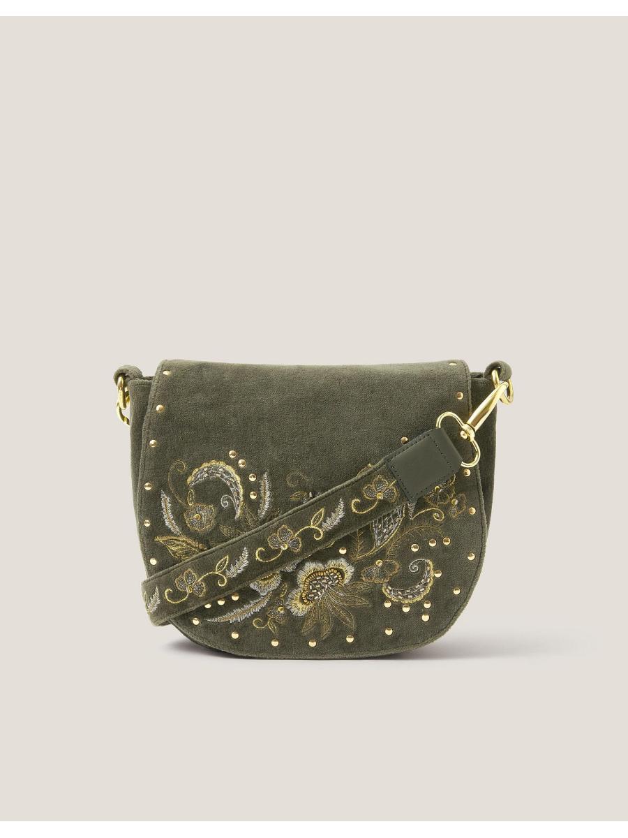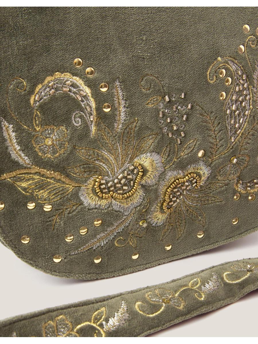 Not our first fashion rodeo. A little Western, a little boho, this bag is inspired by a satchel with a horseshoe shape and fold-over profile. Decorated with ornate florals, shimmery beads and gold-tone studs, it's finished with an adjustable strap to style across the body. Green