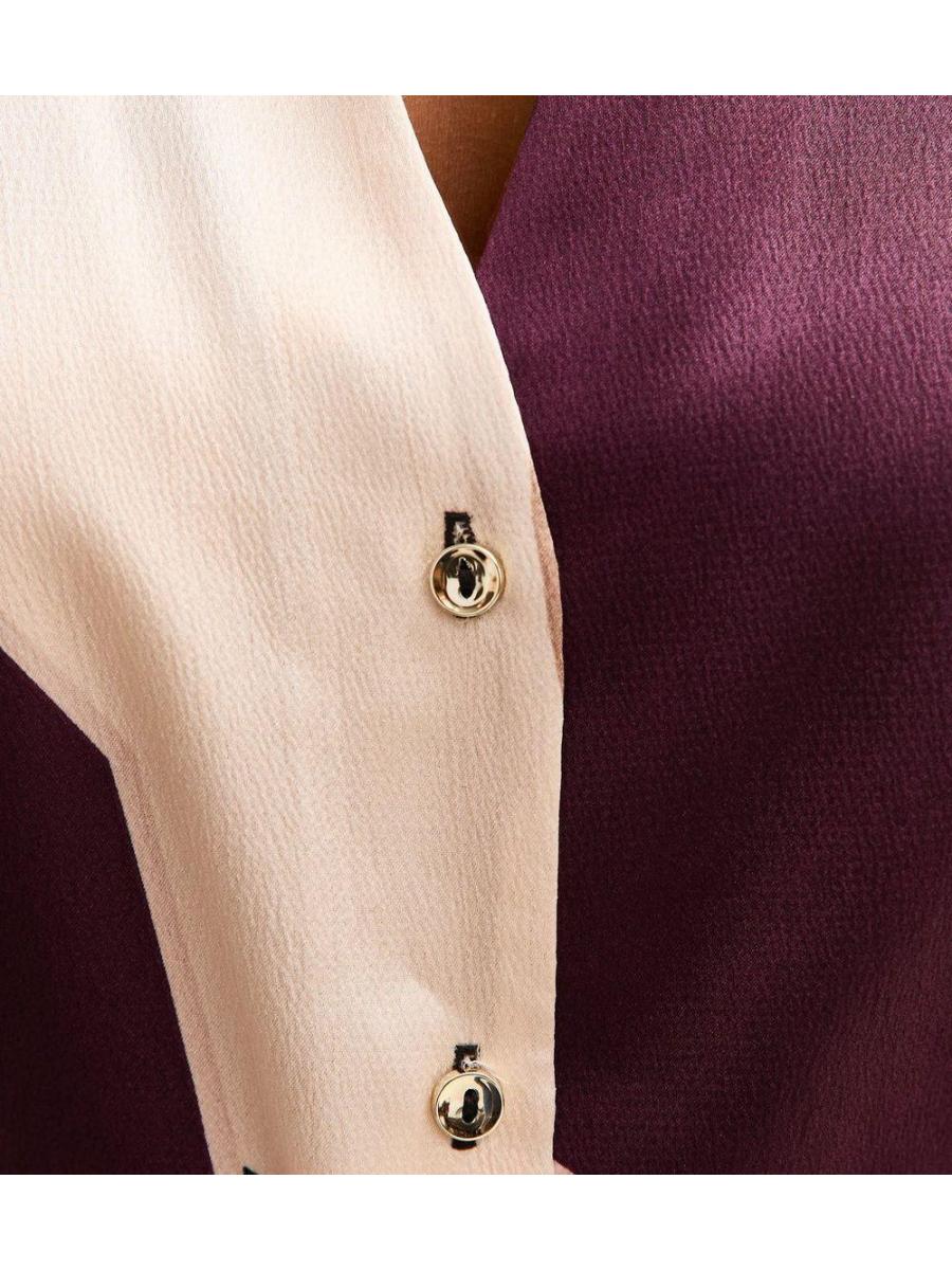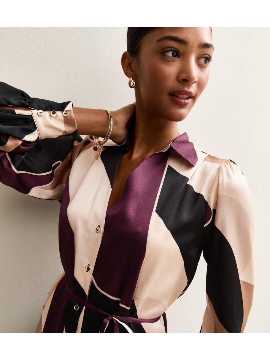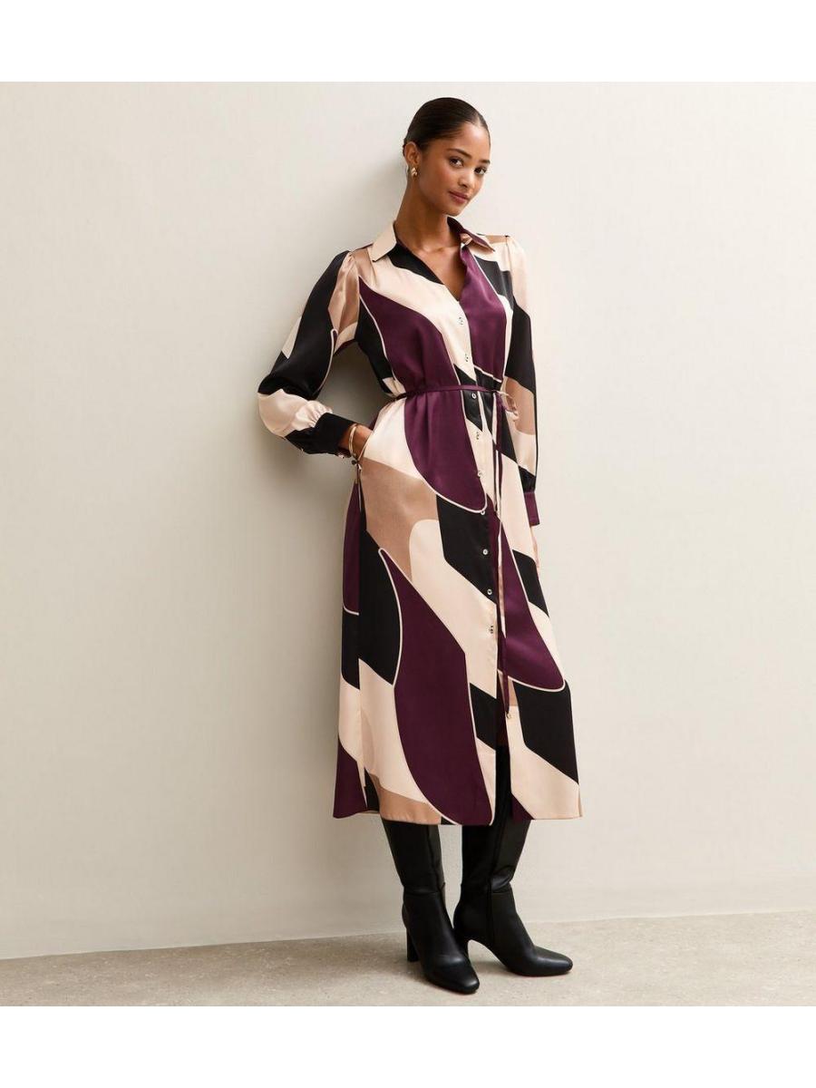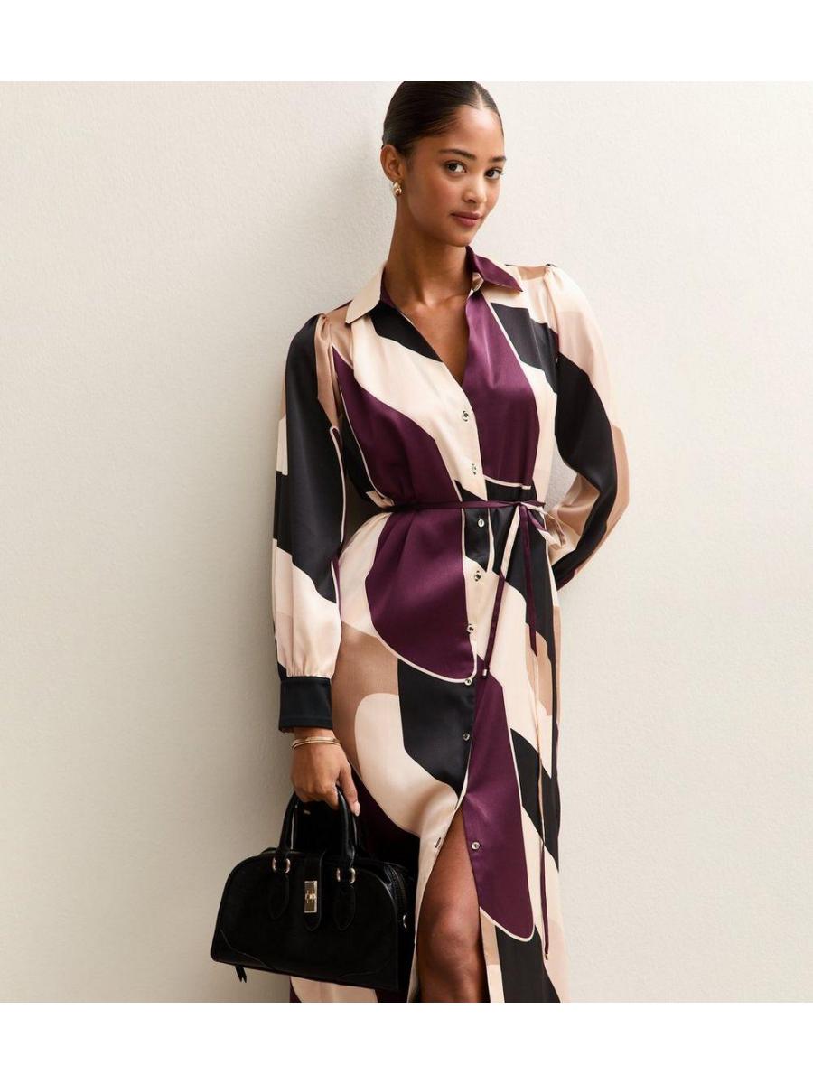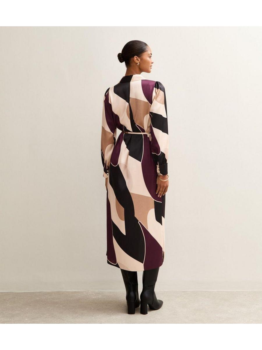 Brown Geometric Print Satin Tie Waist Shirt Dress