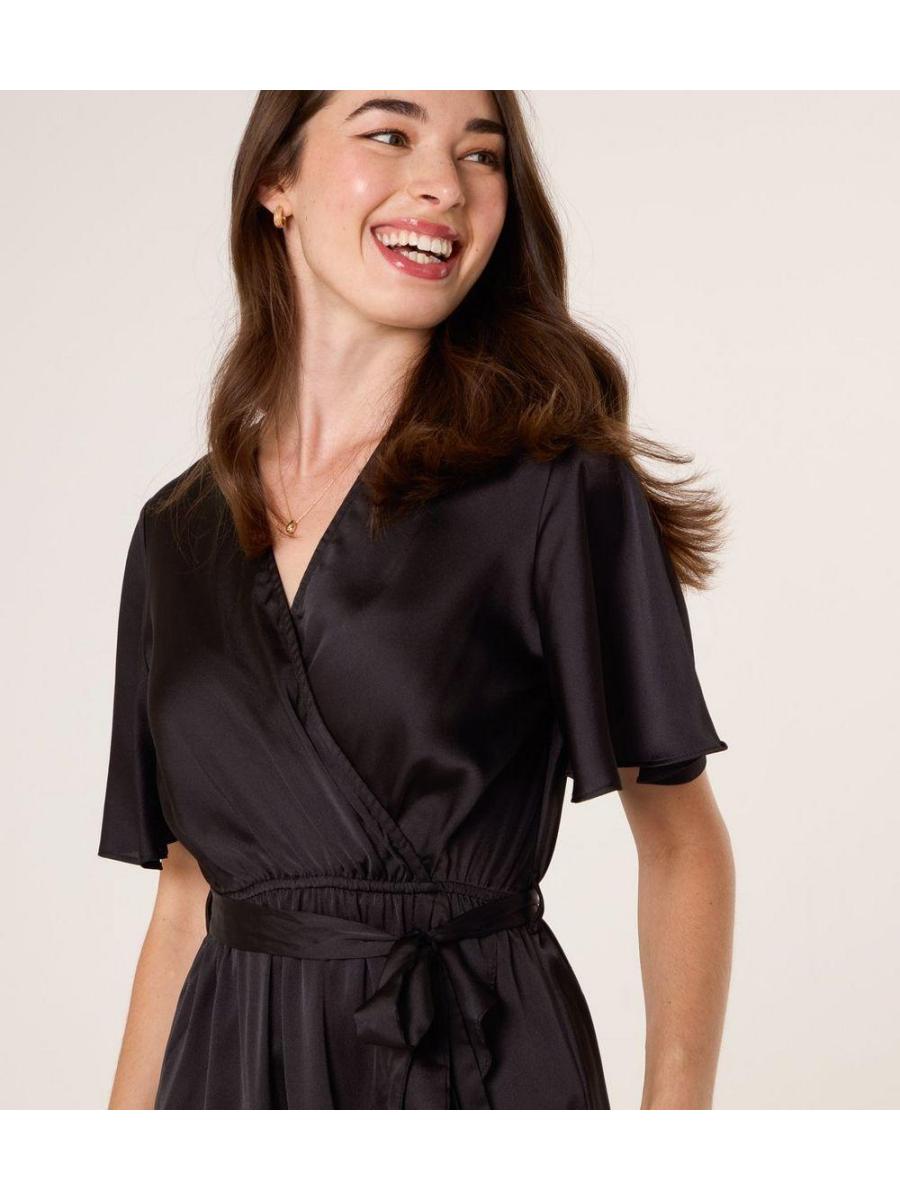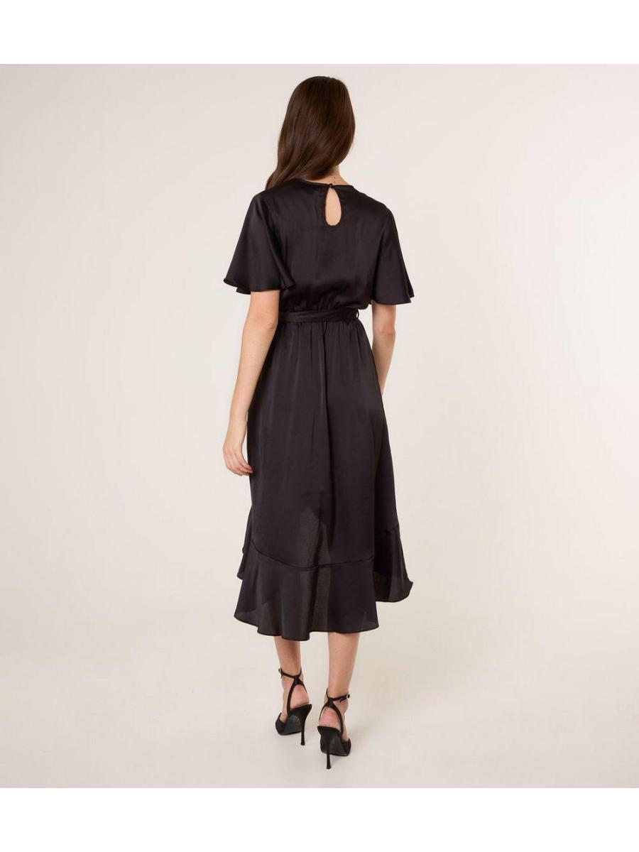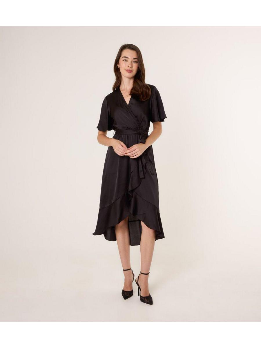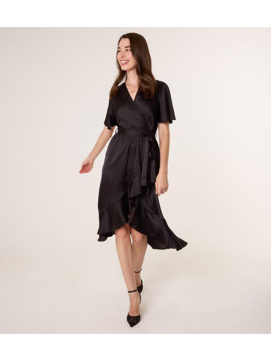 Blue Vanilla Black Satin Frilly Trim Wrap Midi Dress