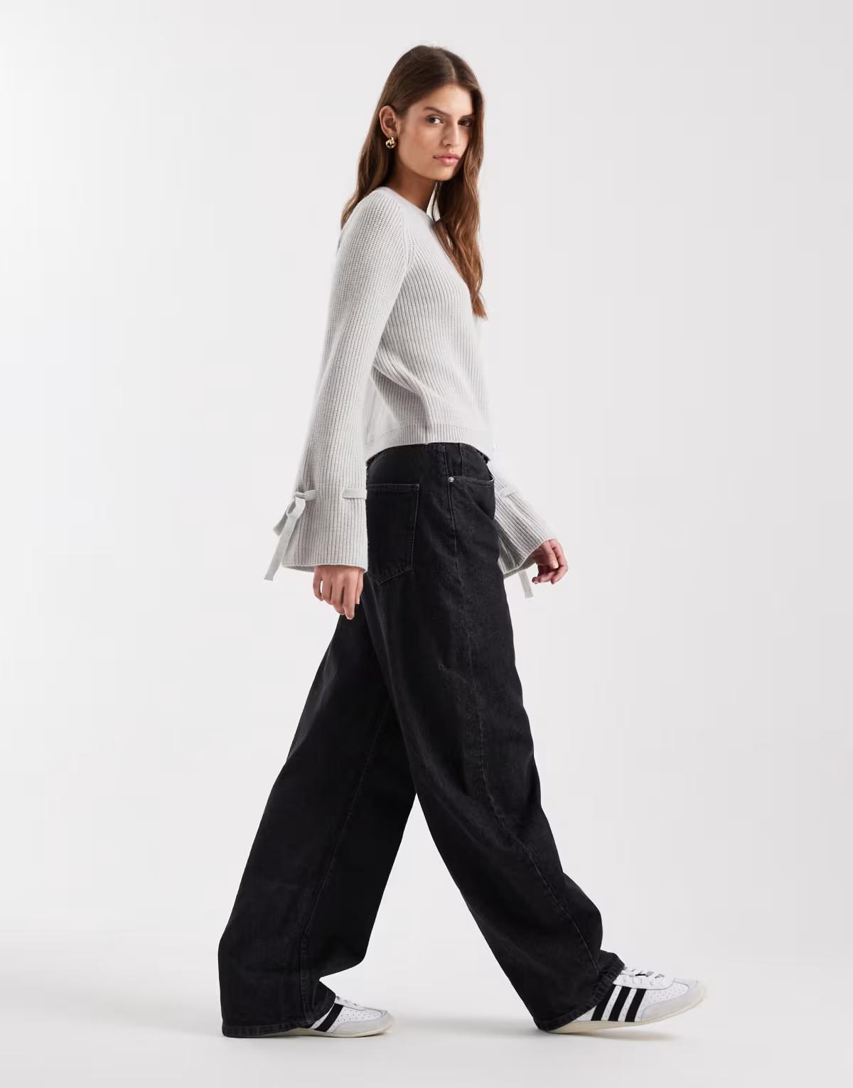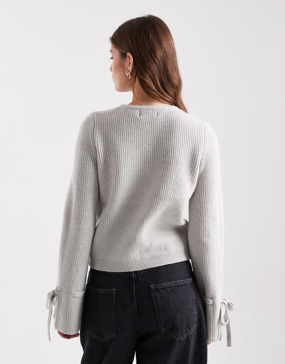 Pieces knitted cardigan with pearl buttons and bow tie cuffs in light grey melange