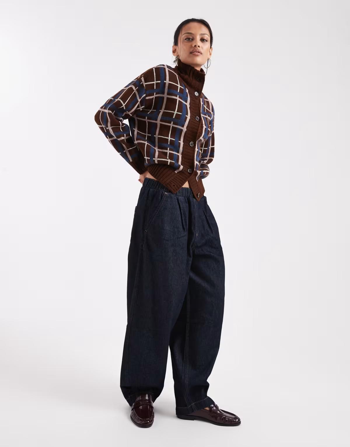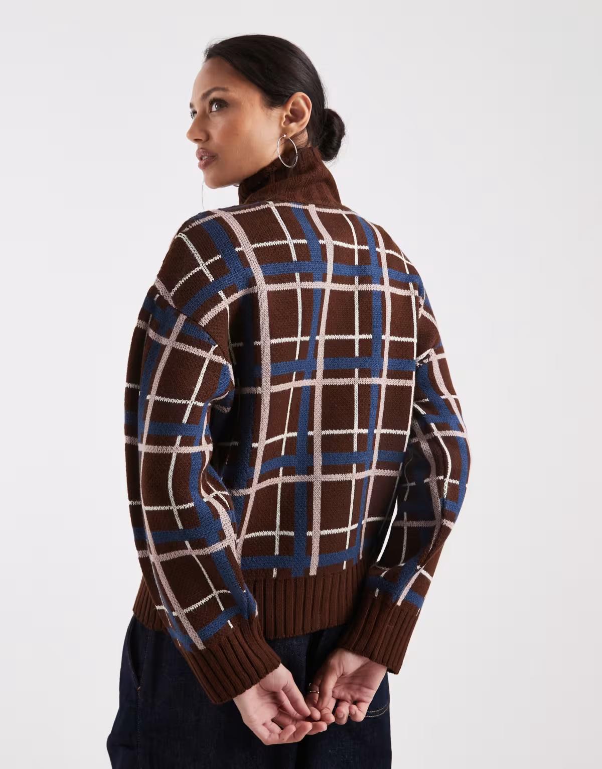 COLLUSION funnel neck check button down jumper in brown