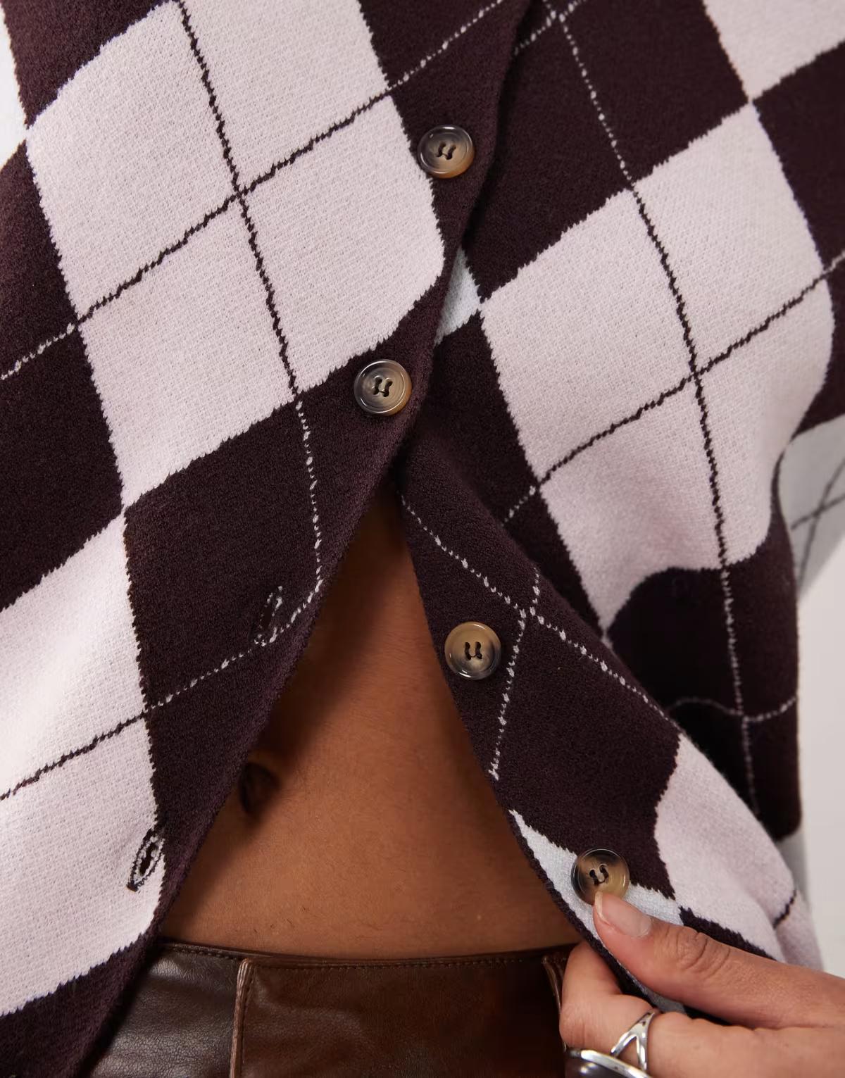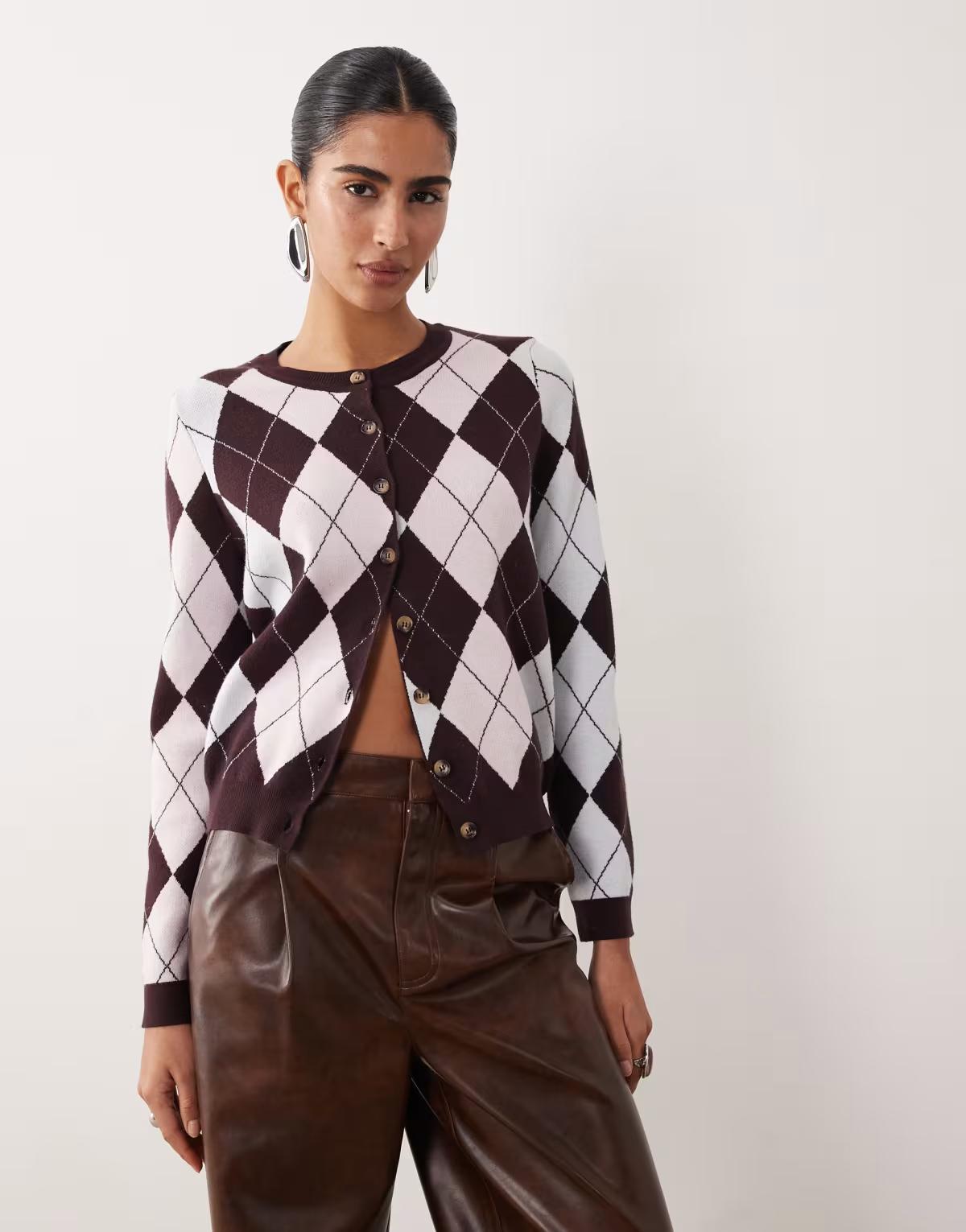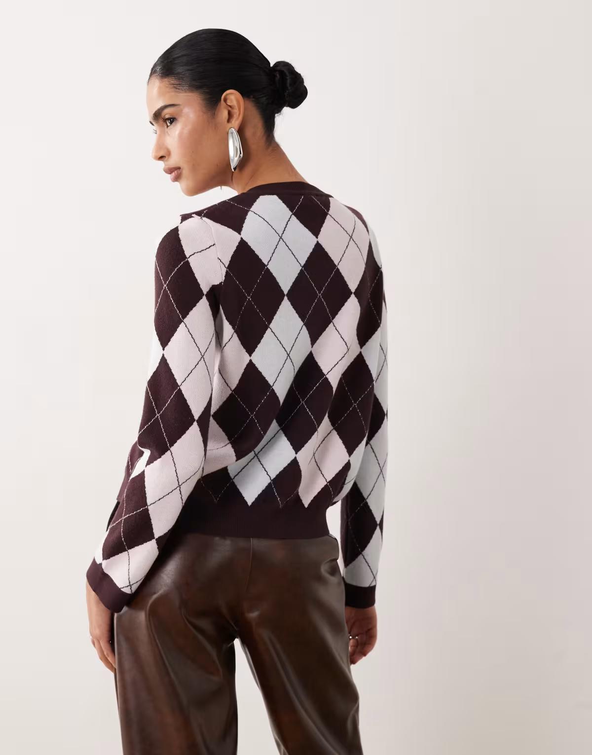 Nobody's Child fine knit cardigan in burgundy argyle check