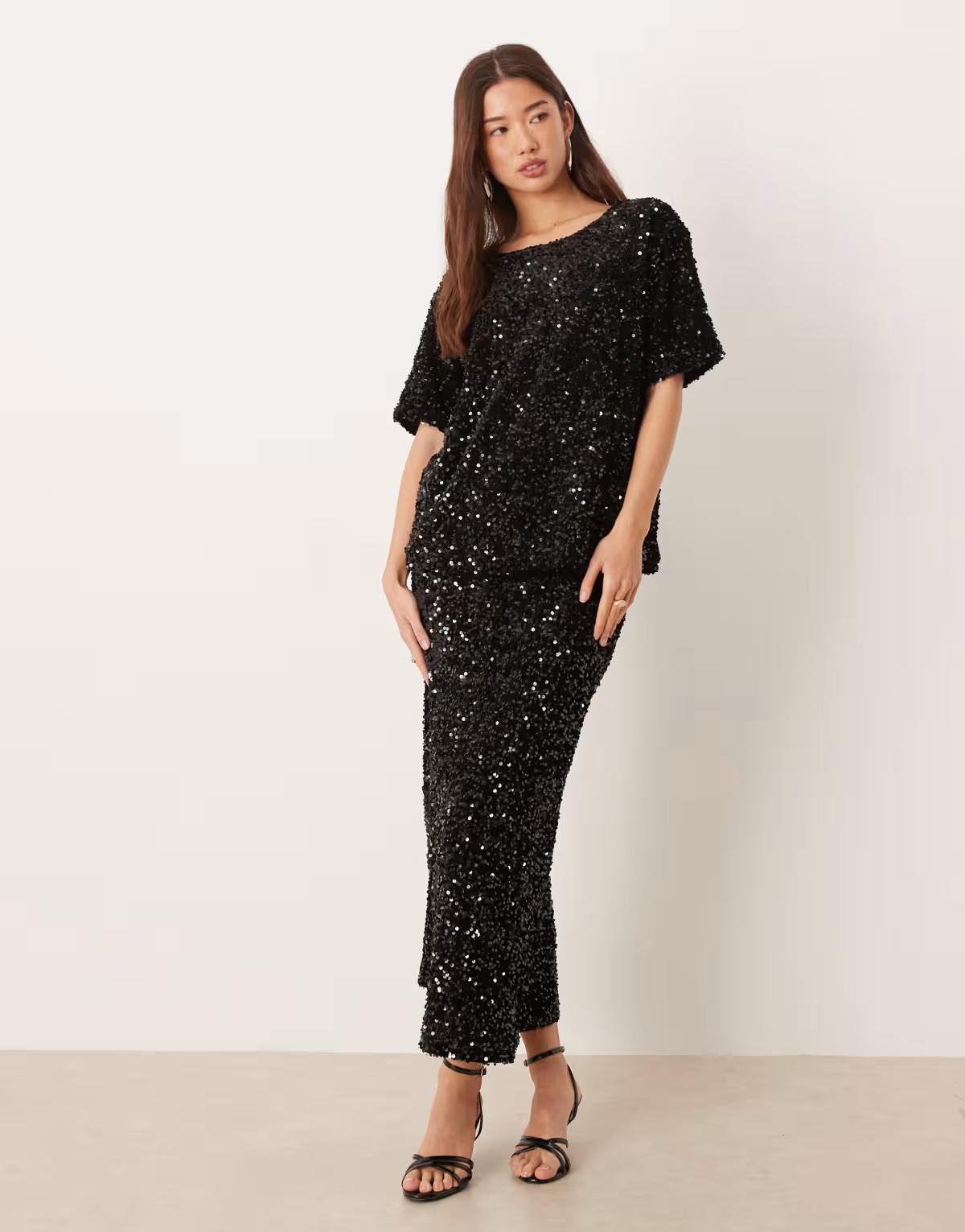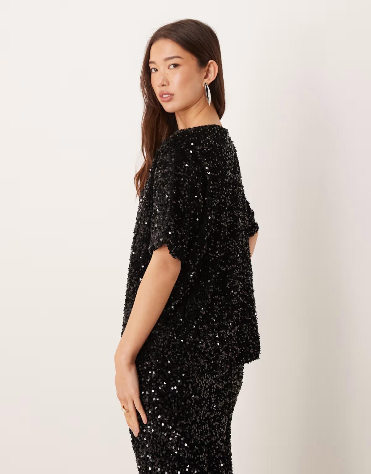 Vila sequin & velour t-shirt co-ord in black